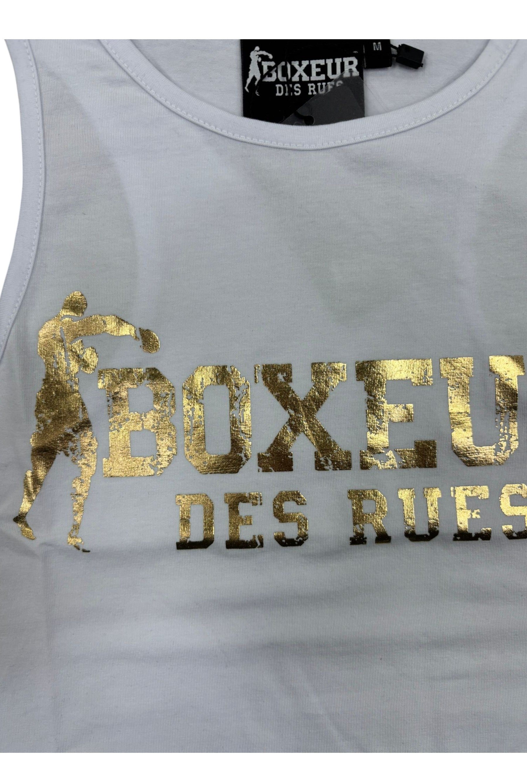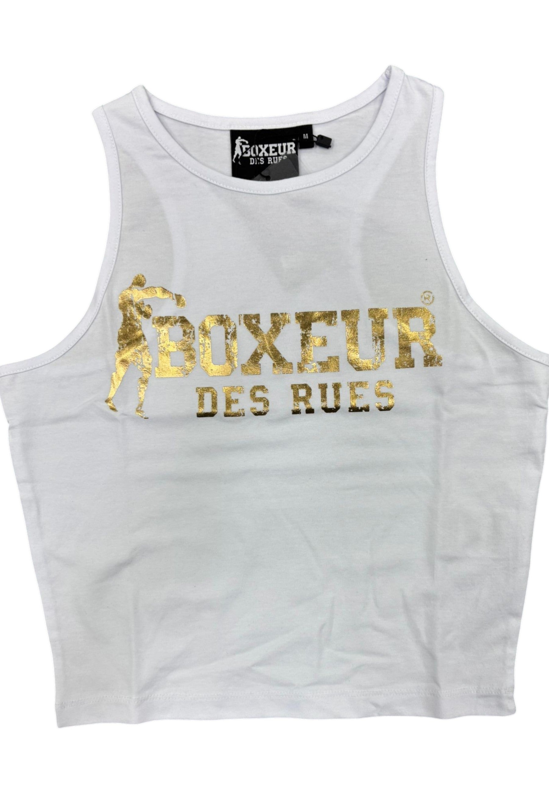 Crop Top bianco di Boxeur Des Rues, un capo che unisce comfort e uno spirito audace. Questo top presenta l'iconico logo "boxeur Des Rues" in un accattivante colore oro, che aggiunge un tocco di grinta inconfondibile. è il capo ideale per sentirsi alla moda in ogni situazione.