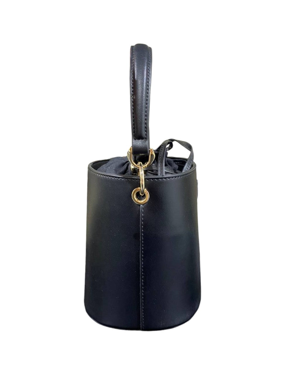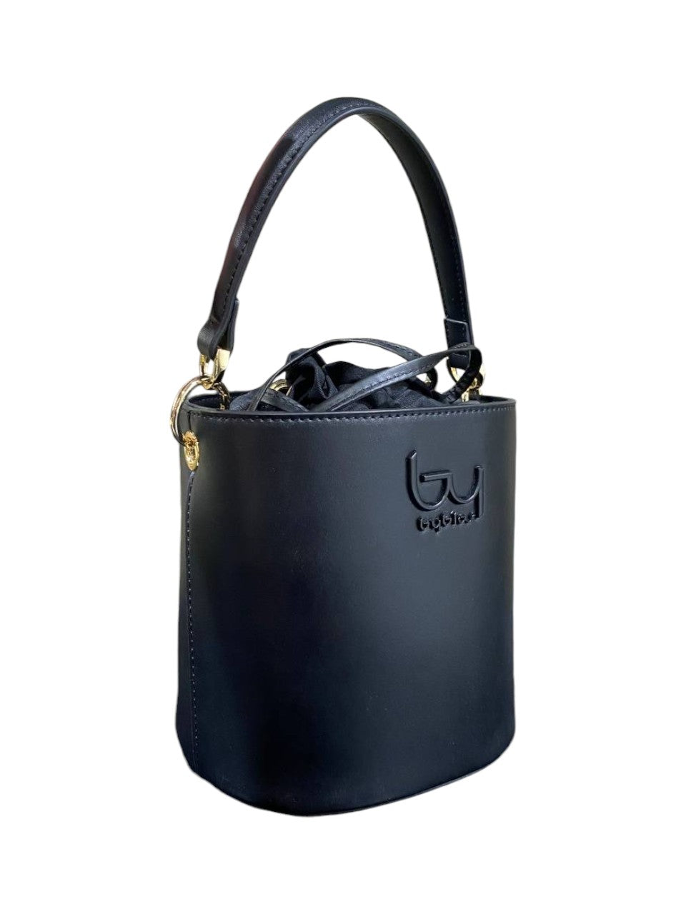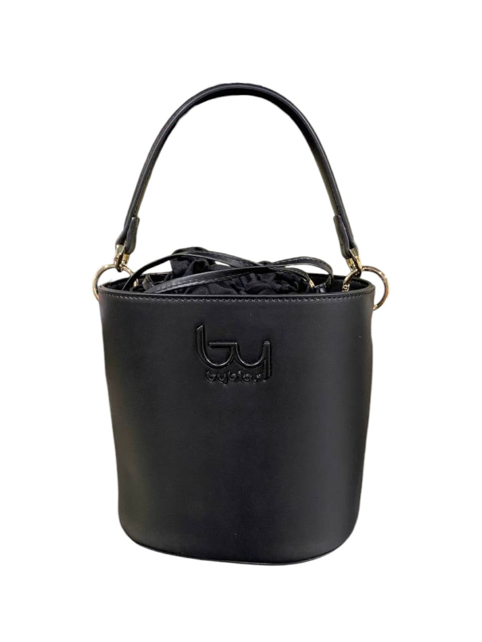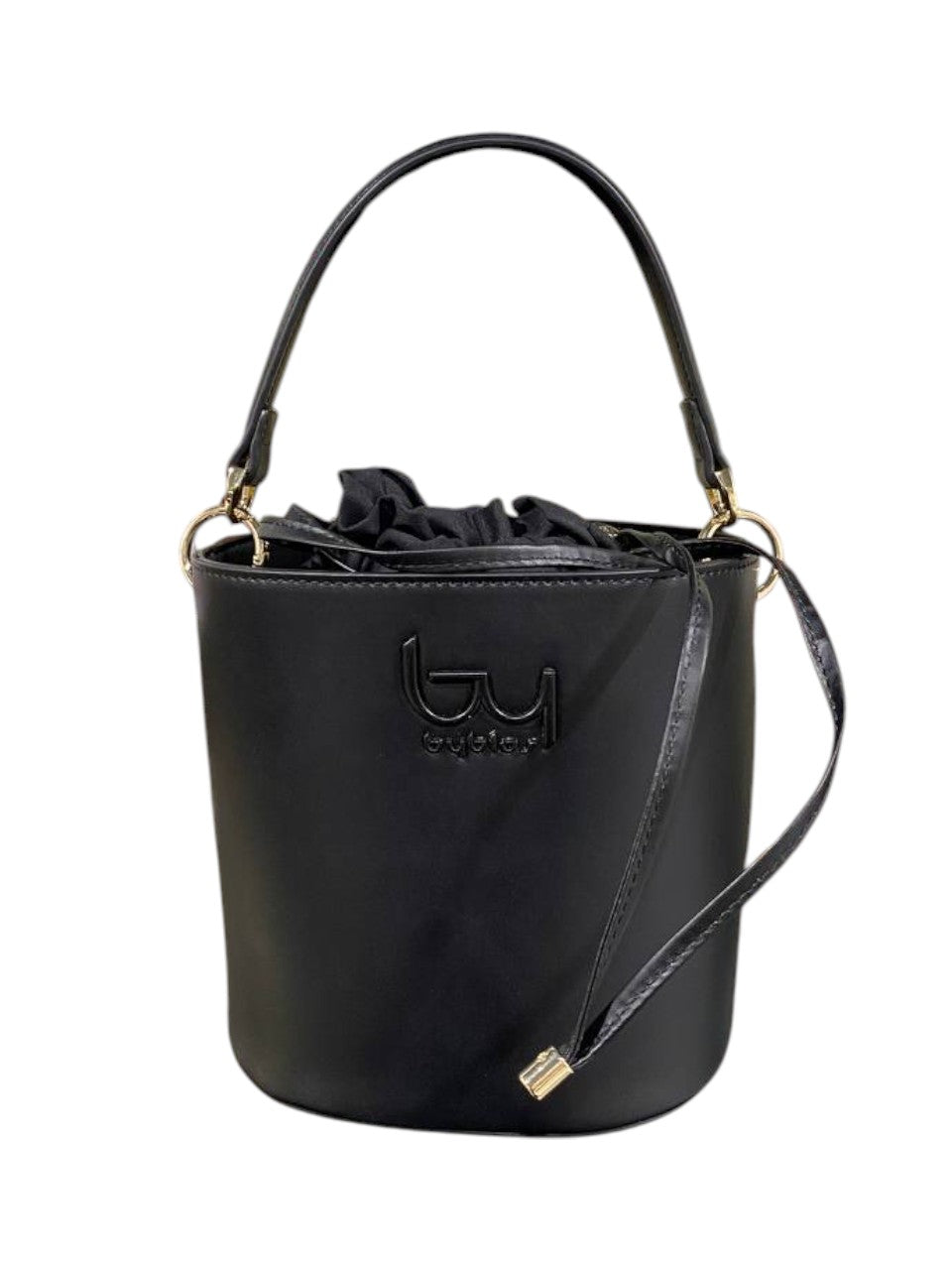 Borsa Byblos in ecopelle a cestello con chiusura a sacco, manico, tracolla rimuovibile scompartimenti interni e logo in metallo posizionato frontalmente.