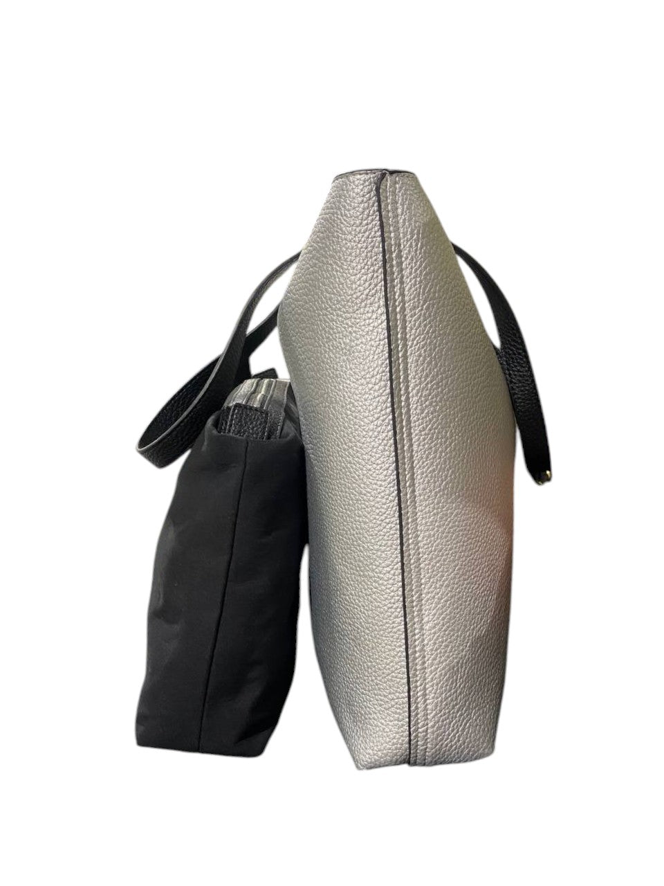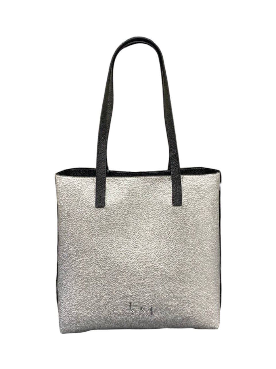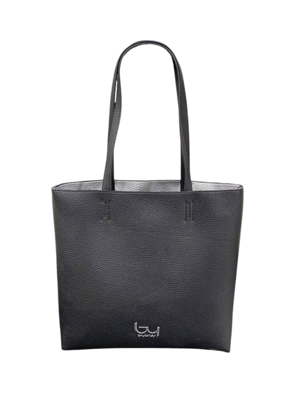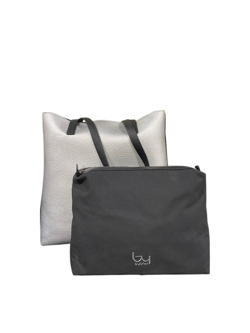 Borsa Doubleface Byblos in ecopelle con manico, coulisse rimuovibile con chiusura a zip e logo in metallo posizionato frontalmente.