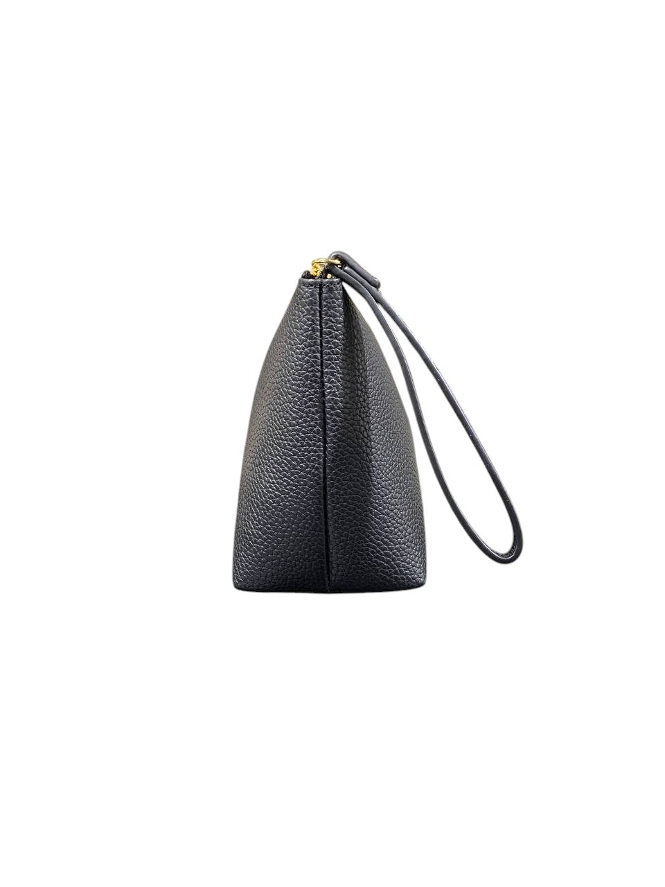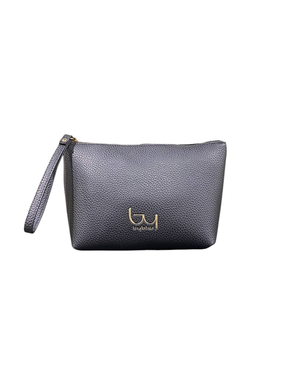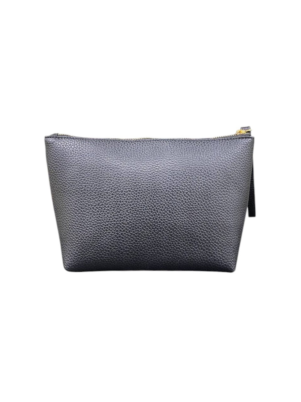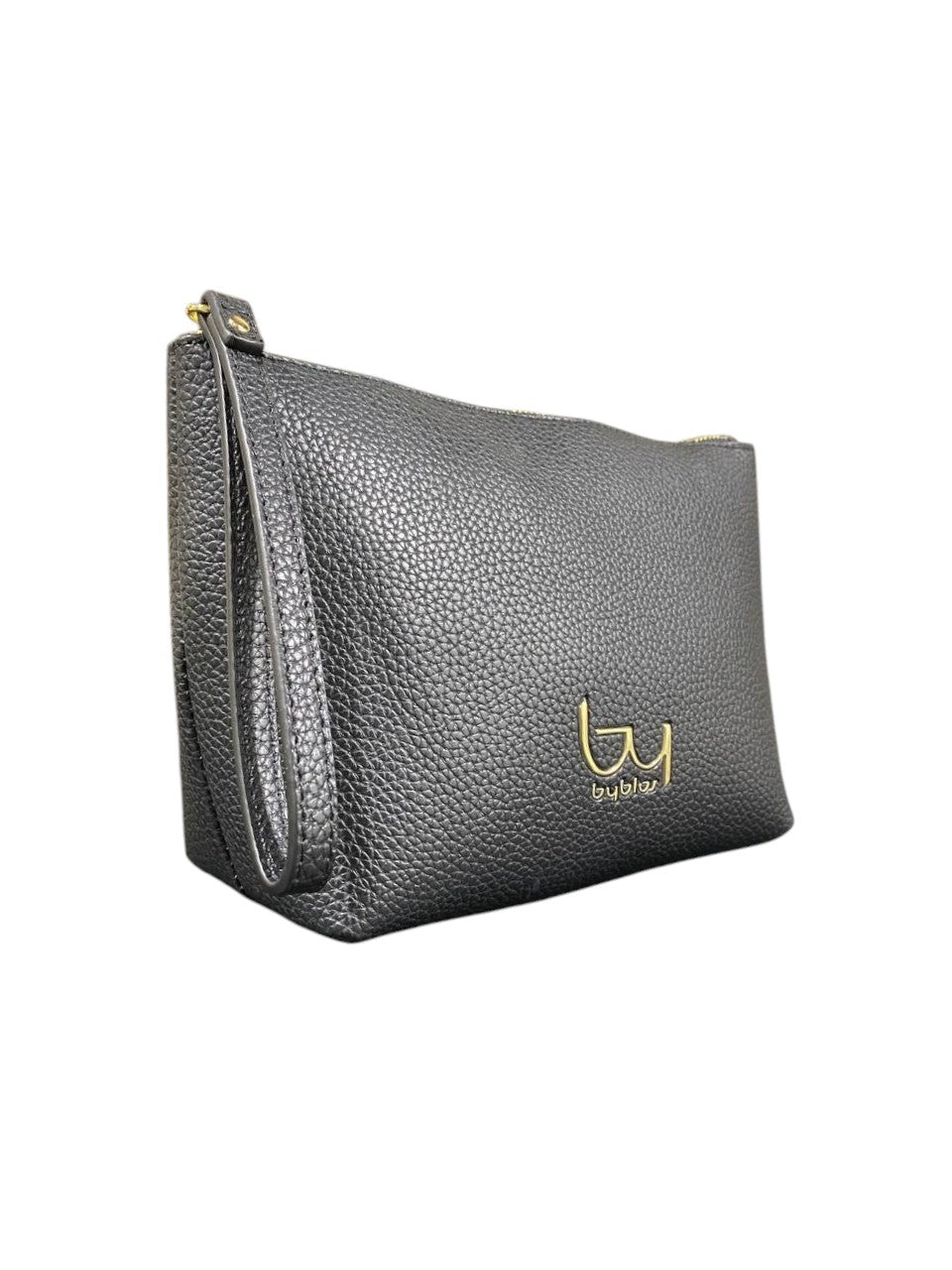Pochette Byblos in ecopelle con chiusura a zip, manico, scompartimenti interni e logo in metallo posizionato frontalmente.