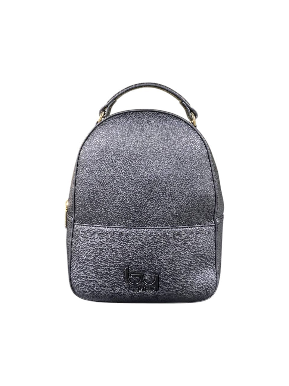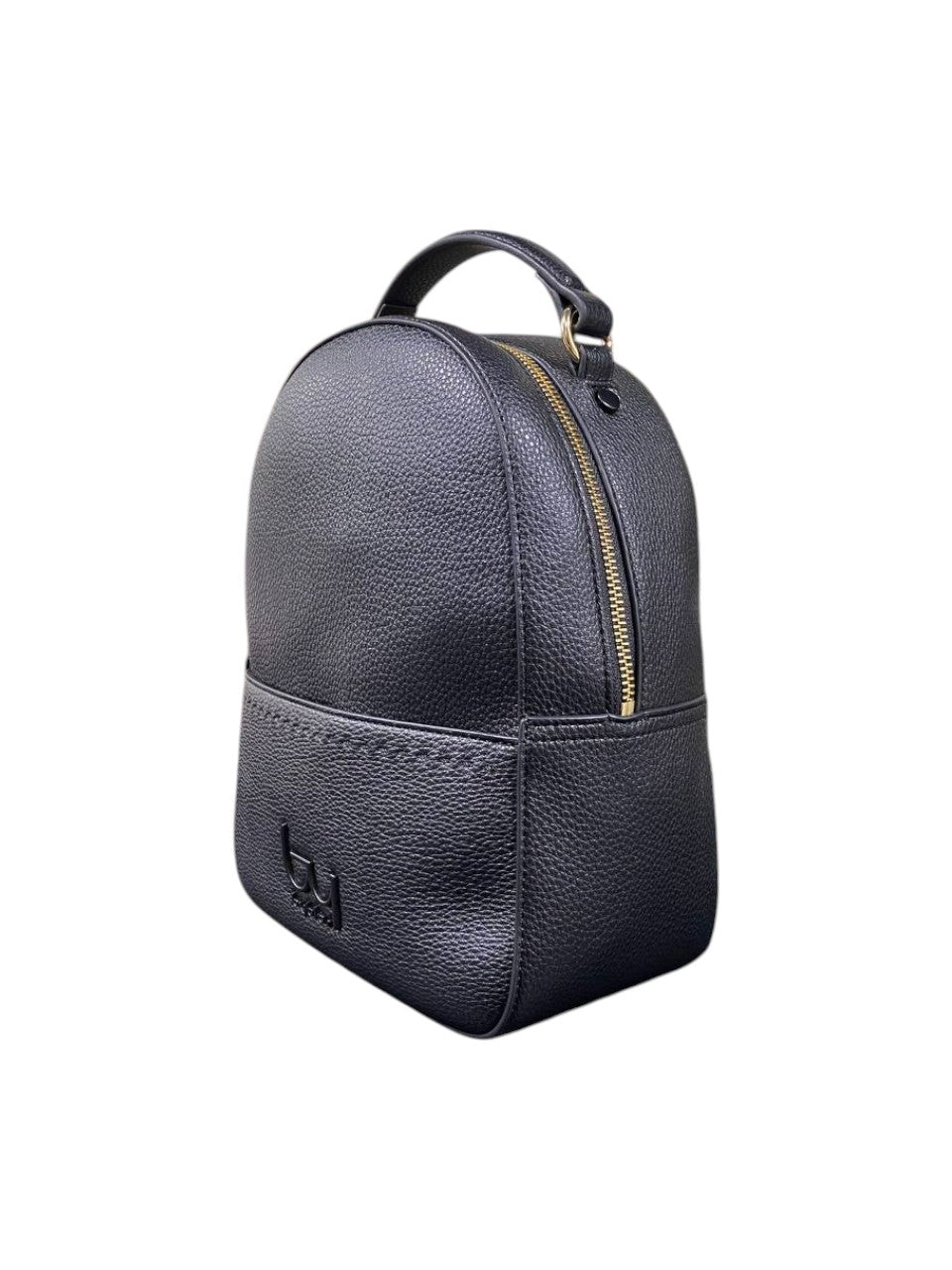 Zaino Byblos in ecopelle con chiusura a zip, tasche laterali, scompartimenti interni ed esterni e logo in metallo posizionato frontalmente.