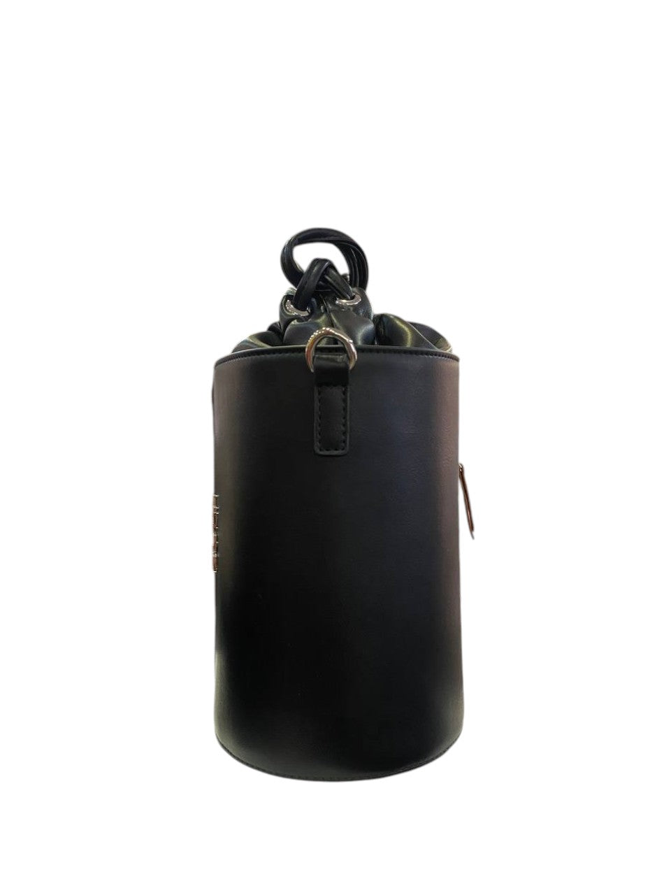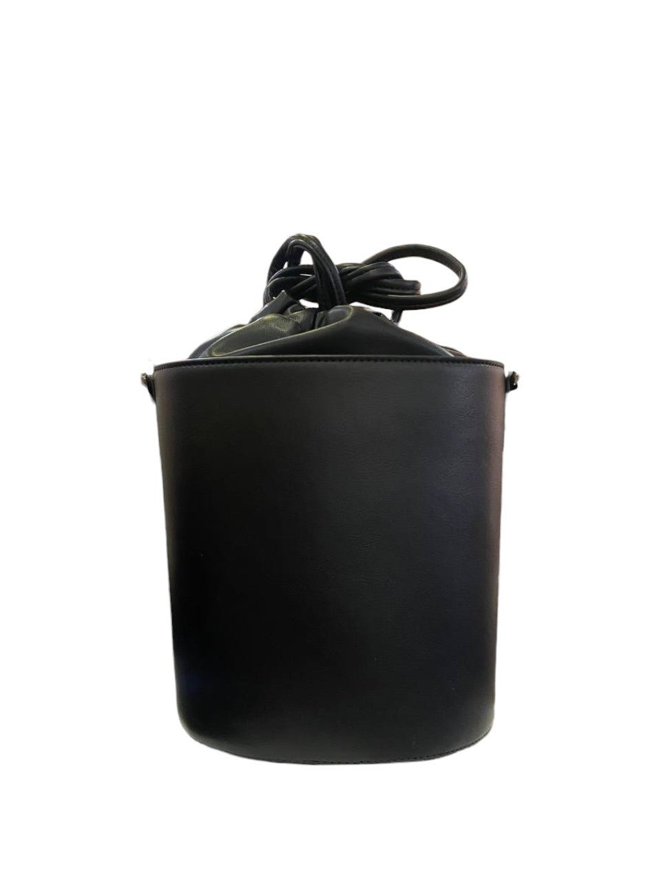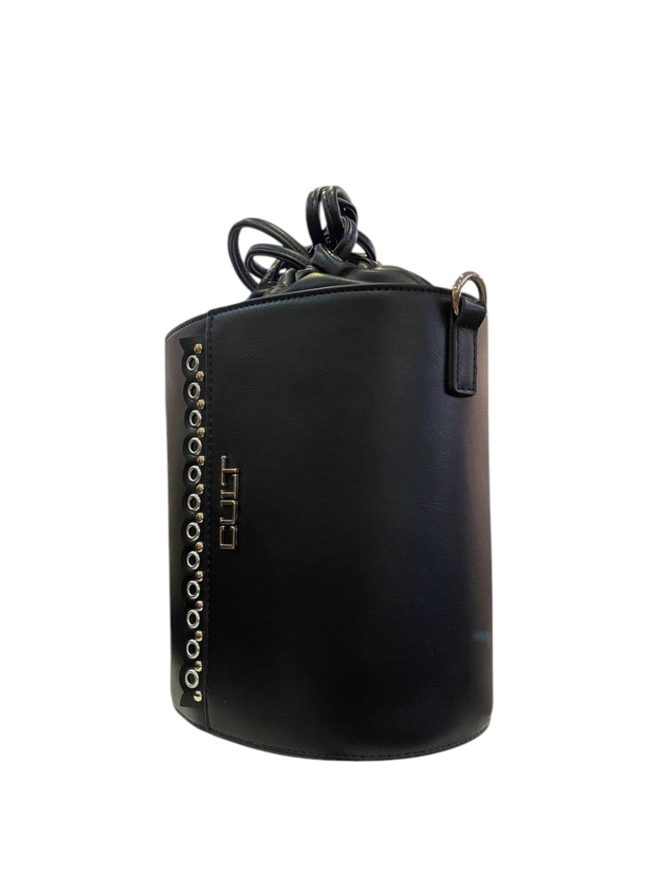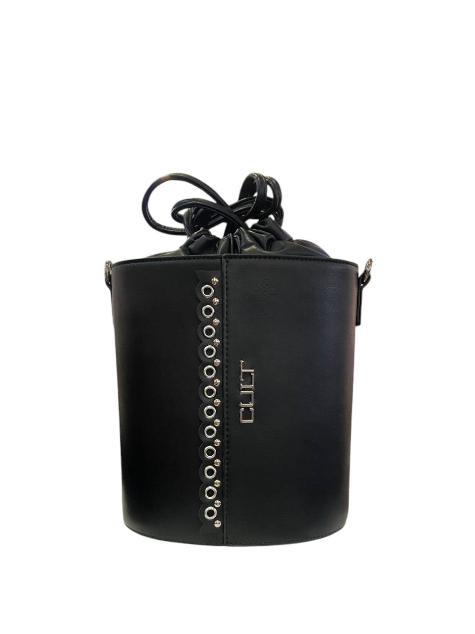 Borsa a secchiello firmata CULT in ecopelle con chiusura a laccio, scompartimenti interni e tracolla rimuovibile.