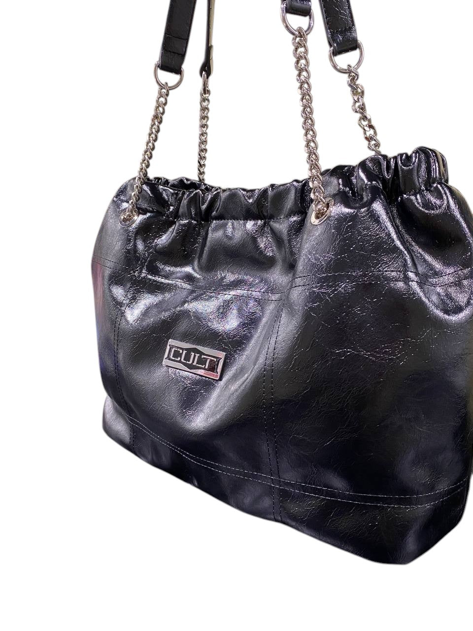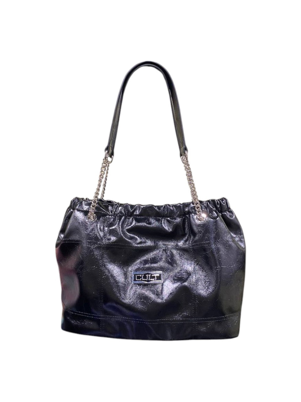 Borsa firmata CULT in ecopelle con chiusura a zip, scompartimenti interni ed esterni e manico in ecopelle e a catena.