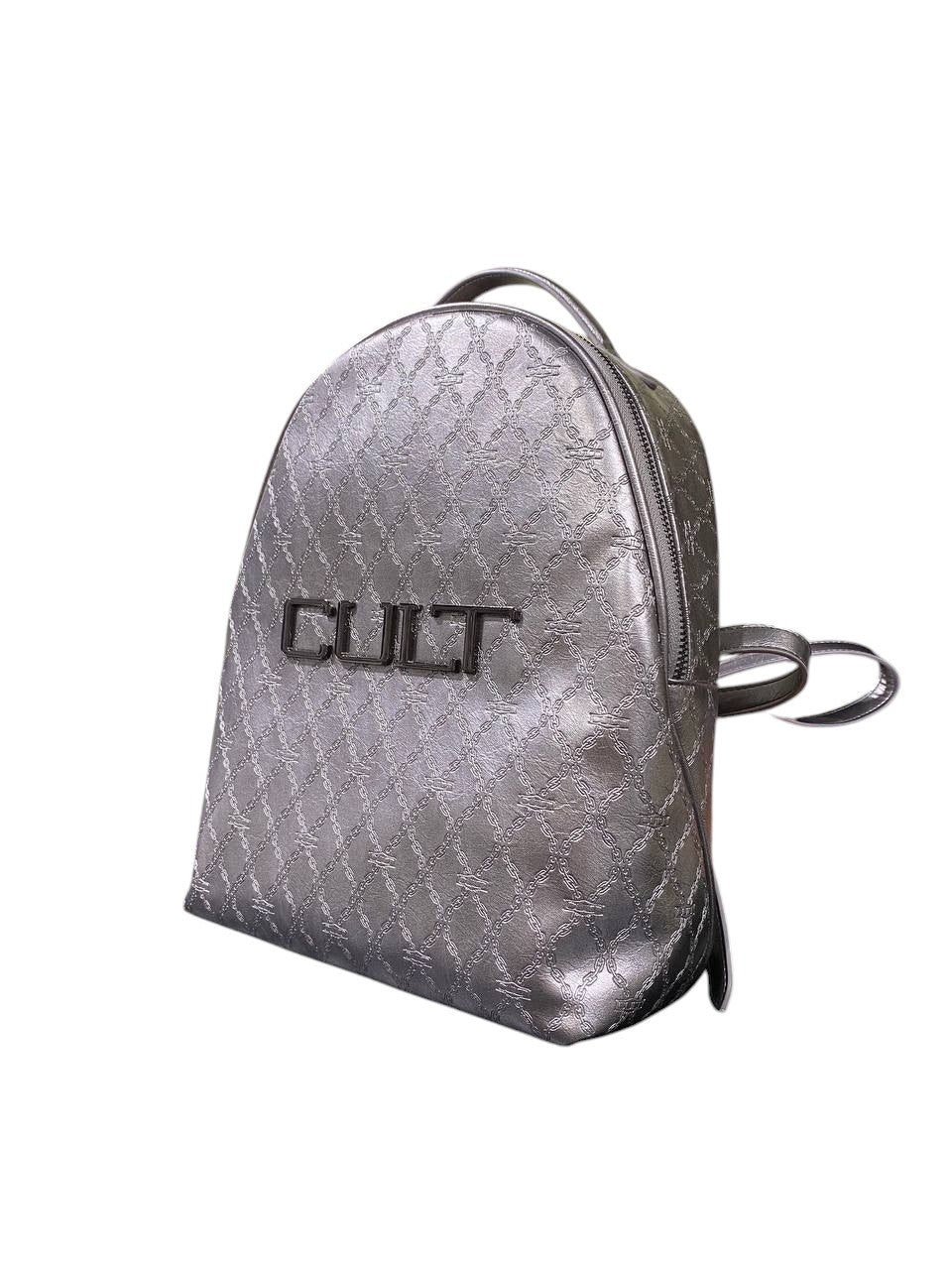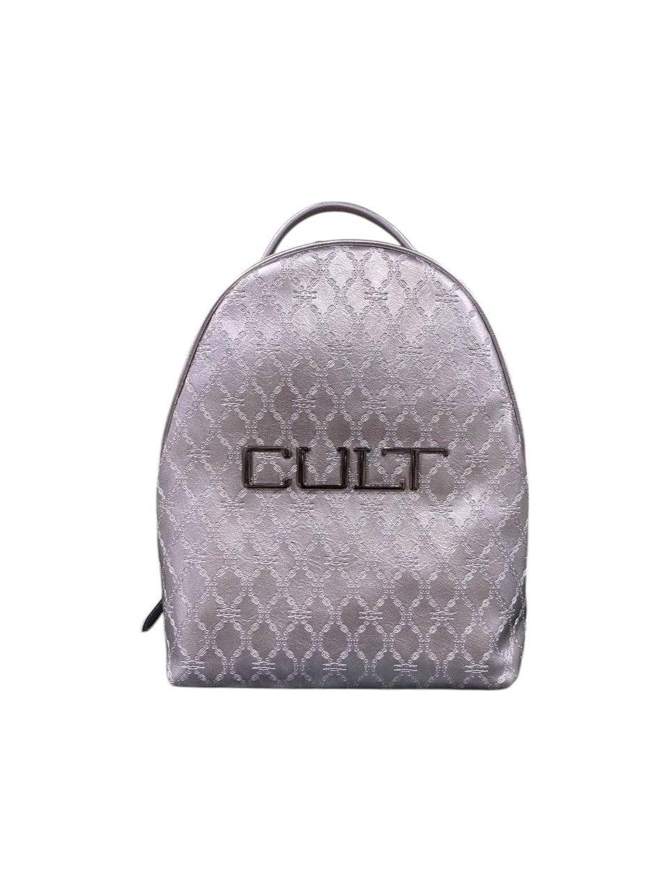Zaino firmato CULT in ecopelle con chiusura a zip, scompartimenti interni, e logo frontale.