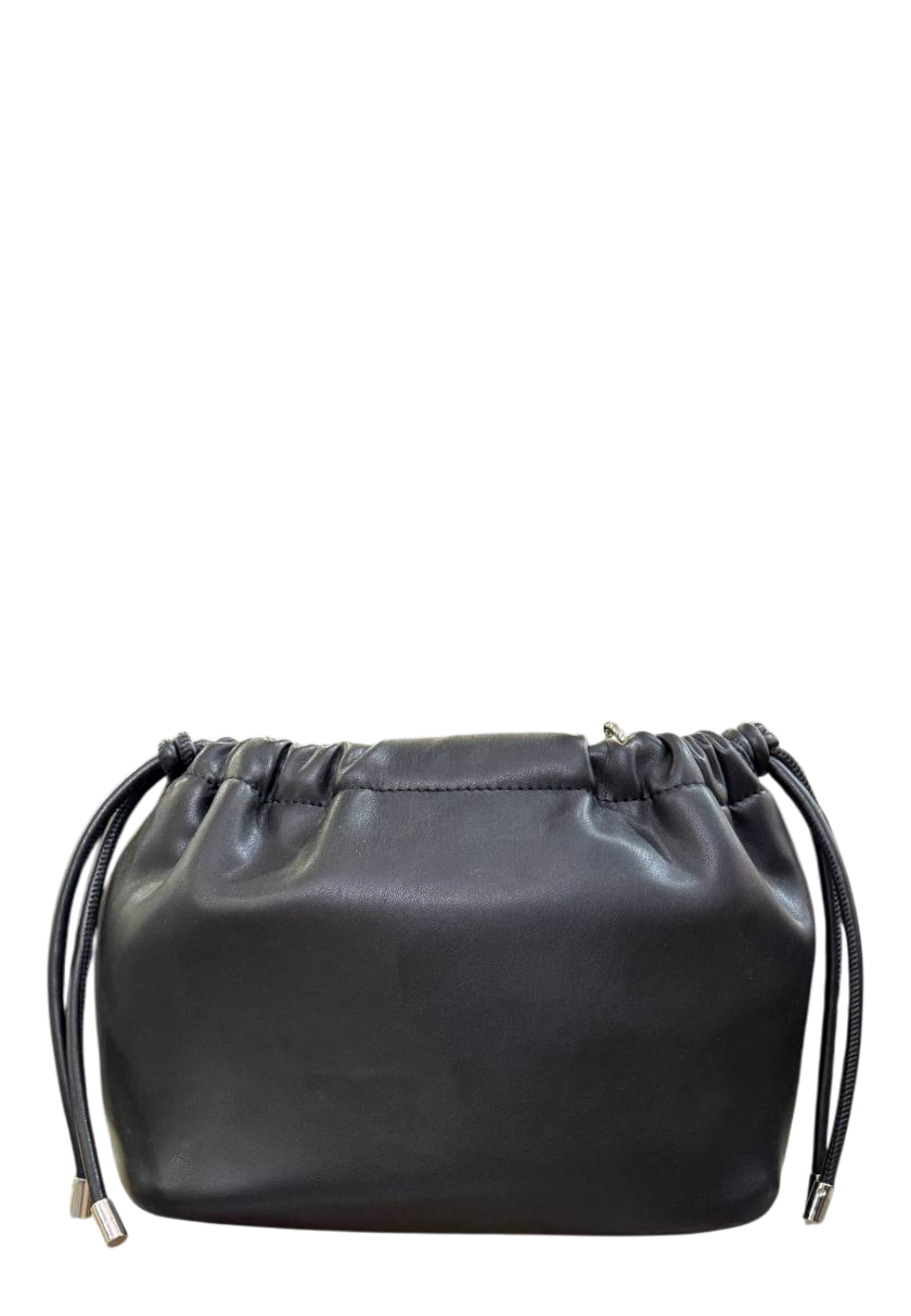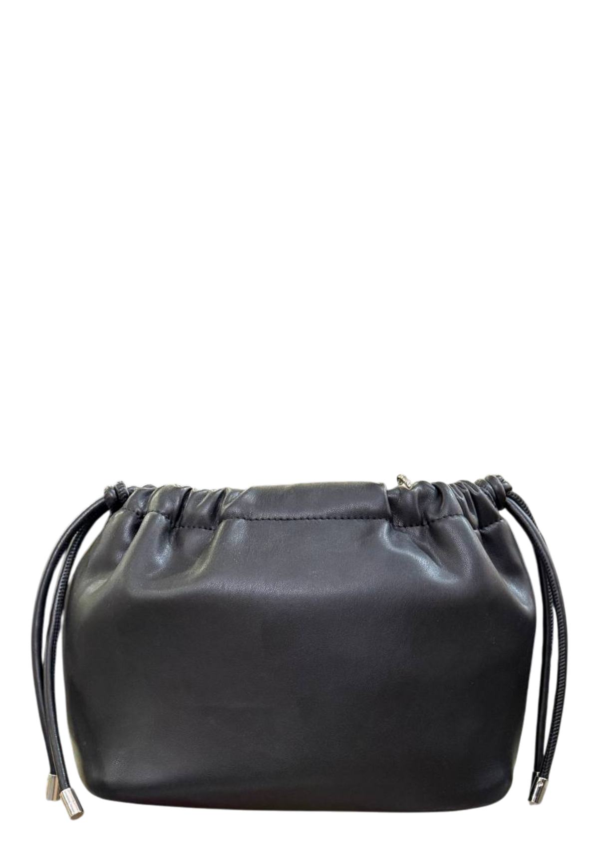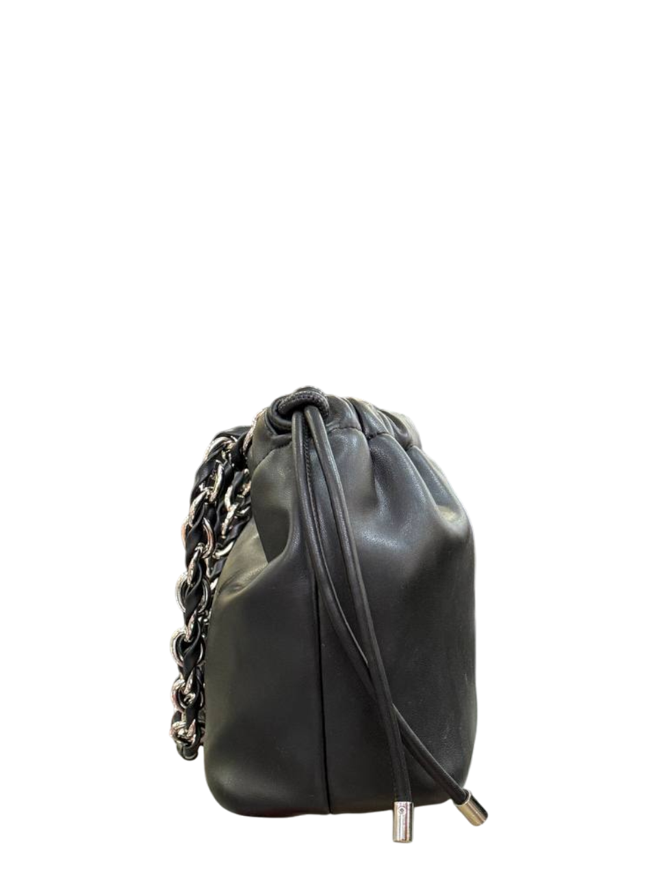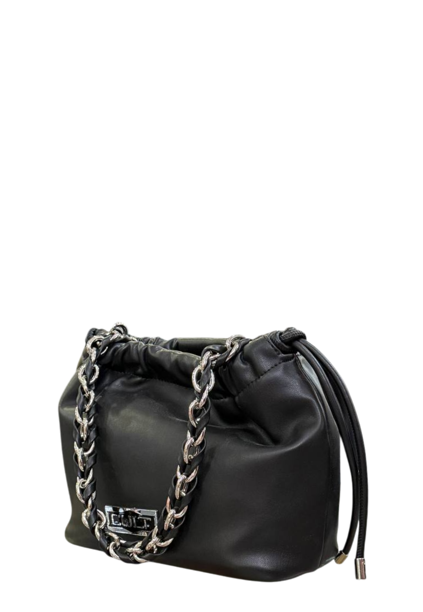 Borsa firmata CULT con chiusura a sacco e con zip, scomparto interno, tracolla rimuovibile, manico in catena intrecciata con fettucce in ecopelle