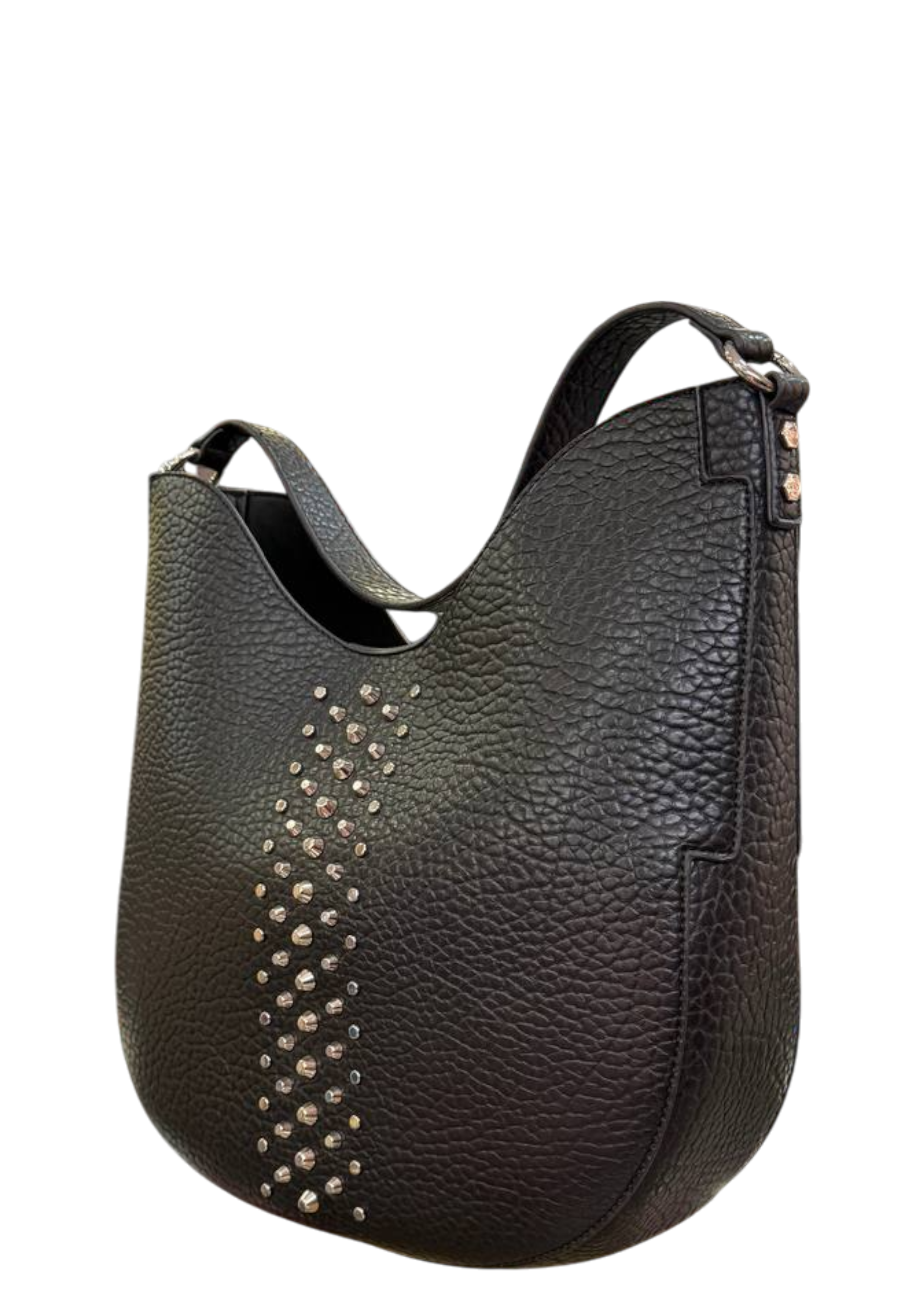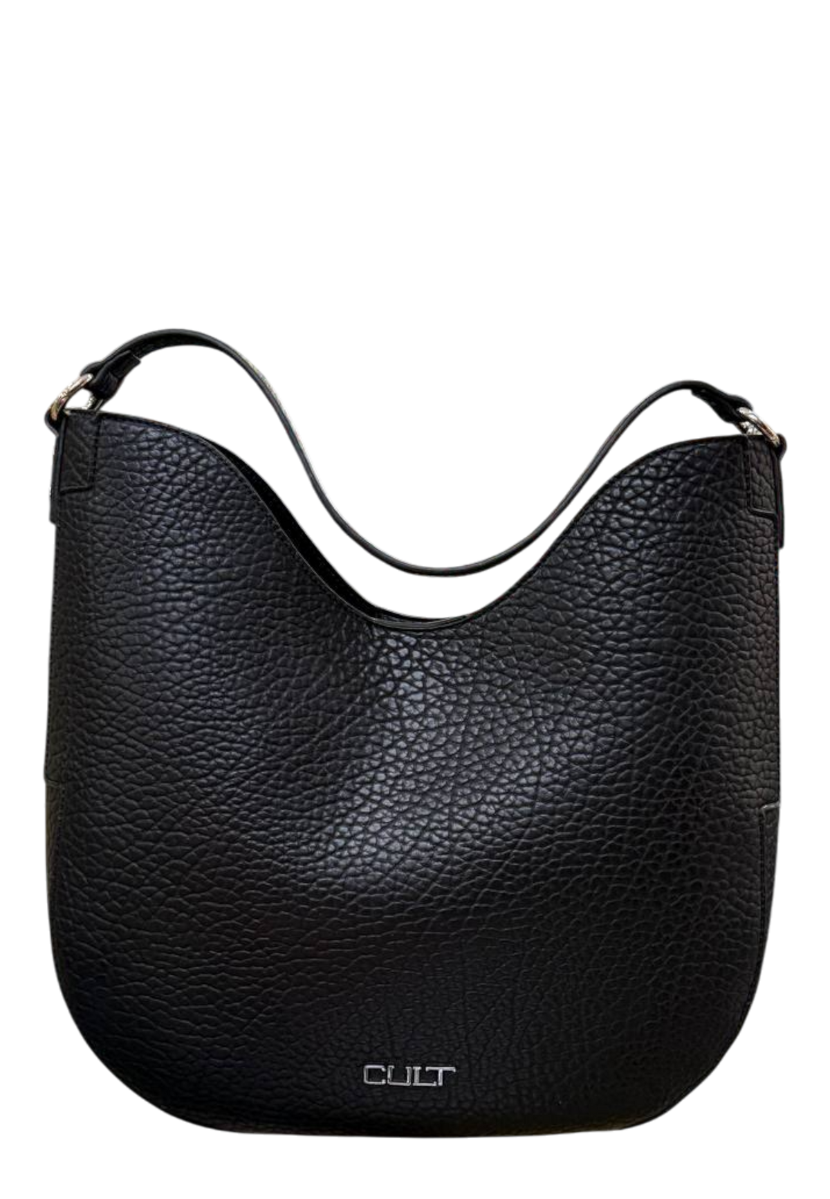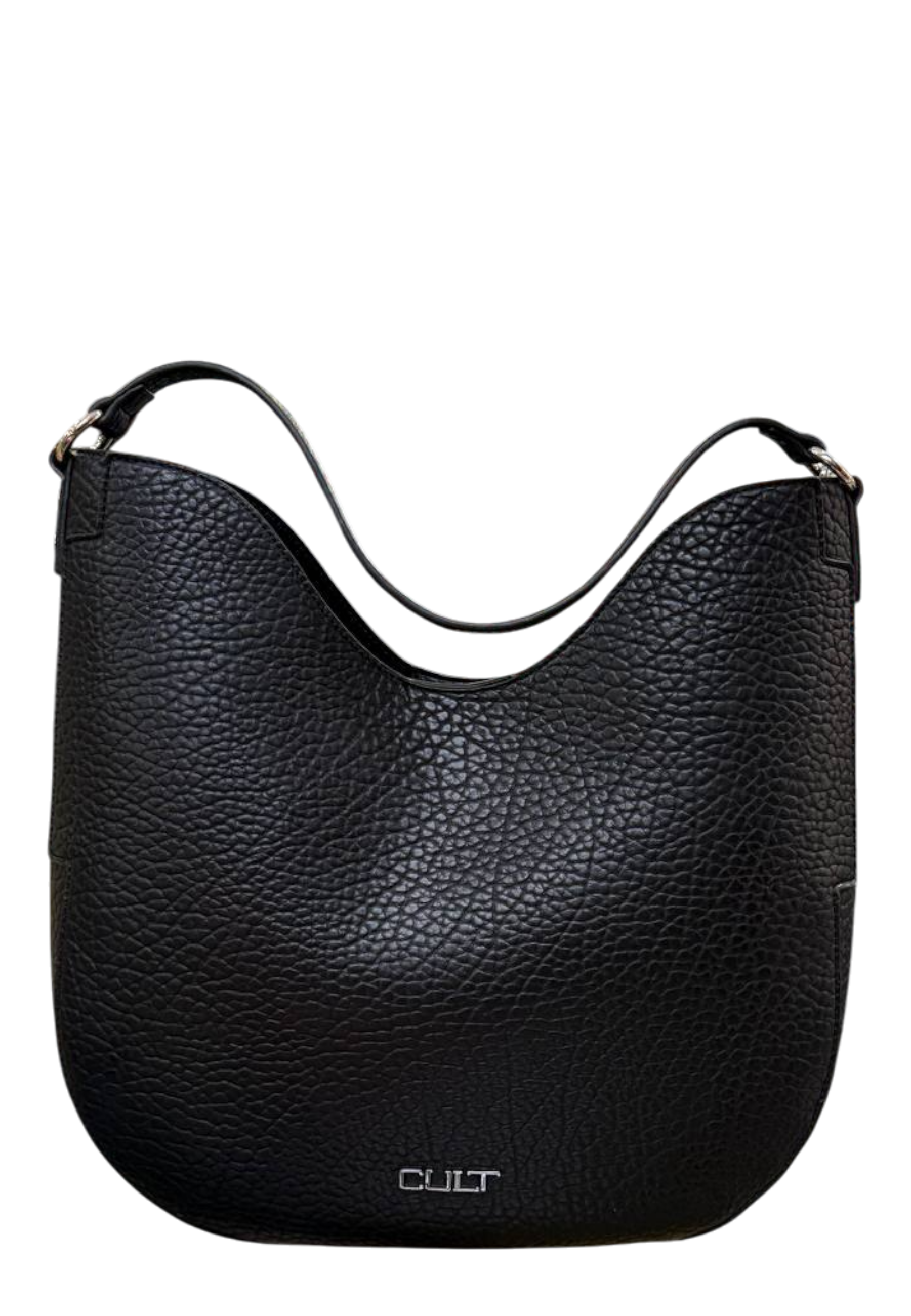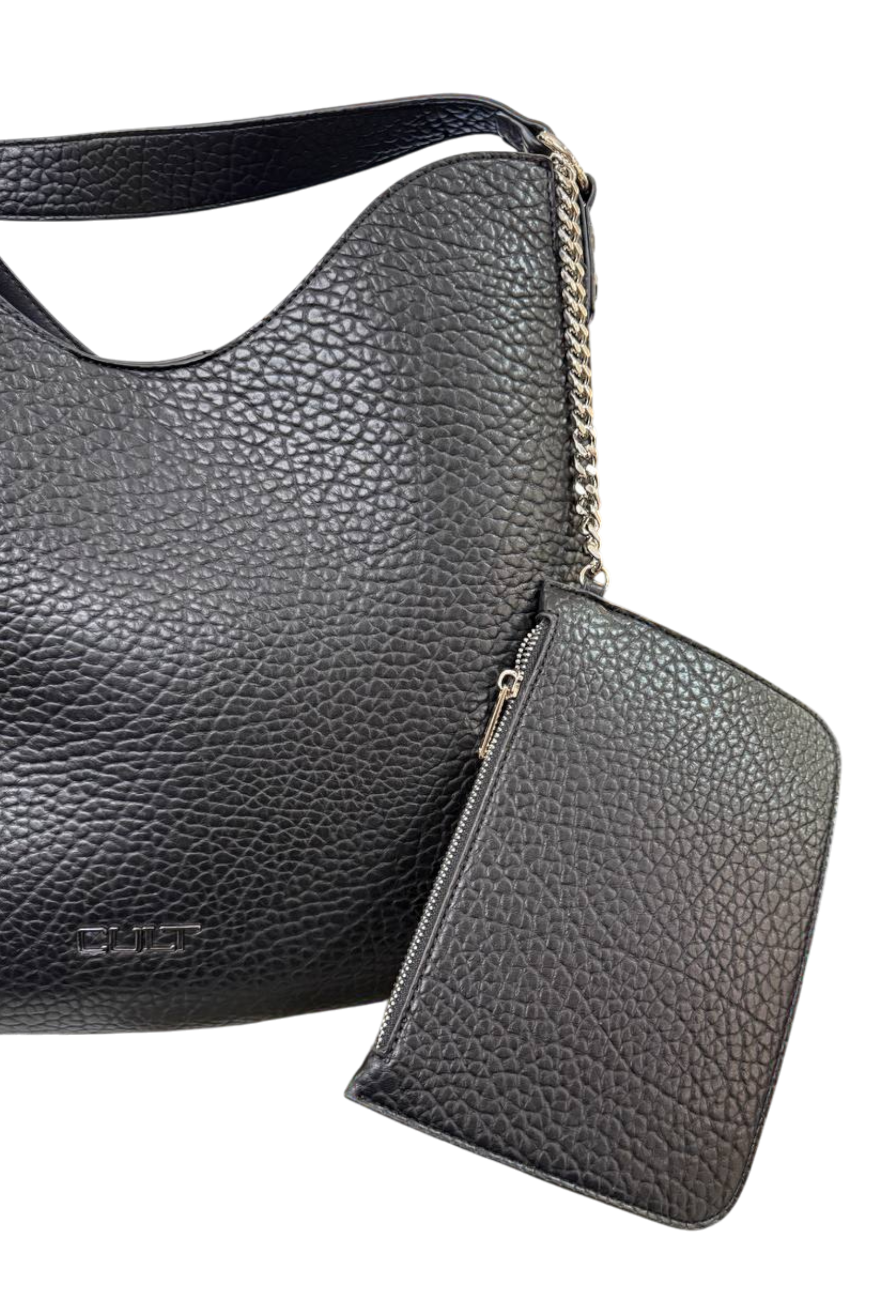 Borsa firmata CULT con chiusura magnetica, manico in ecopelle e pochette aggiuntiva in ecopelle fissata con una catena metallica.