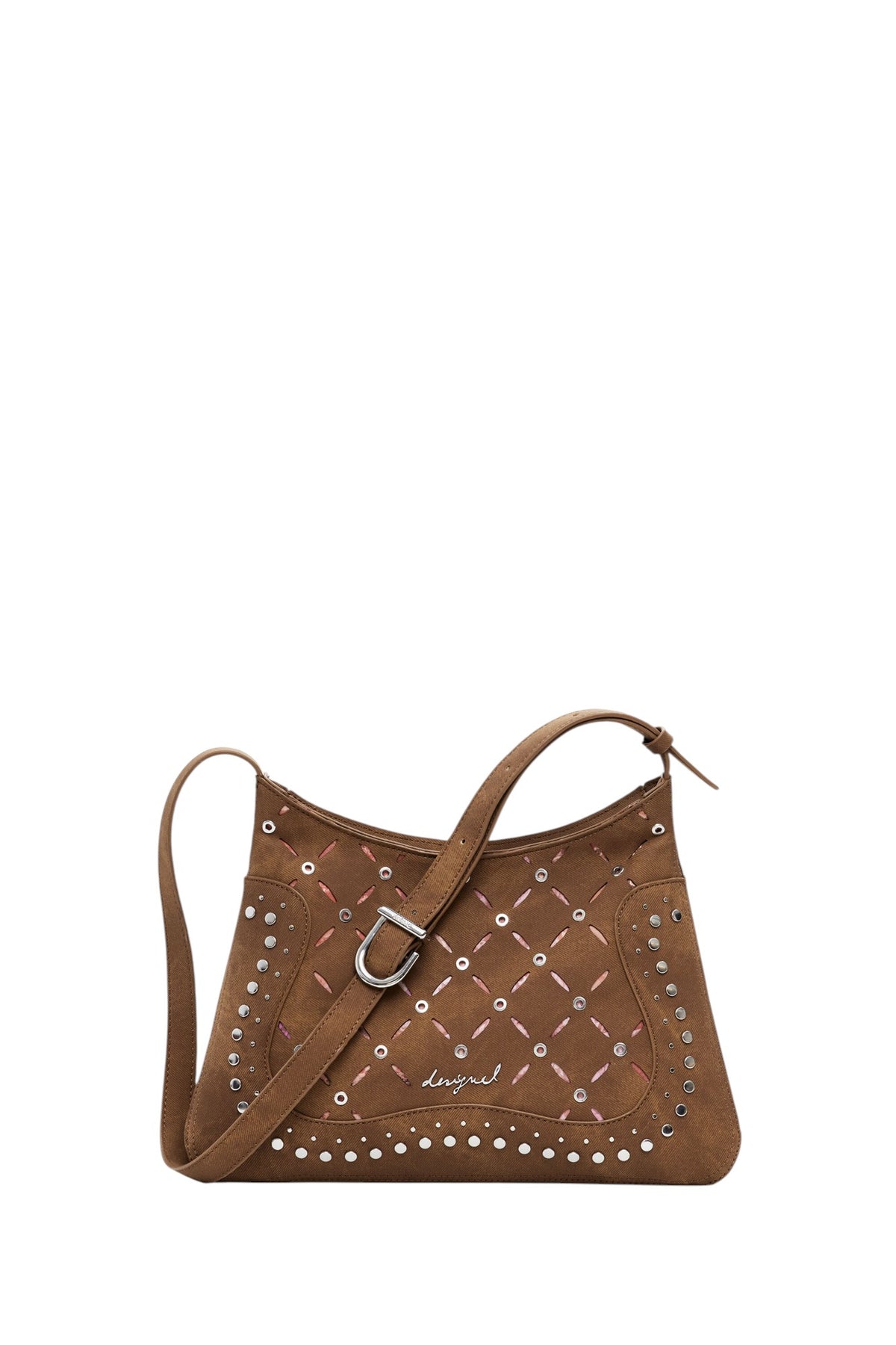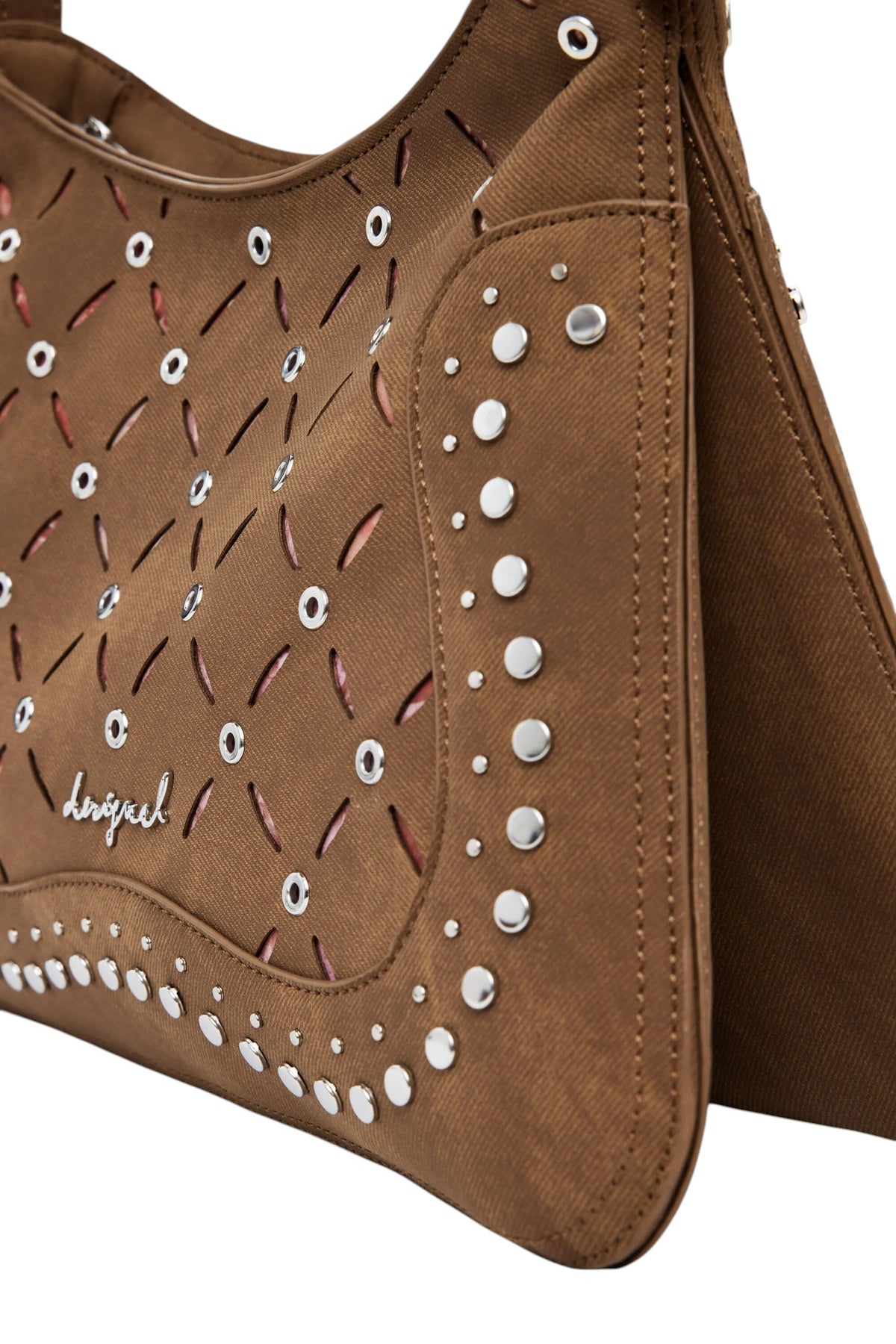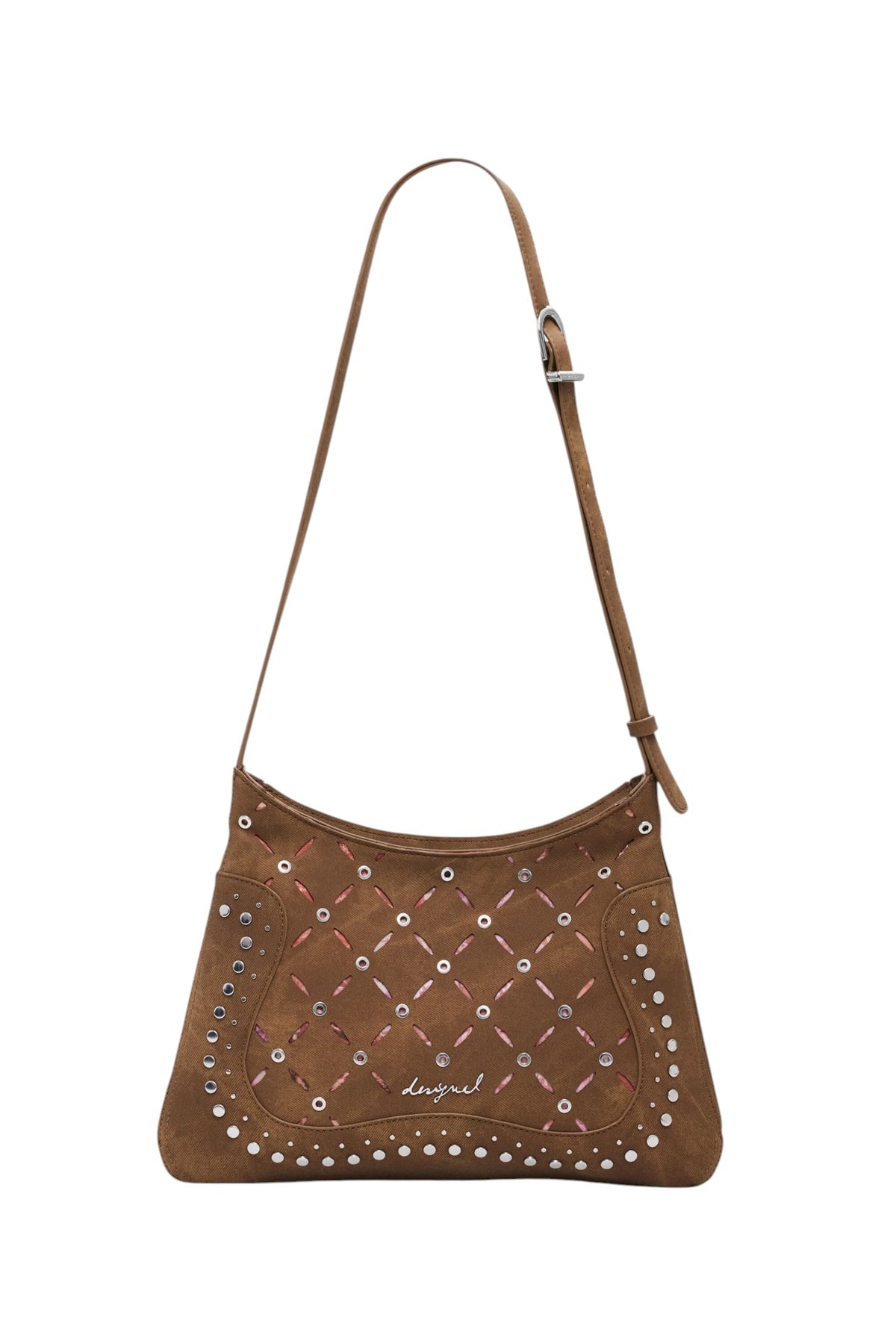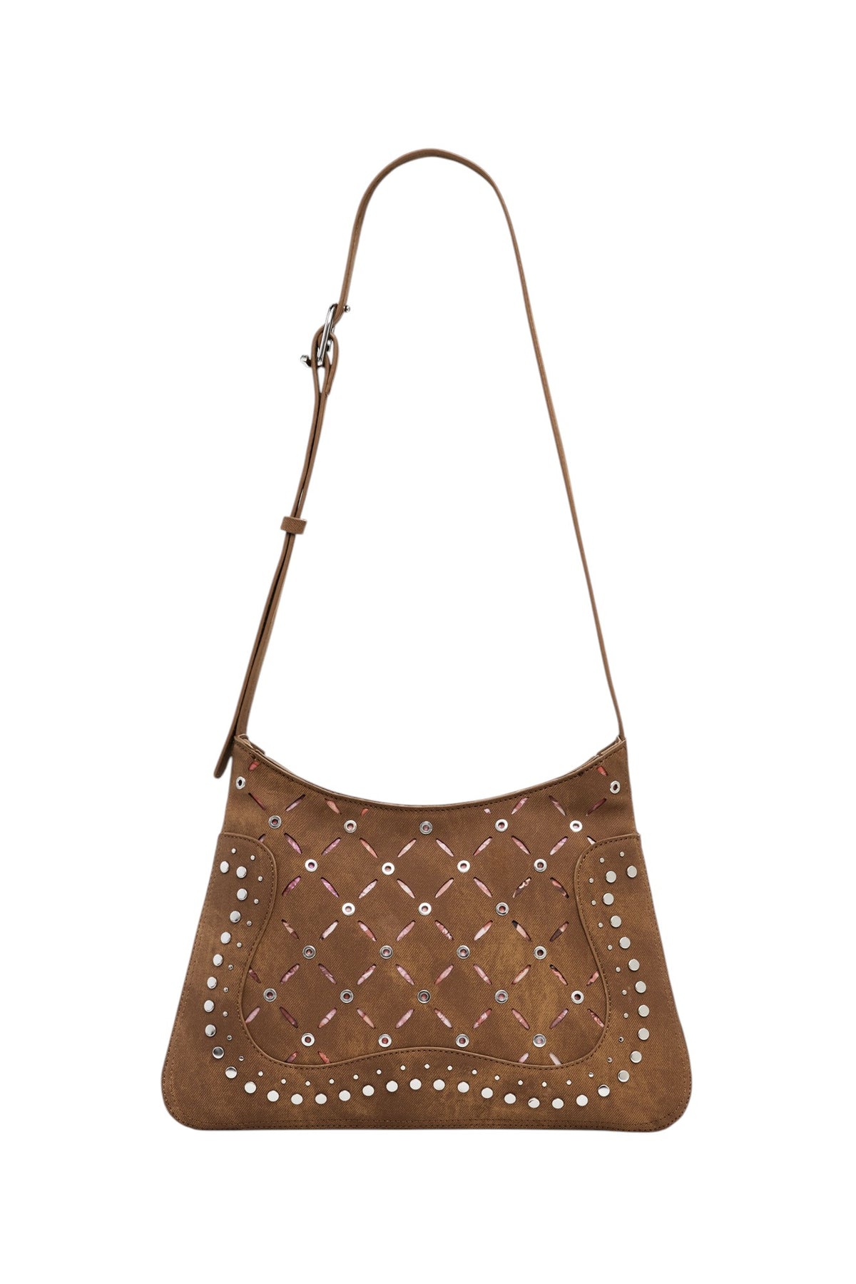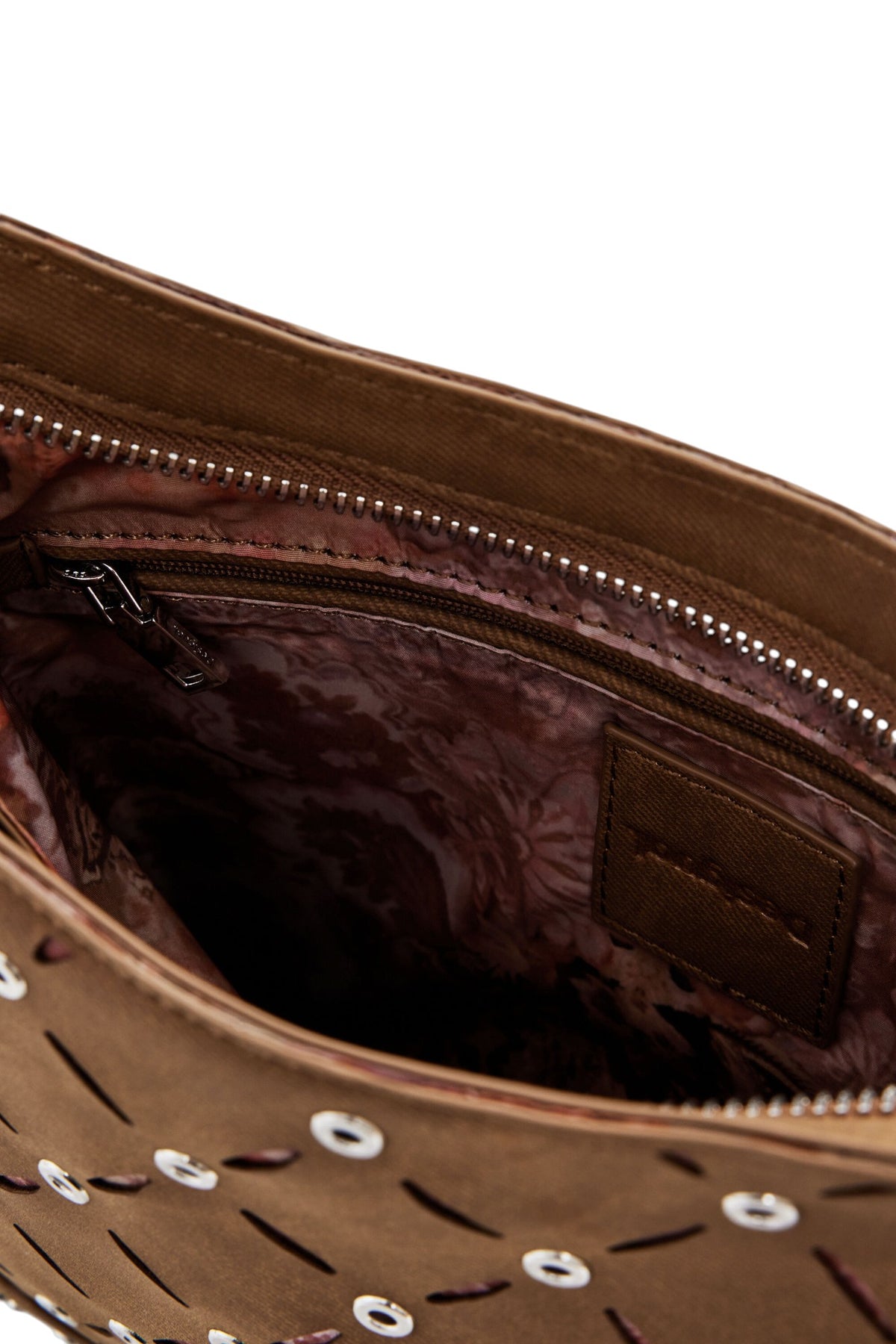 Borsa a spalla di medie dimensioni, in tessuto effetto pelle, con trafori, fodera stampata con motivi floreali e chiusura con cerniera.