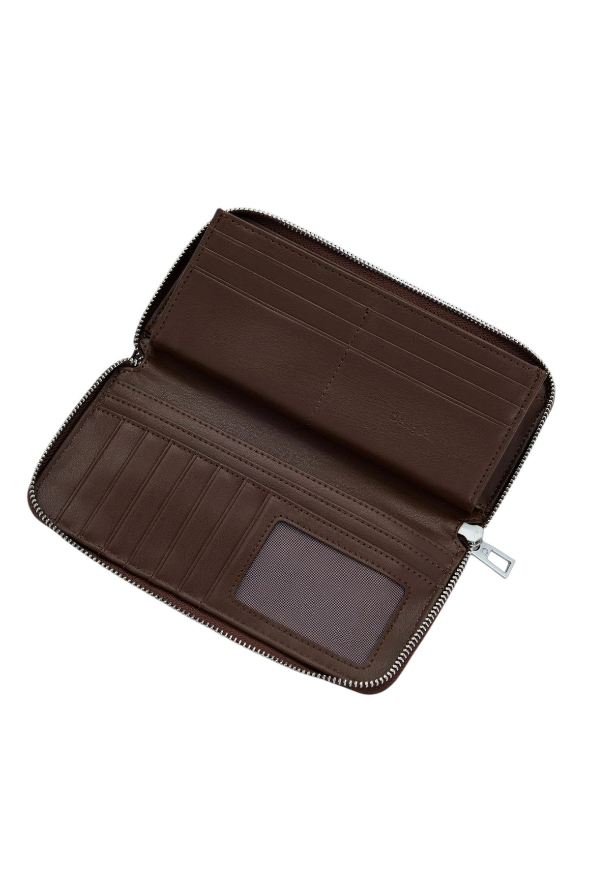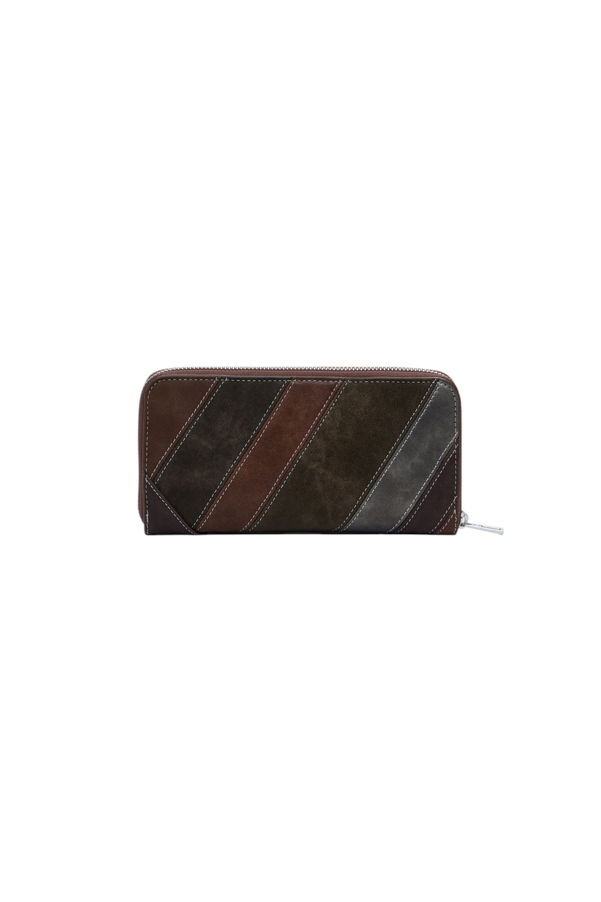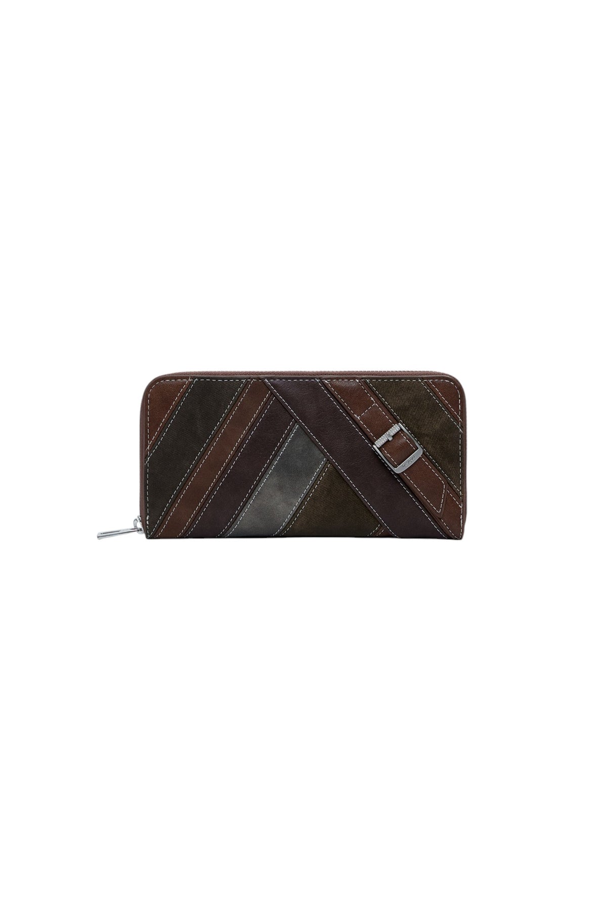 Portafoglio medio effetto pelle con cuciture decorative, cinturino con fibbia metallica, diversi scomparti e chiusura con cerniera.