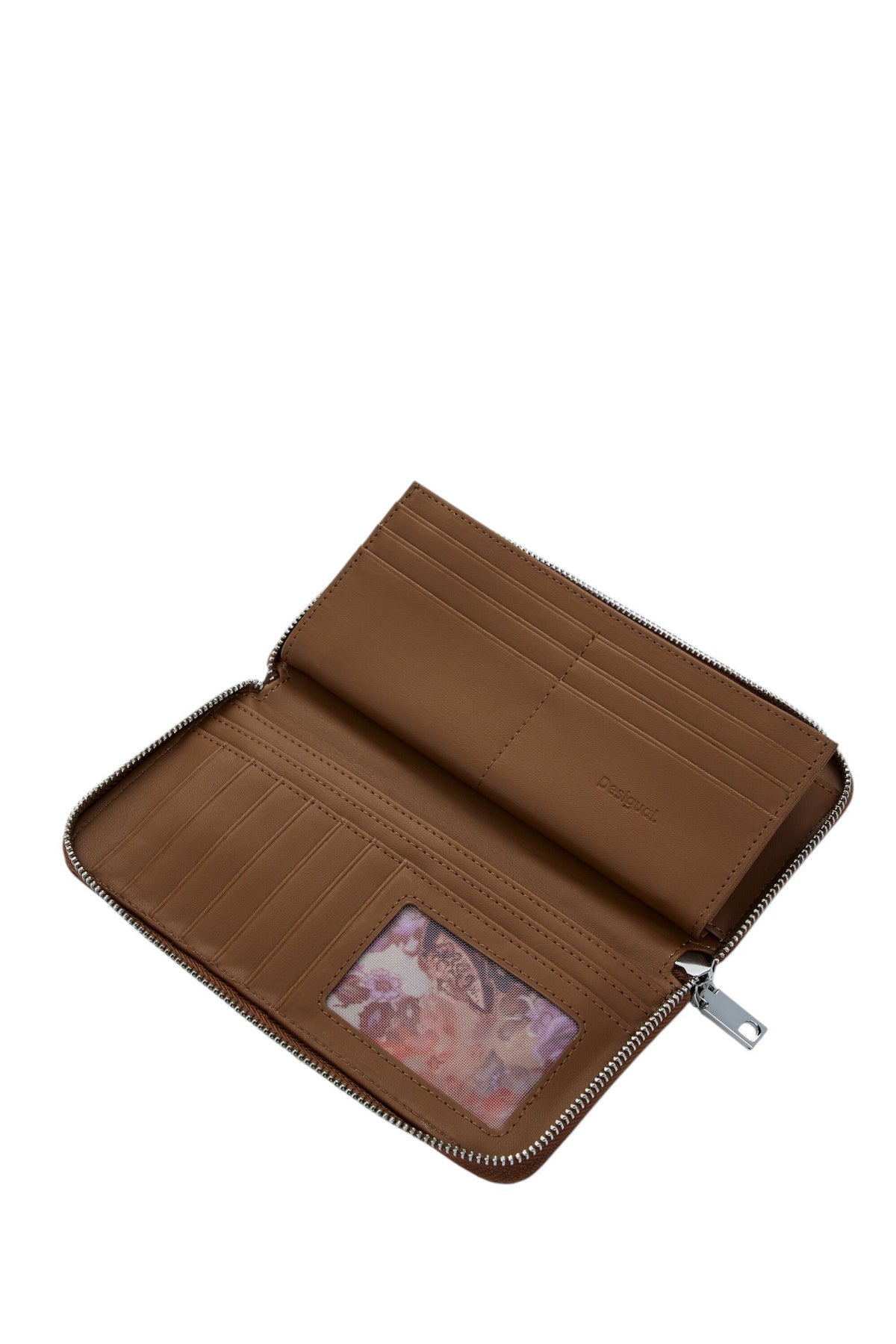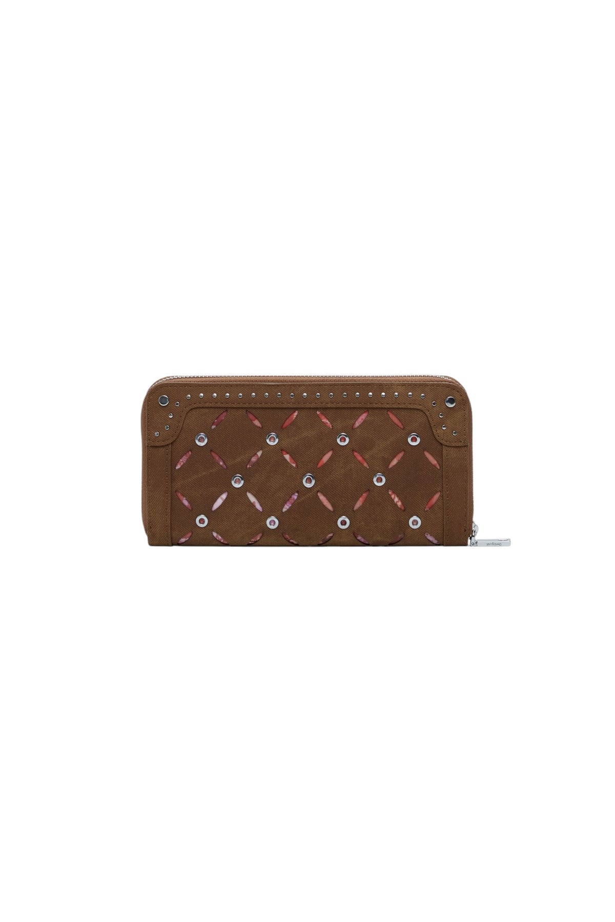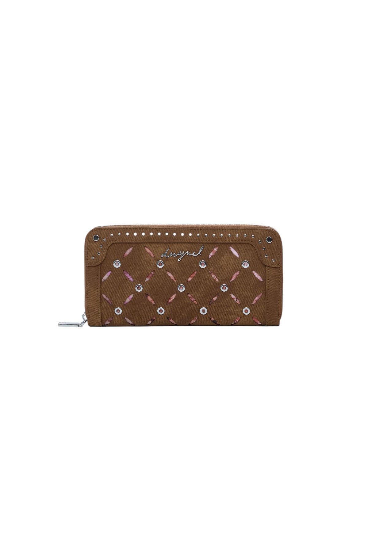 Portafoglio medio effetto tessuto con borchiette decorative in metallo, diversi scomparti e chiusura con cerniera.