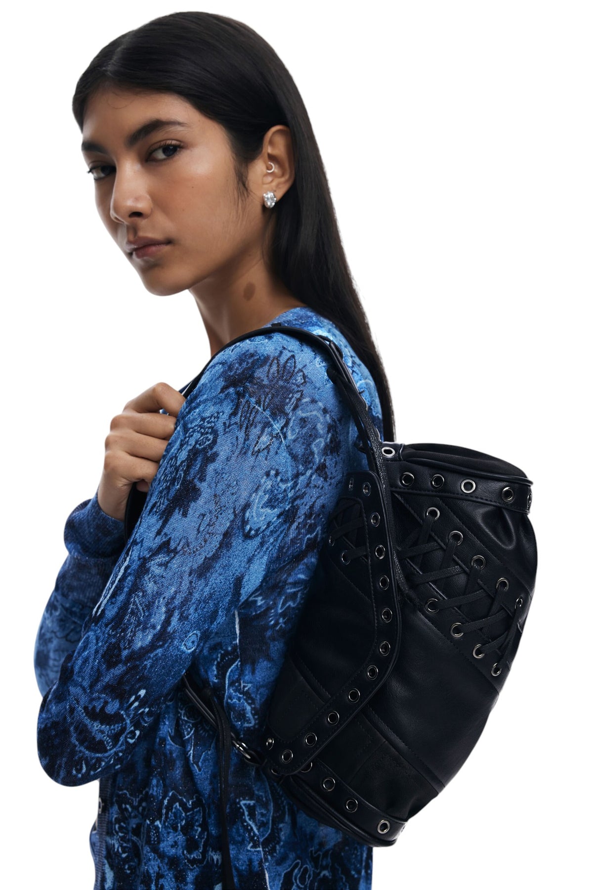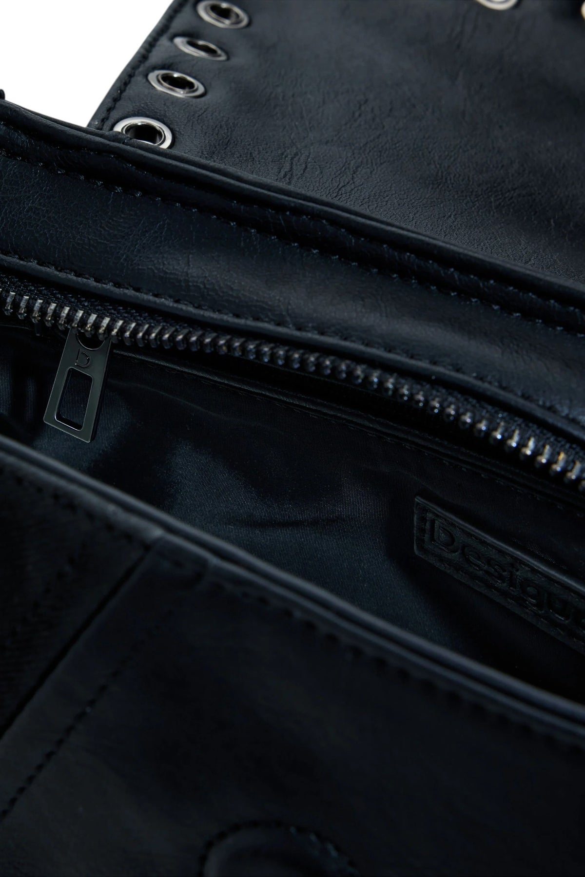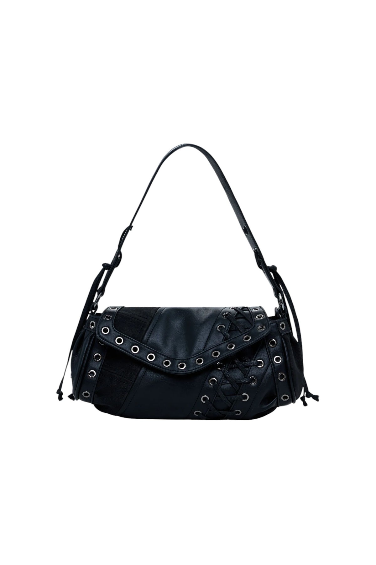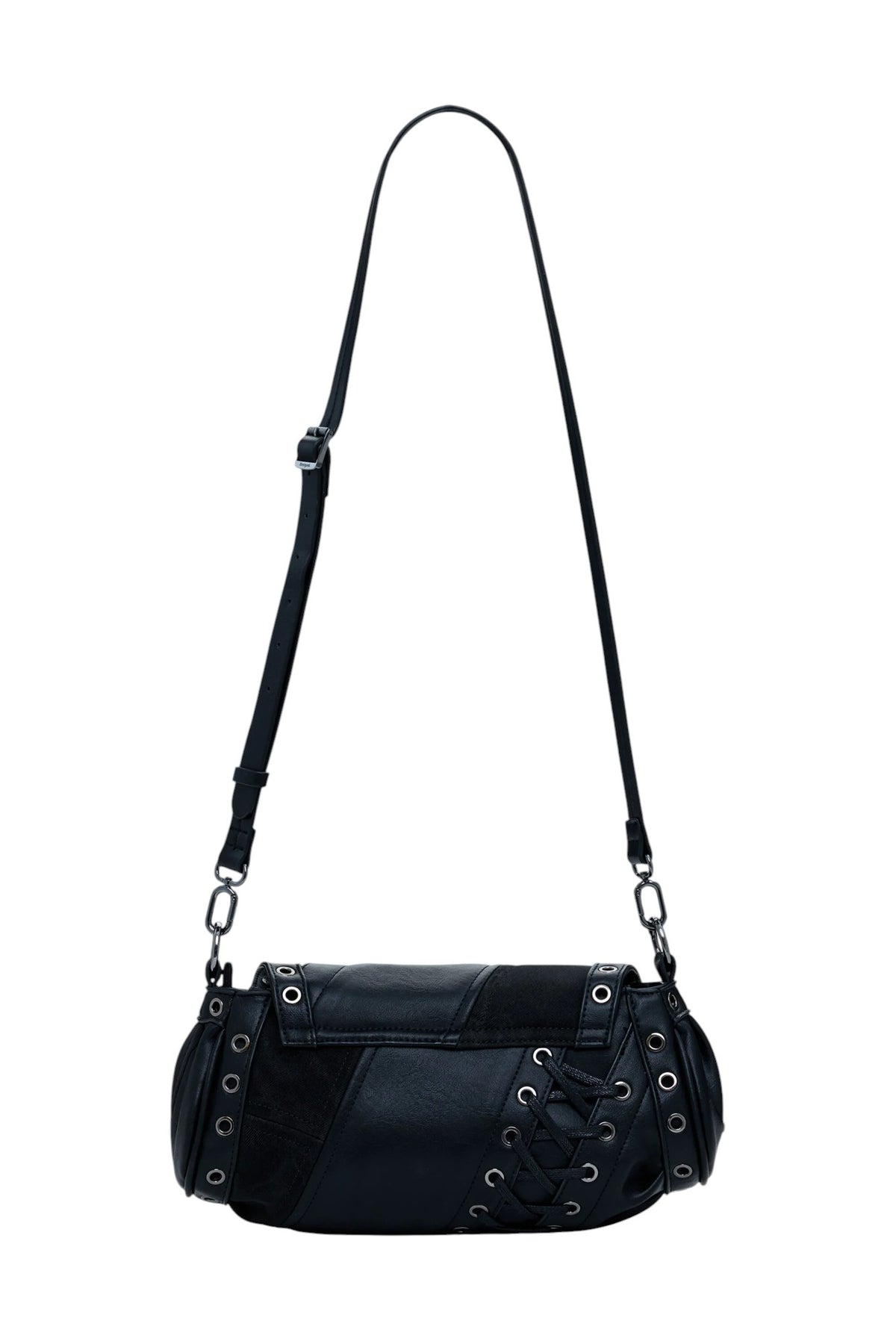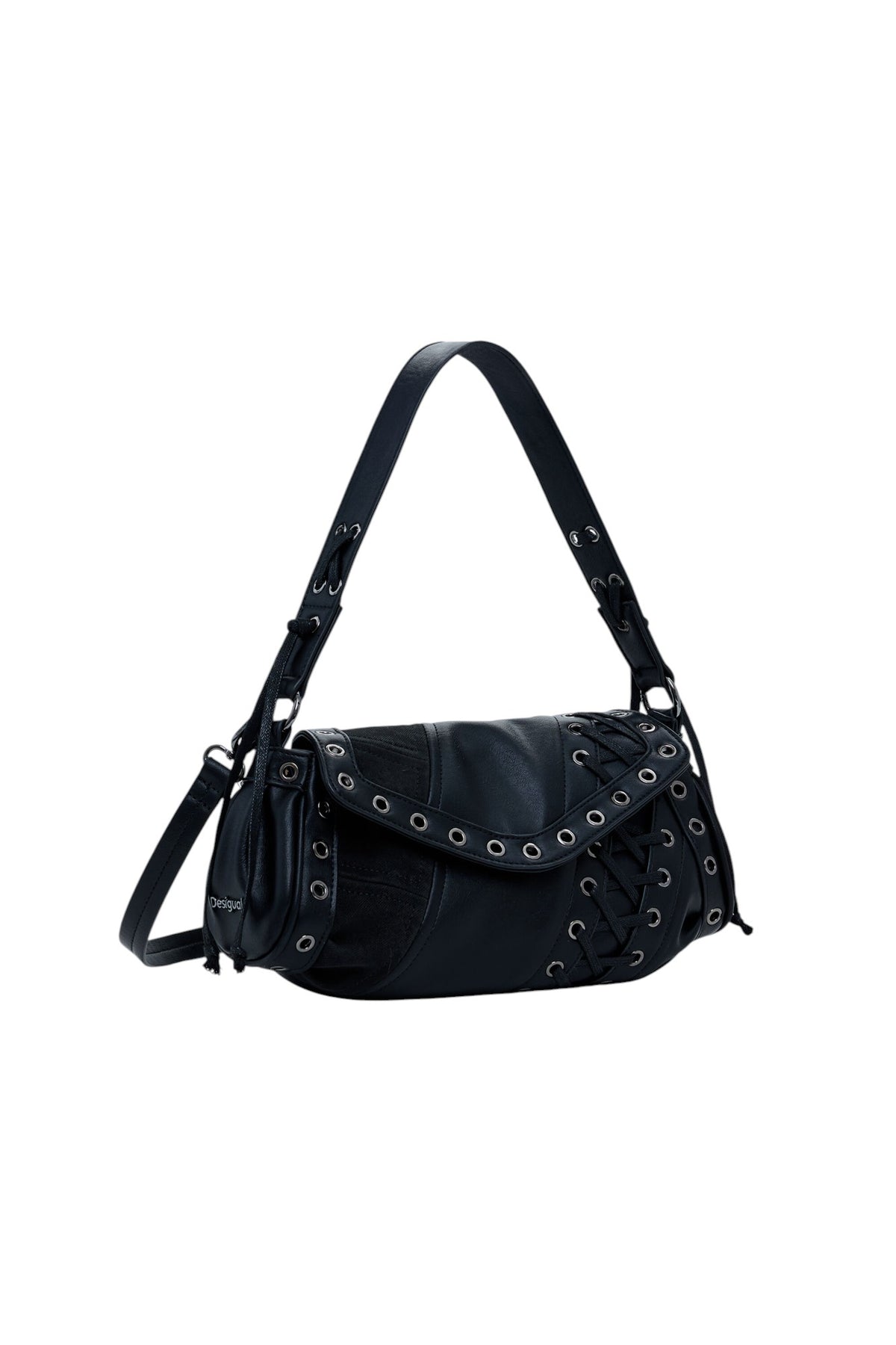 Borsa a tracolla di medie dimensioni, stile patchwork con diversi tessuti effetto pelle, dettagli decorativi intrecciati e manici intercambiabili.