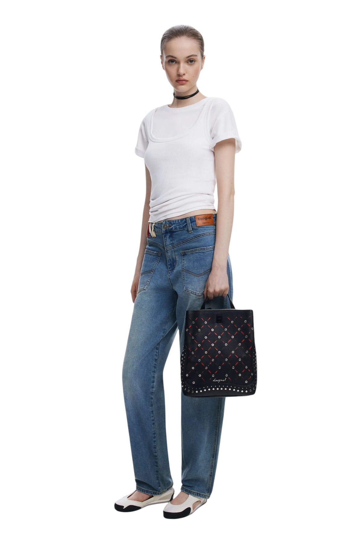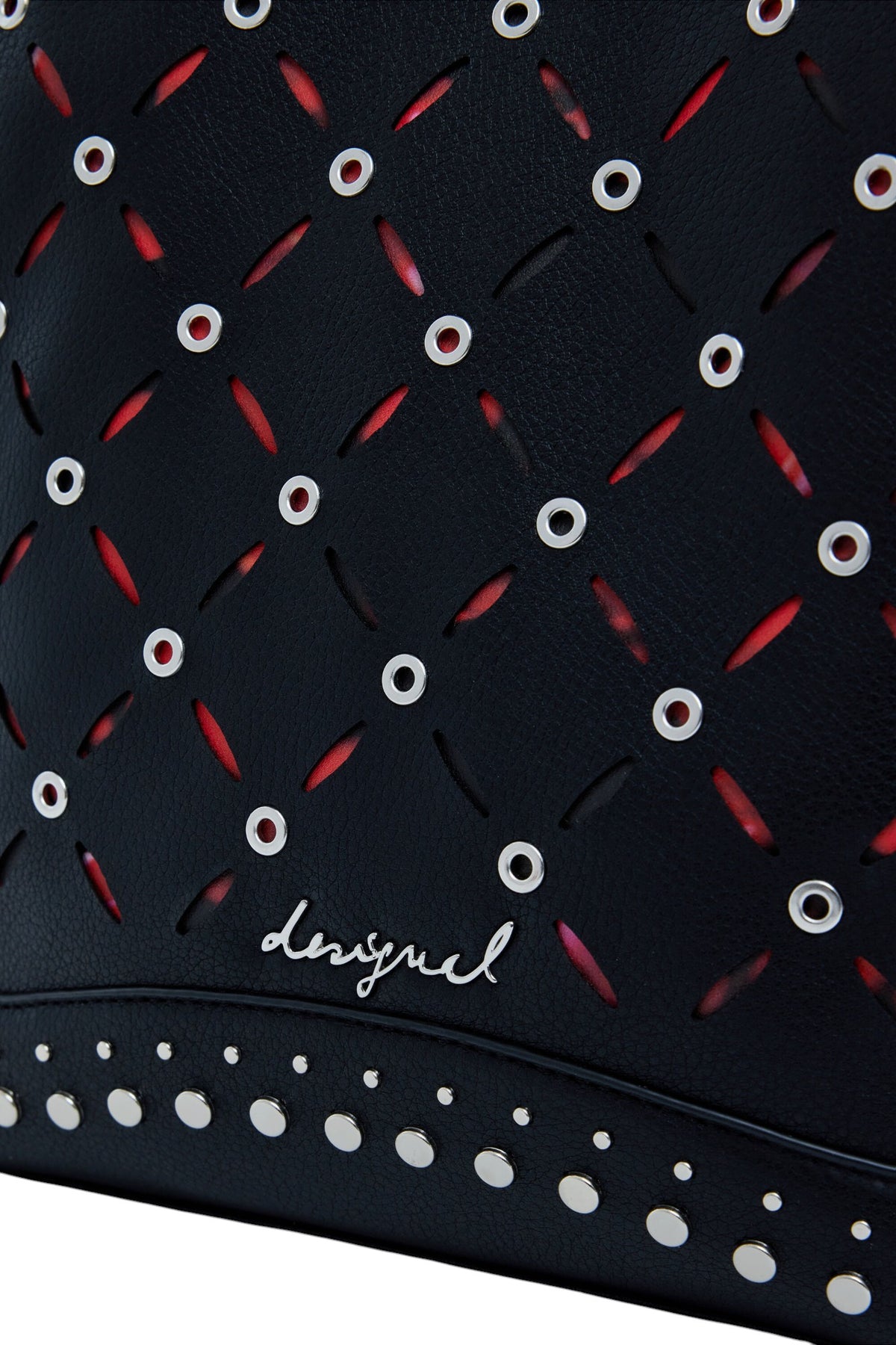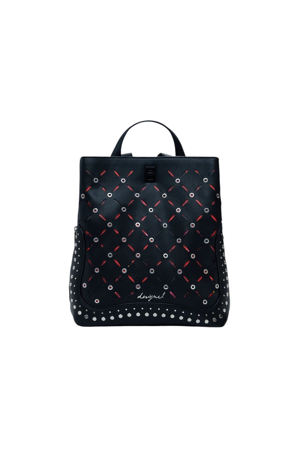 Zaino piccolo in effetto pelle, con trafori, fondo stampato e dettaglio di borchie e applicazioni metalliche.