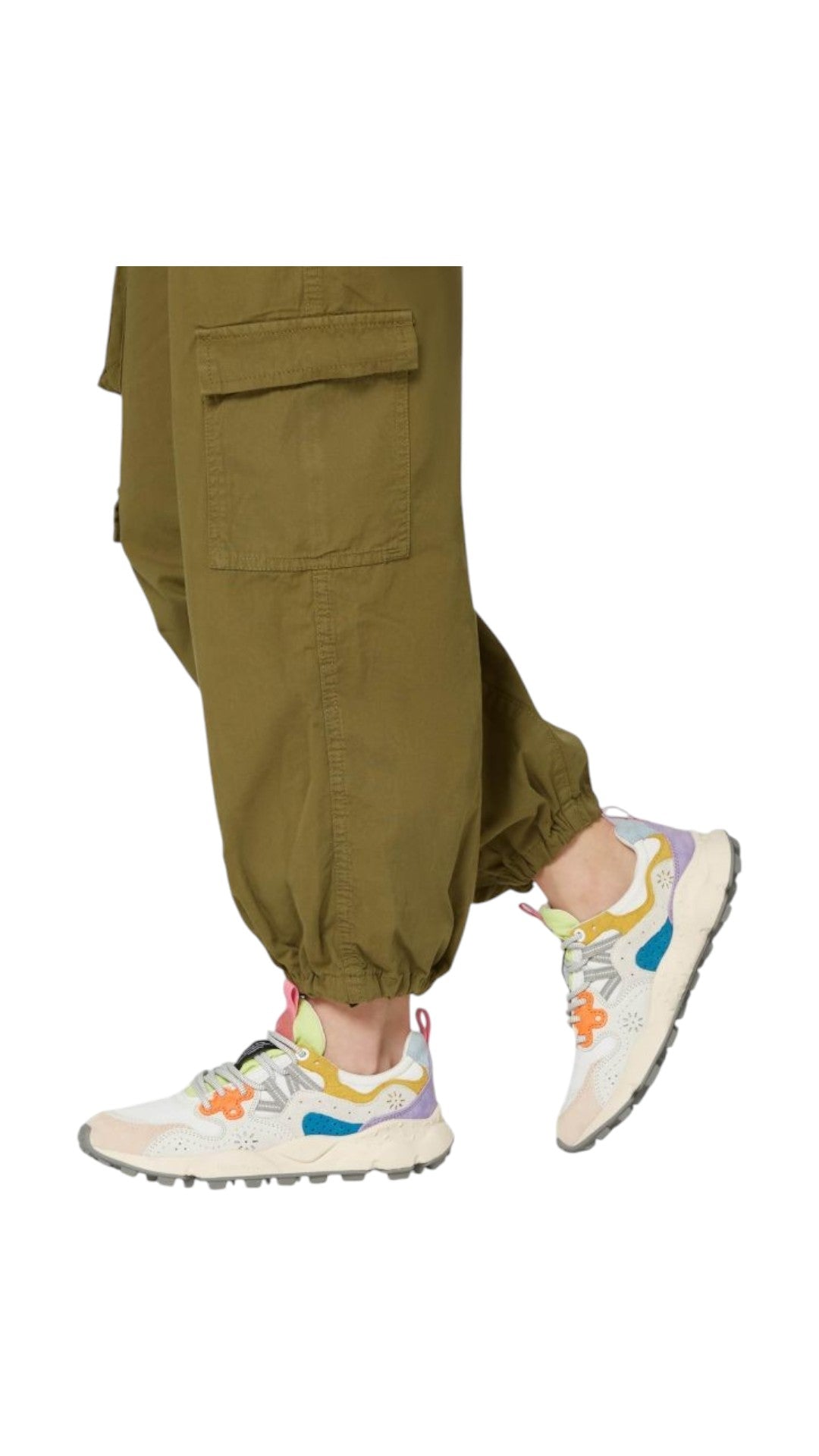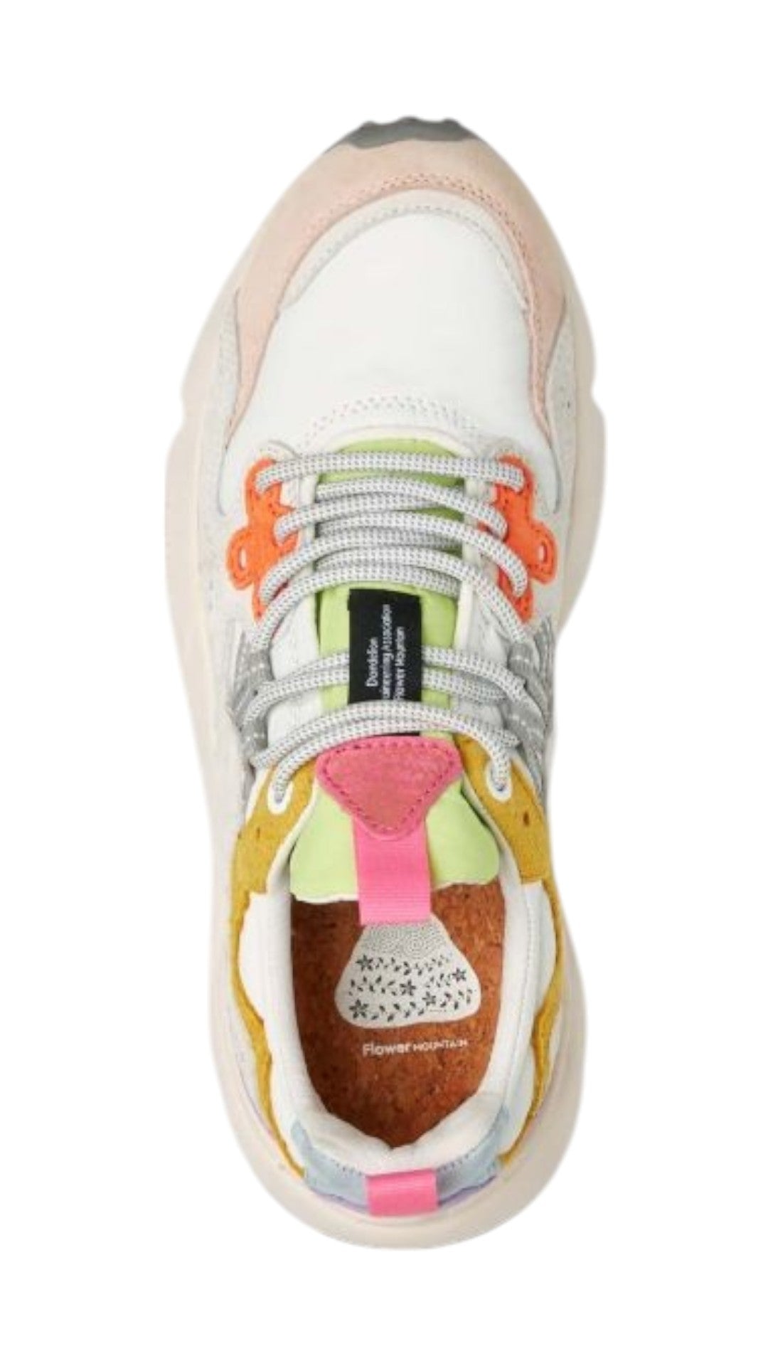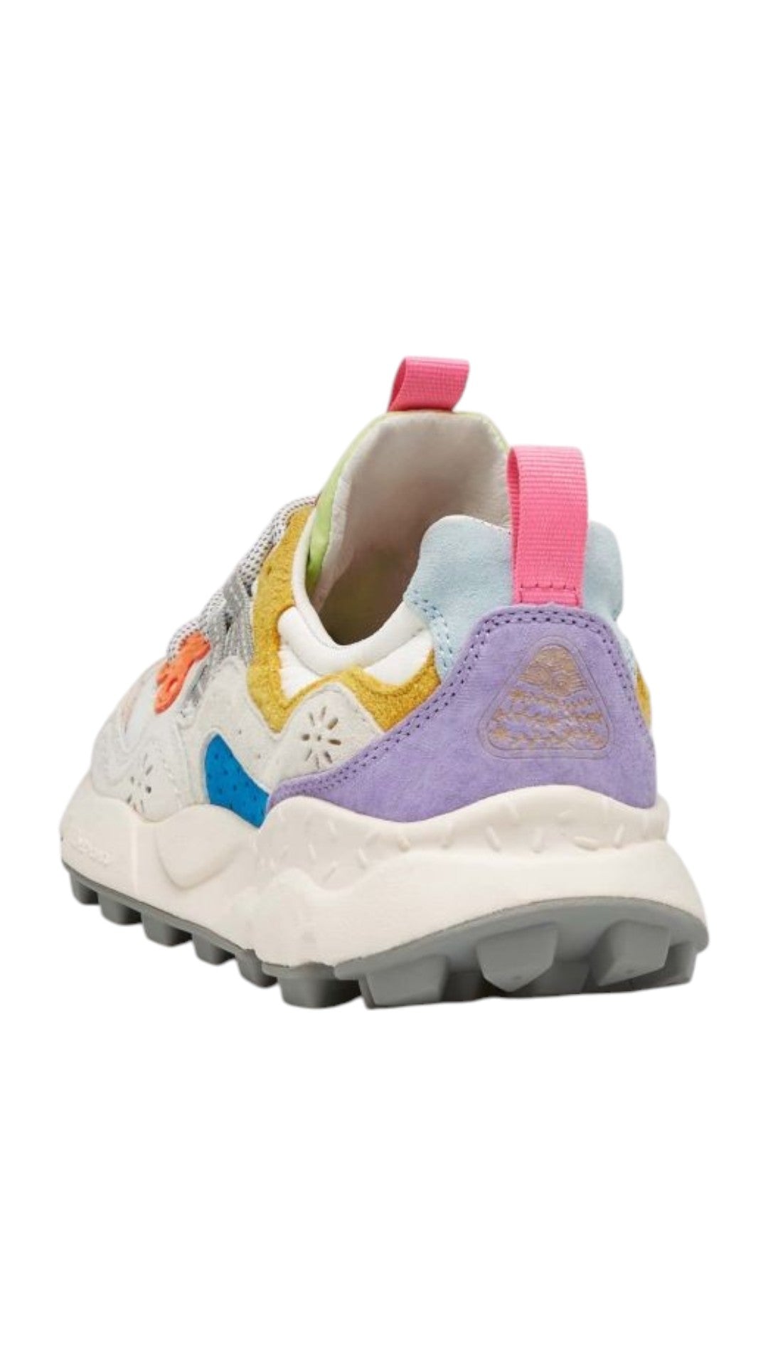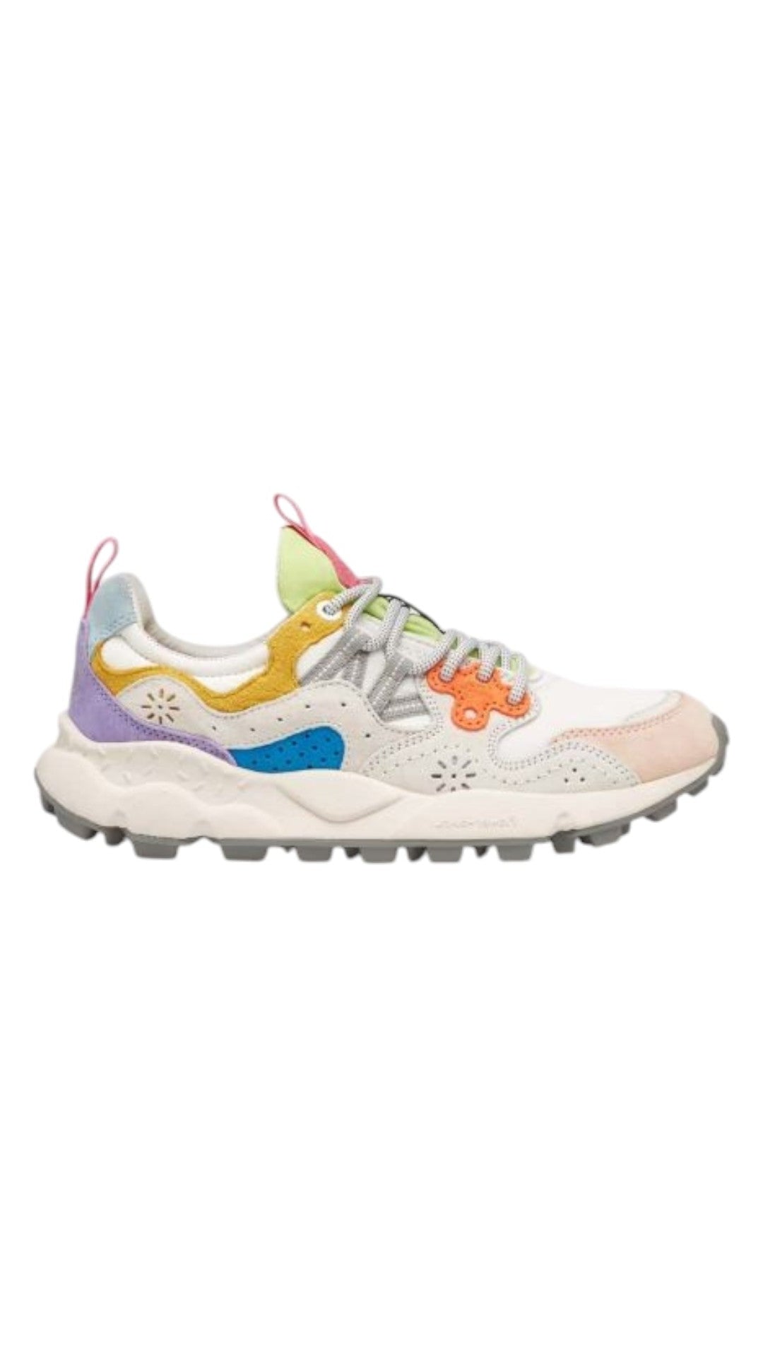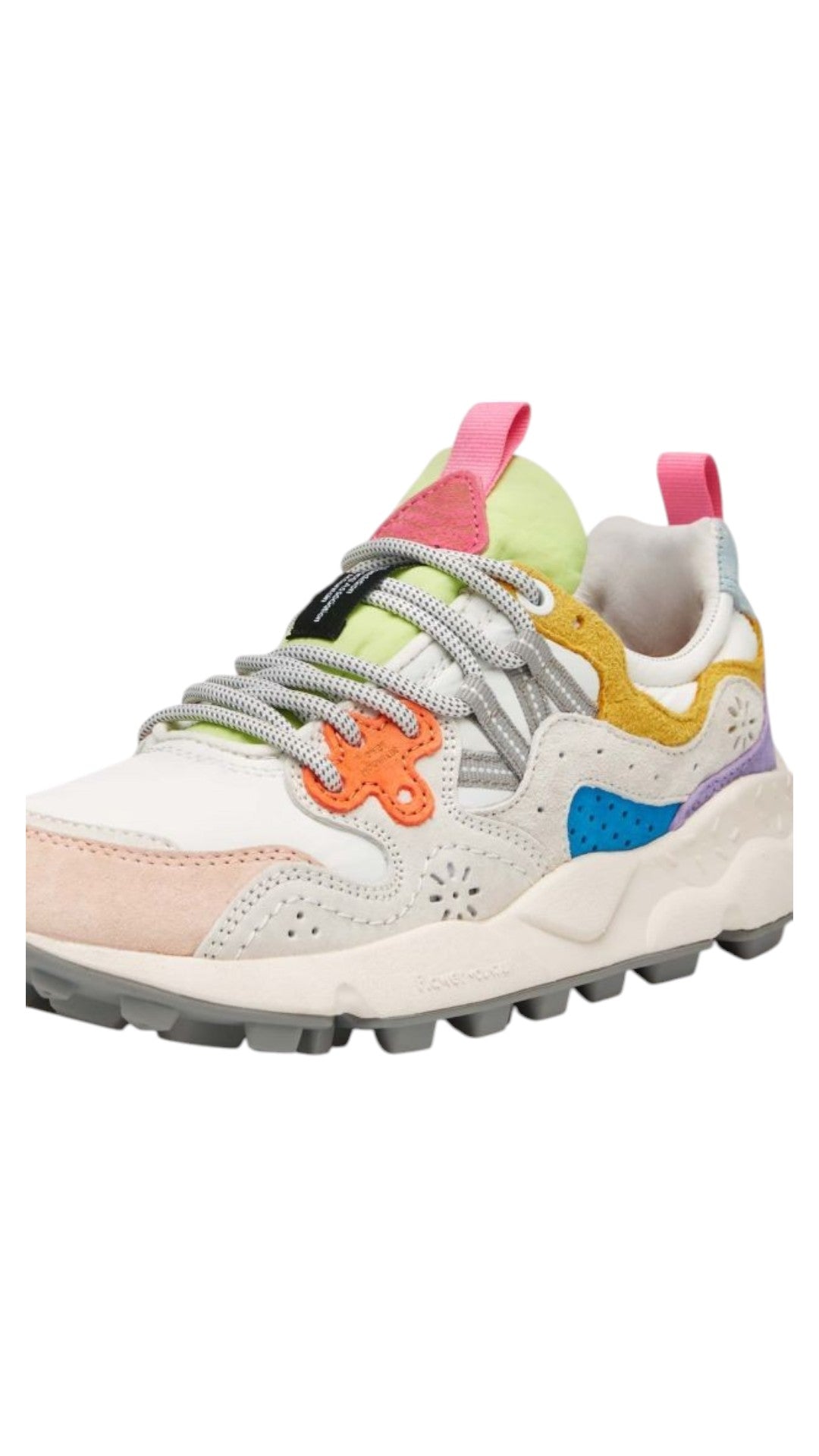 Sneaker in tessuto tecnico con inserti in camoscio multicolor. Occhielli rinforzati e lacci trek. Soletta interna in sughero naturale antibatterico, fondo in gomma ultra leggera con battistrada dentellato.