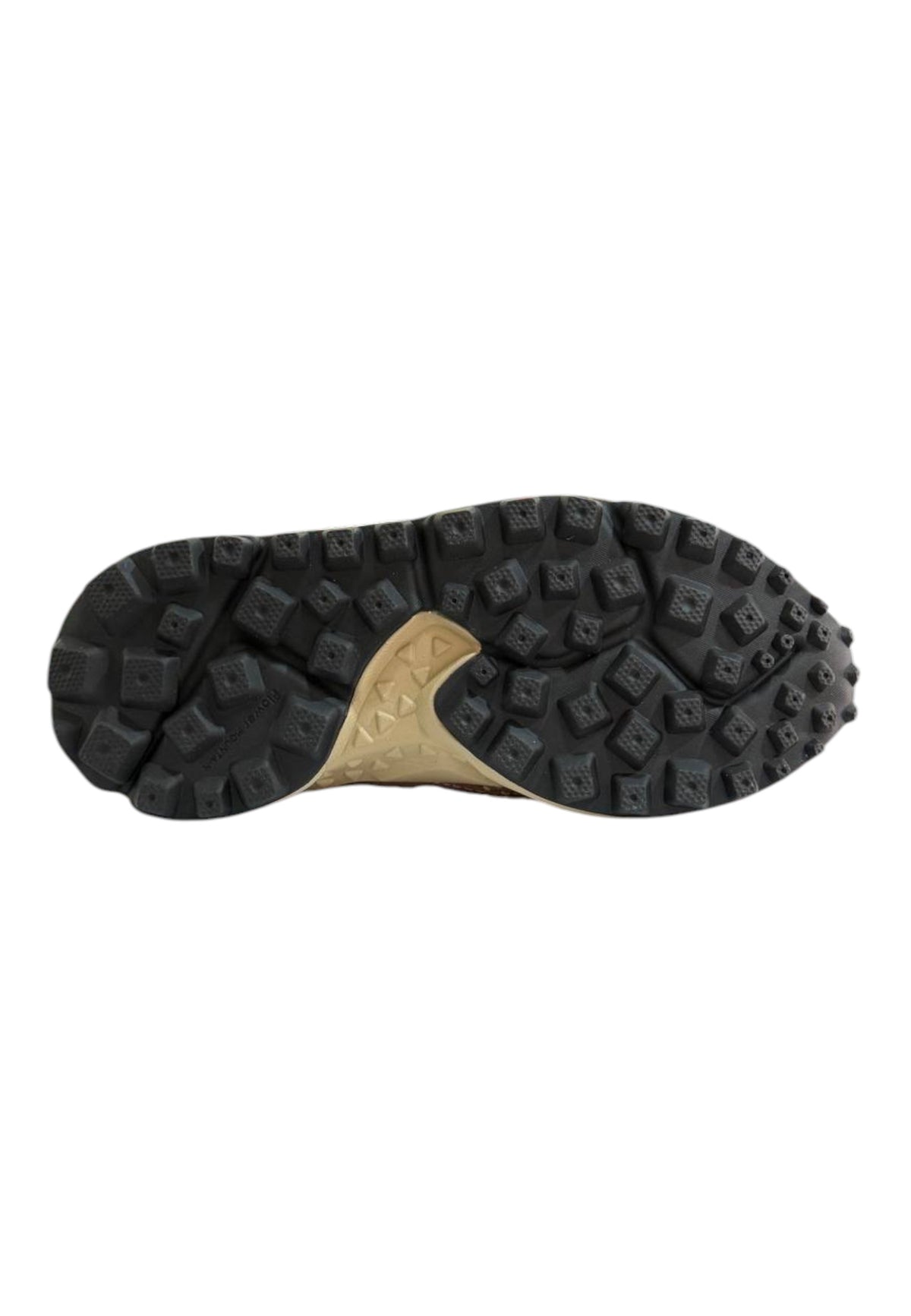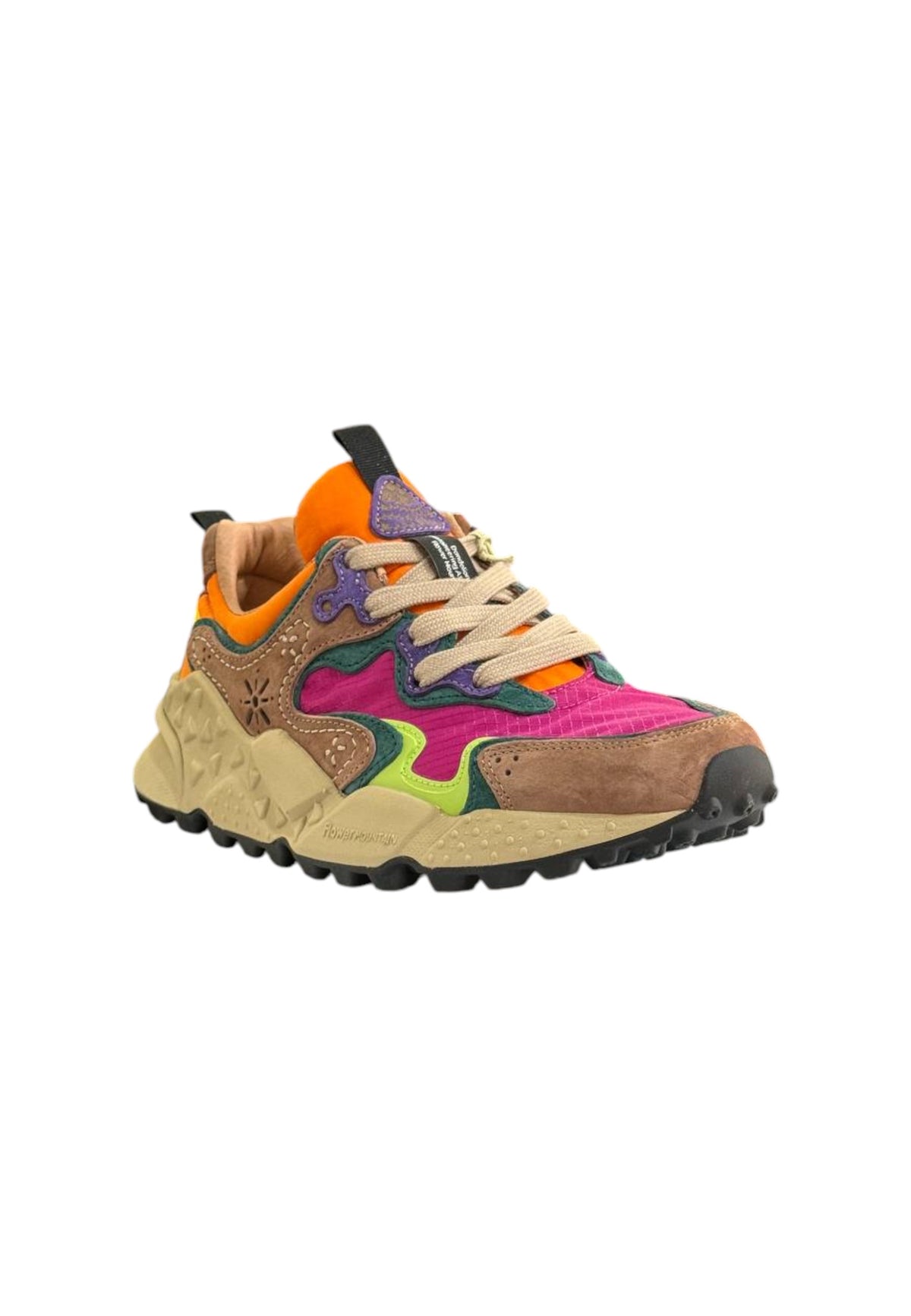 Sneaker sportiva con tomaia realizzata in tessuto a maglia con inserti in suede multicolore lavorato con la tecnica dell'overlapping. Chiusura con lacci di cotone e occhielli rinforzati. Fodera interna in pelle, soletta in sughero naturale antibatterico. Fondo in gomma ultra leggera con sagomature laterali e battistrada dentellato