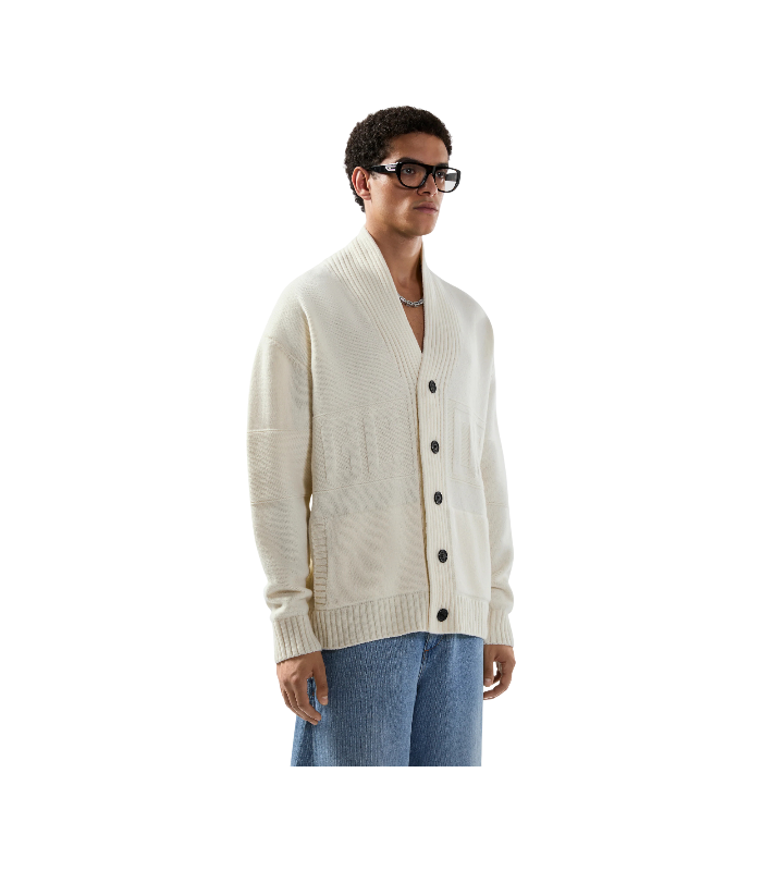 Cardigan in maglia compatta con chiusura frontale a bottoni e logo. Modello a girocollo con spalle scese e finiture a costine su polsini e fondo.