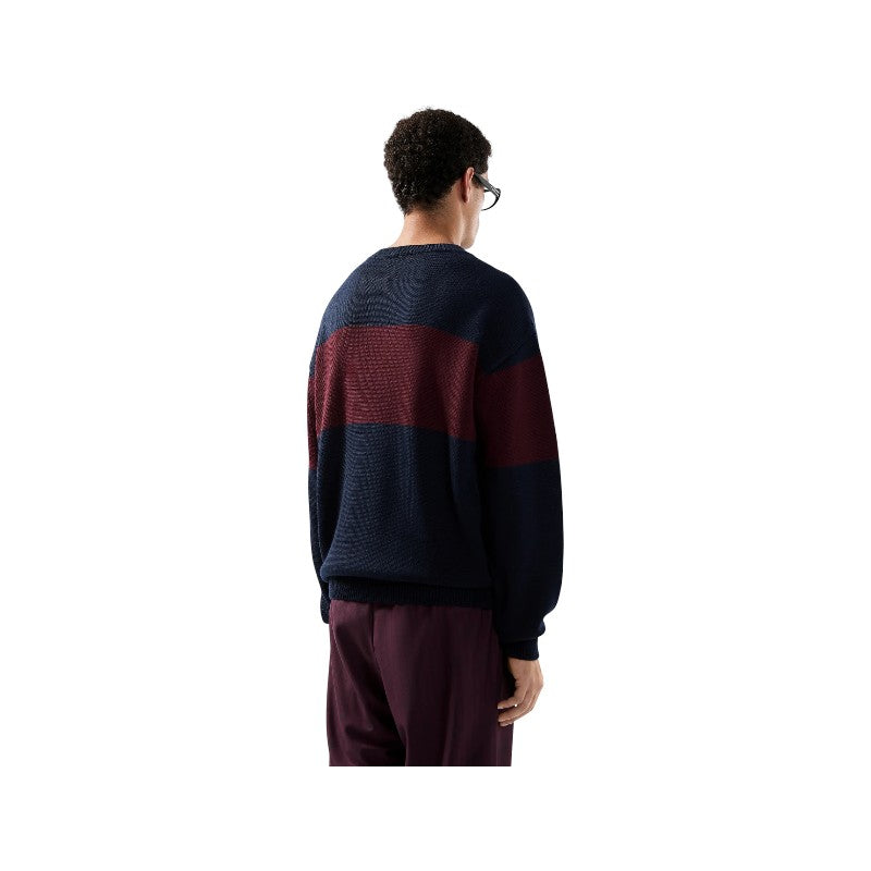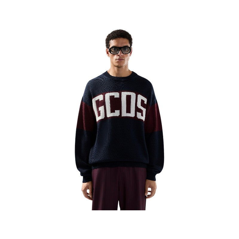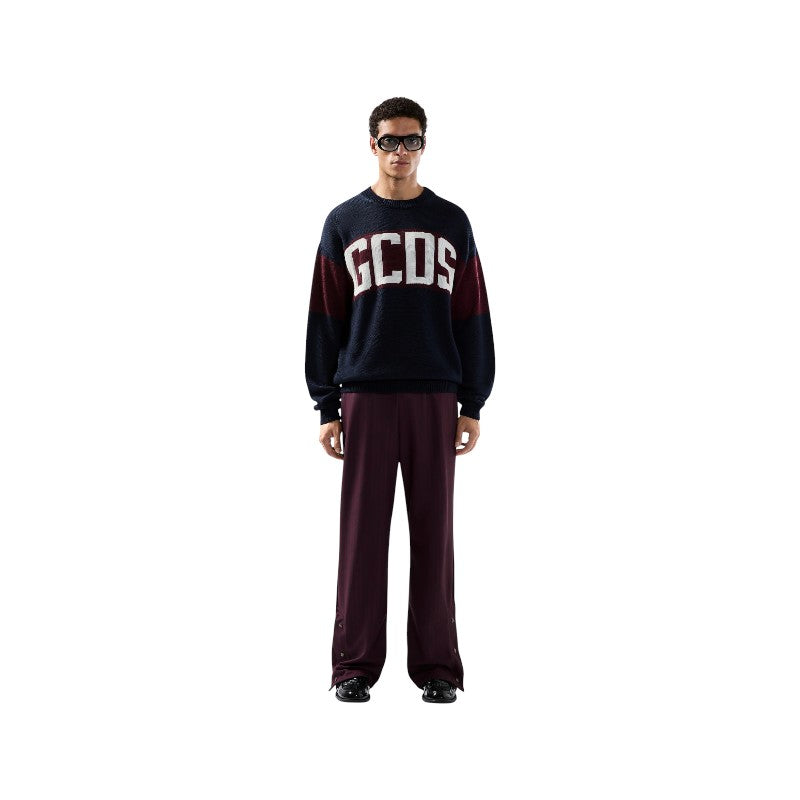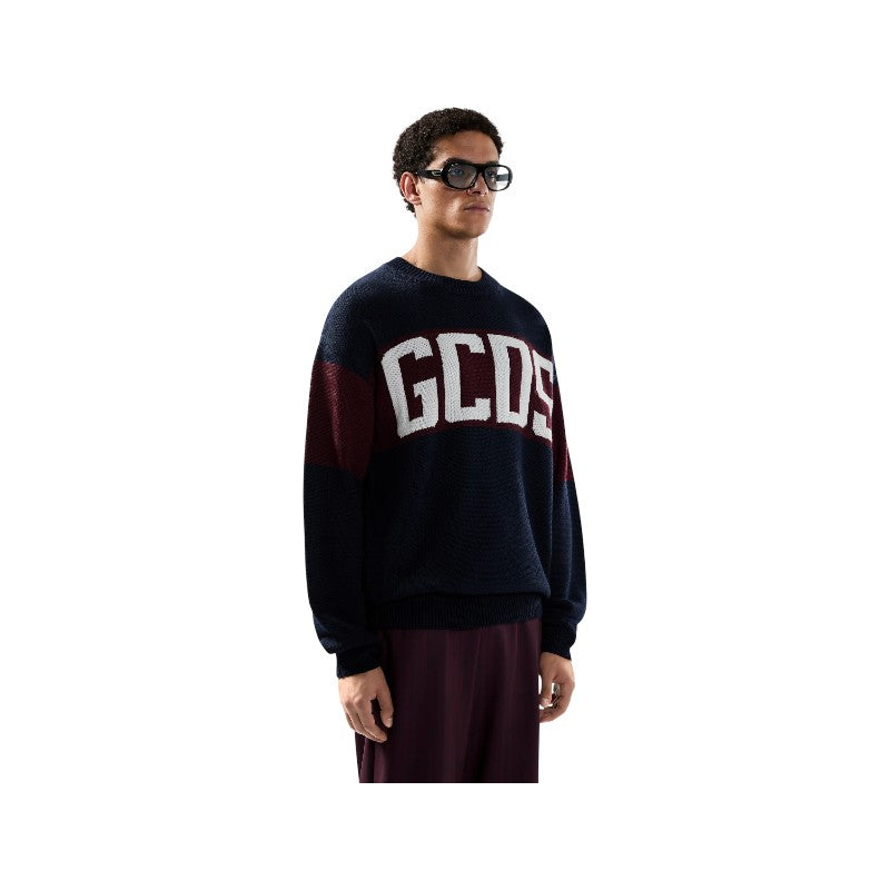 Maglione girocollo in maglia rasata con maxi logo GCDS intarsiato sul petto e bande a contrasto sulle maniche. Collo, polsini e fondo a costine.
