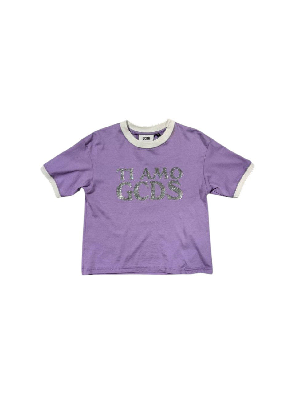 T-shirt lilla GCDS con scritta glitter "TI AMO GCDS" e rifiniture bianche.