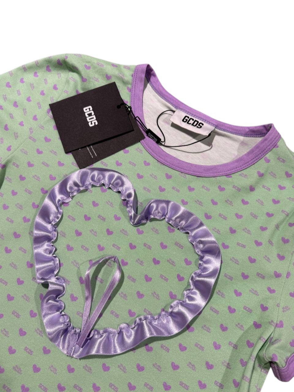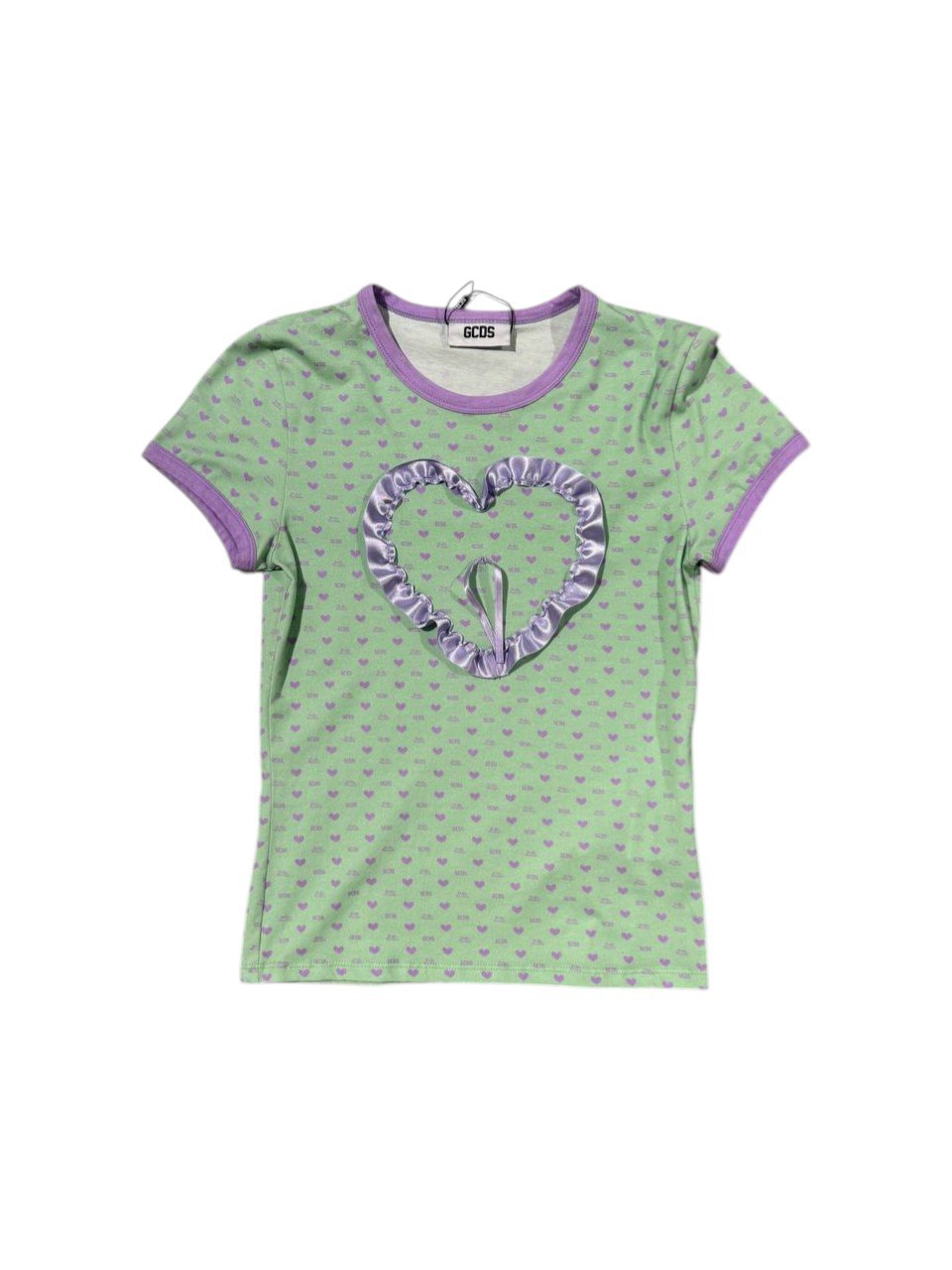 T-shirt verde menta GCDS con cuoricini e mini logo lilla e cuore frontale cucito in rilievo.