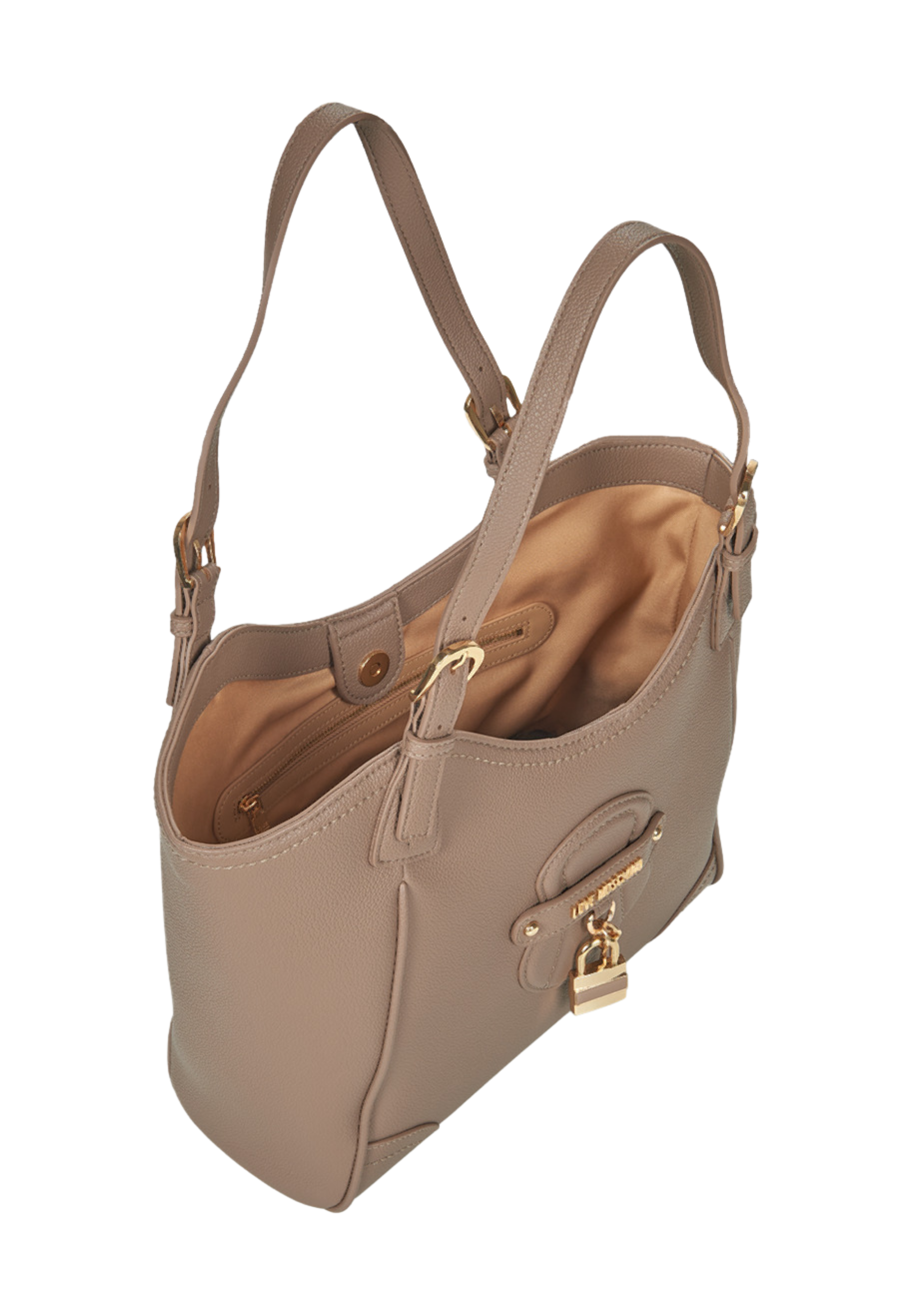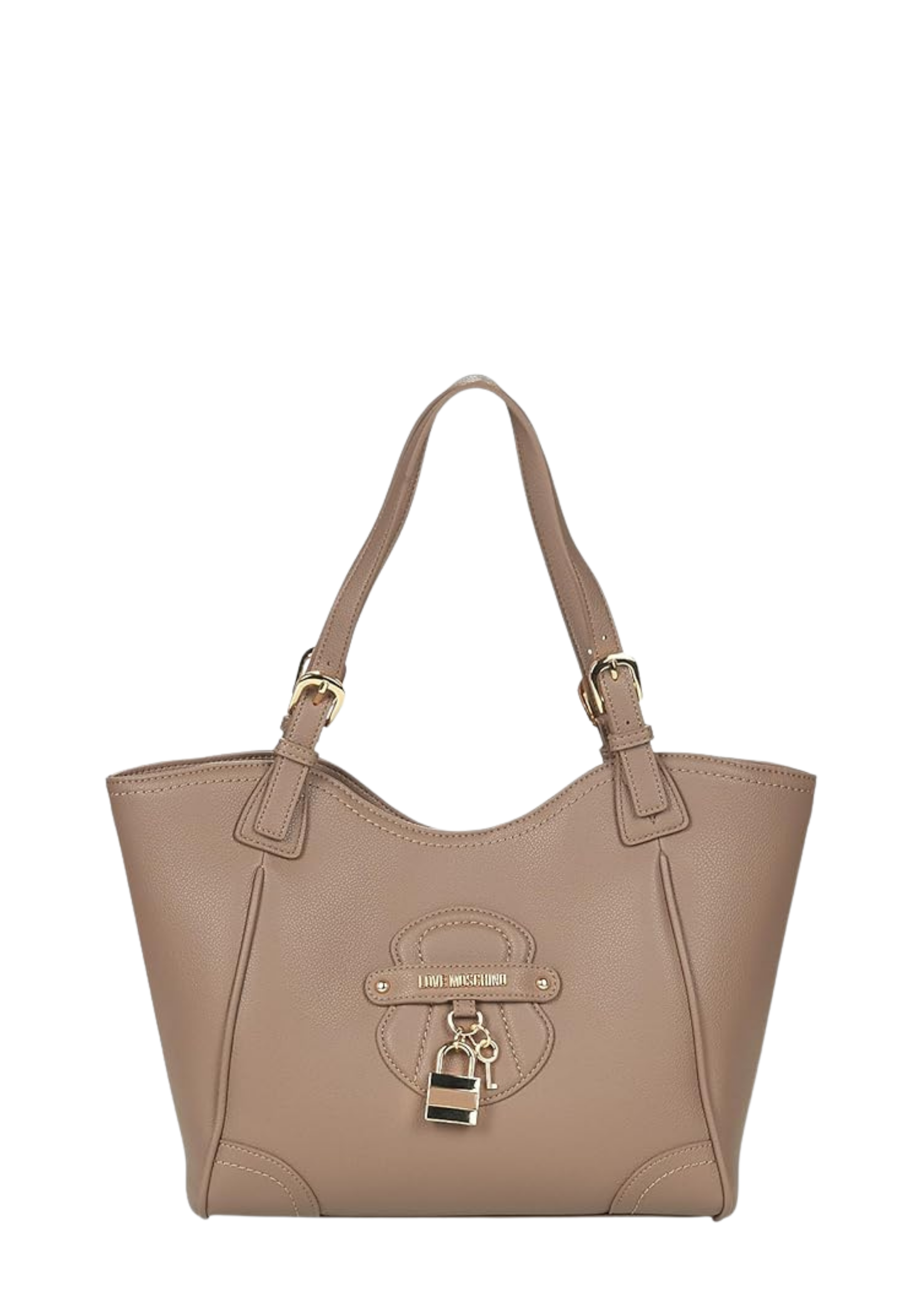 Borsa a mano - Dimensioni : 35cm x 35cm x 28cm. - Scomparti: Uno scompartimento con una tasca interna con cerniera e una senza chiusura- Chiusura: Clip di chiusura in metallo - Fantasia: Monocromo - Dettagli: Impunture decorative a contrasto, angoli rinforzati e charm esclusivo con logo Love Moschino che aggiungono carattere e riconoscibilità al design- Modalità di utilizzo: Dotata di manici in pelle sintetica con fibbie regolabili in metallo dorato che permettono di personalizzare la lunghezza per il massimo comfort durante il trasporto