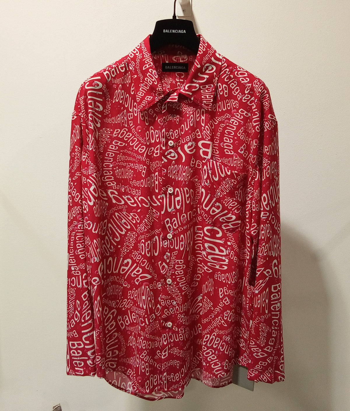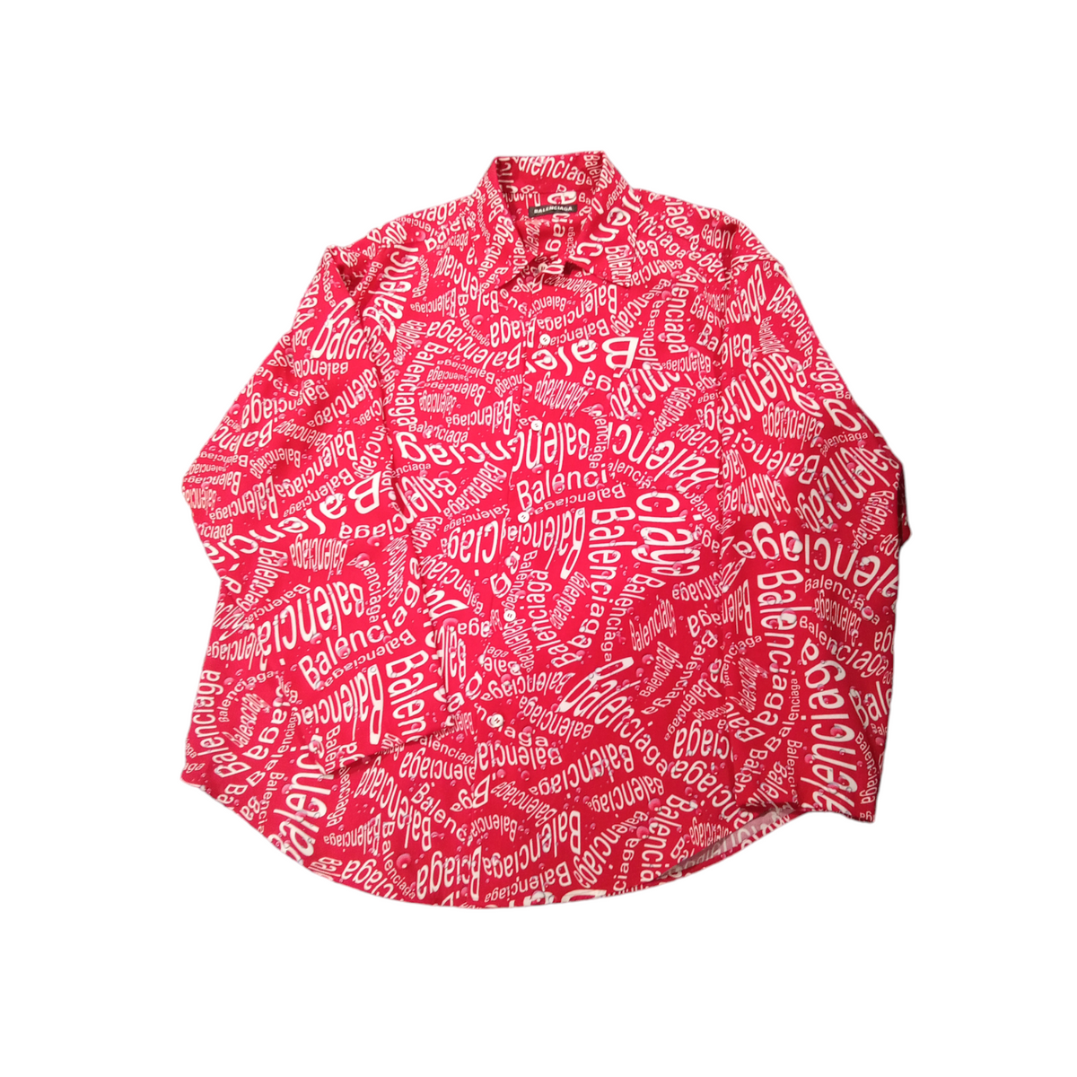 Camicia realizzata in popeline di viscosa di colore rosso, caratterizzata da stampa Balenciaga all-over a contrasto. Chiusura con 6 bottoni sul davanti. Ottima per chi ama le grandi firme.