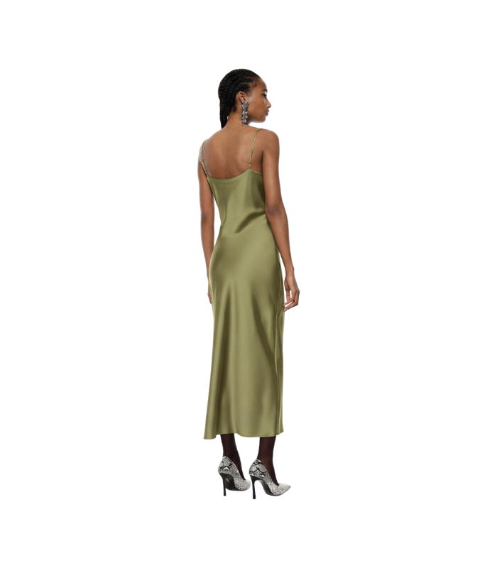 Abito con spalline sottili regolabili e profondo scollo a v, presenta un drappeggio e uno spacco laterale.