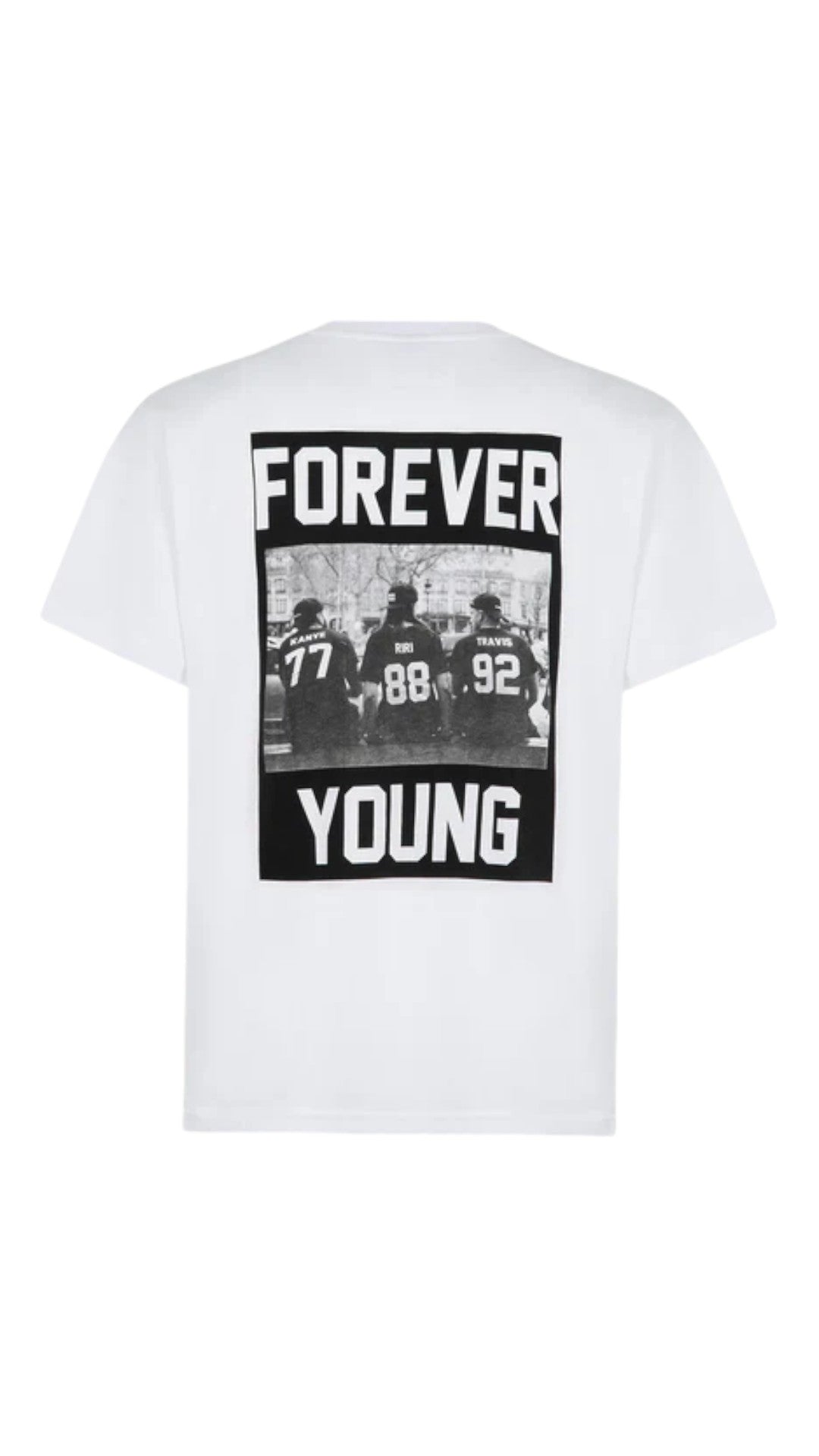 T-shirt in pregiato cotone di colore bianco con iconica stampa FOREVER YOUNG sul retro, patch logata sul fondo nella parte anteriore, vestibilità regolare.