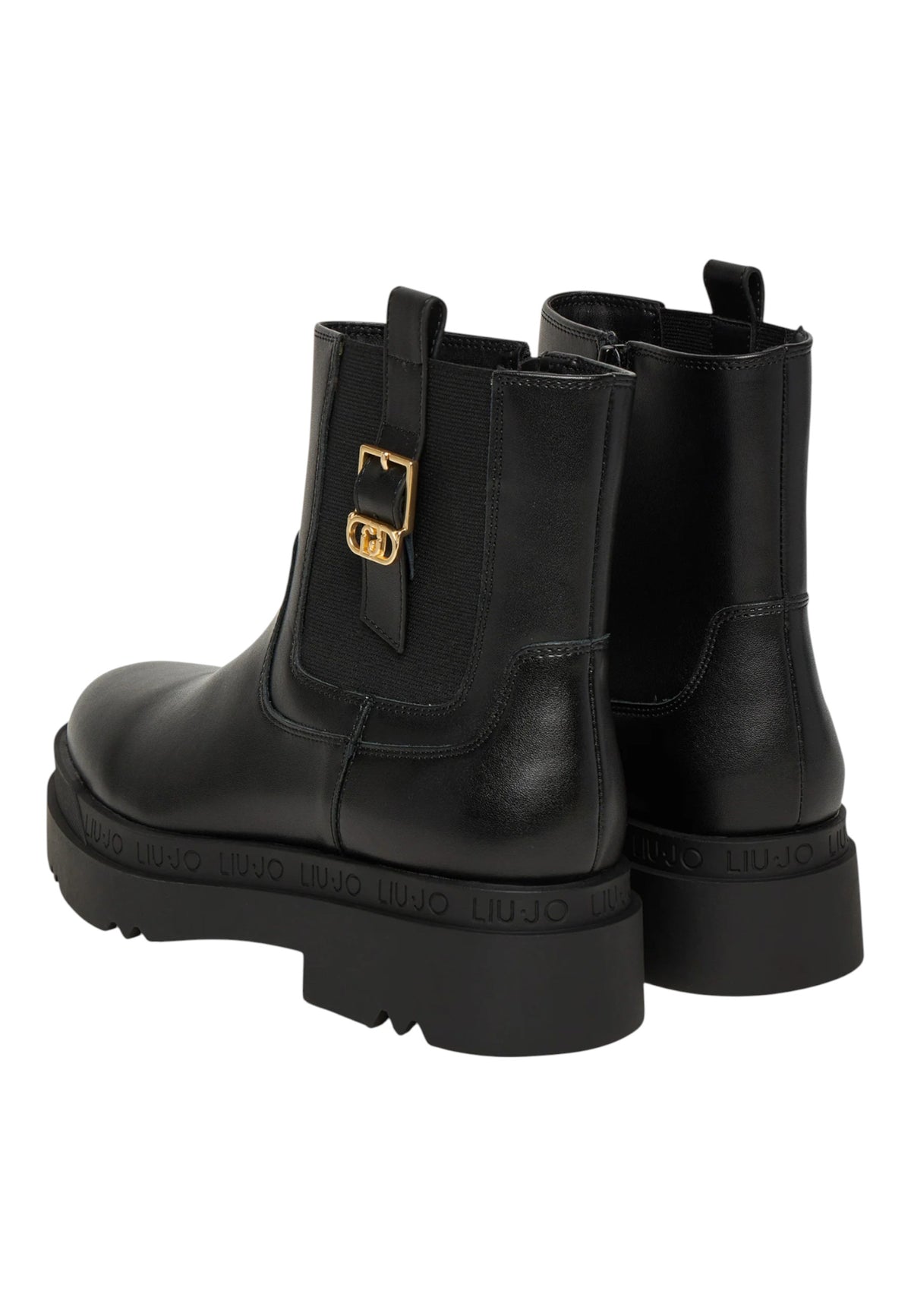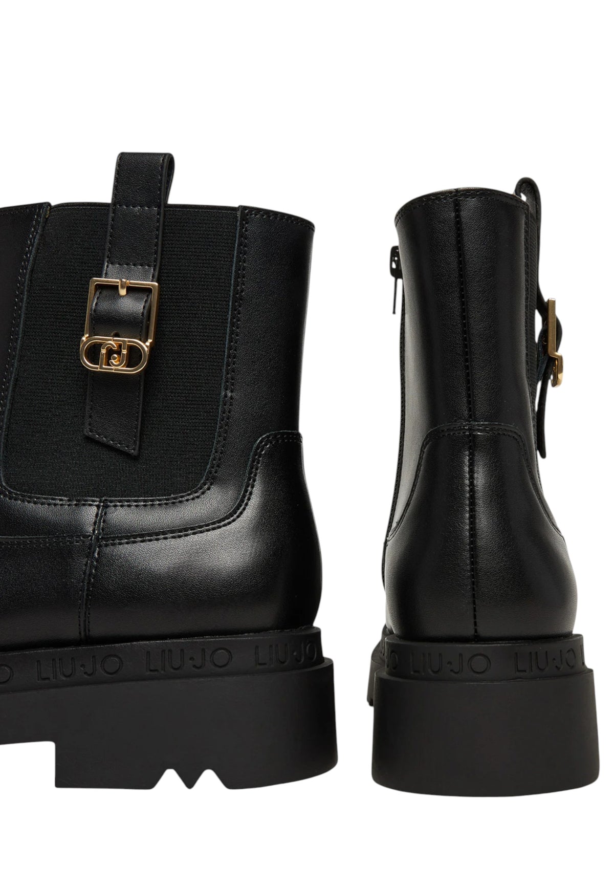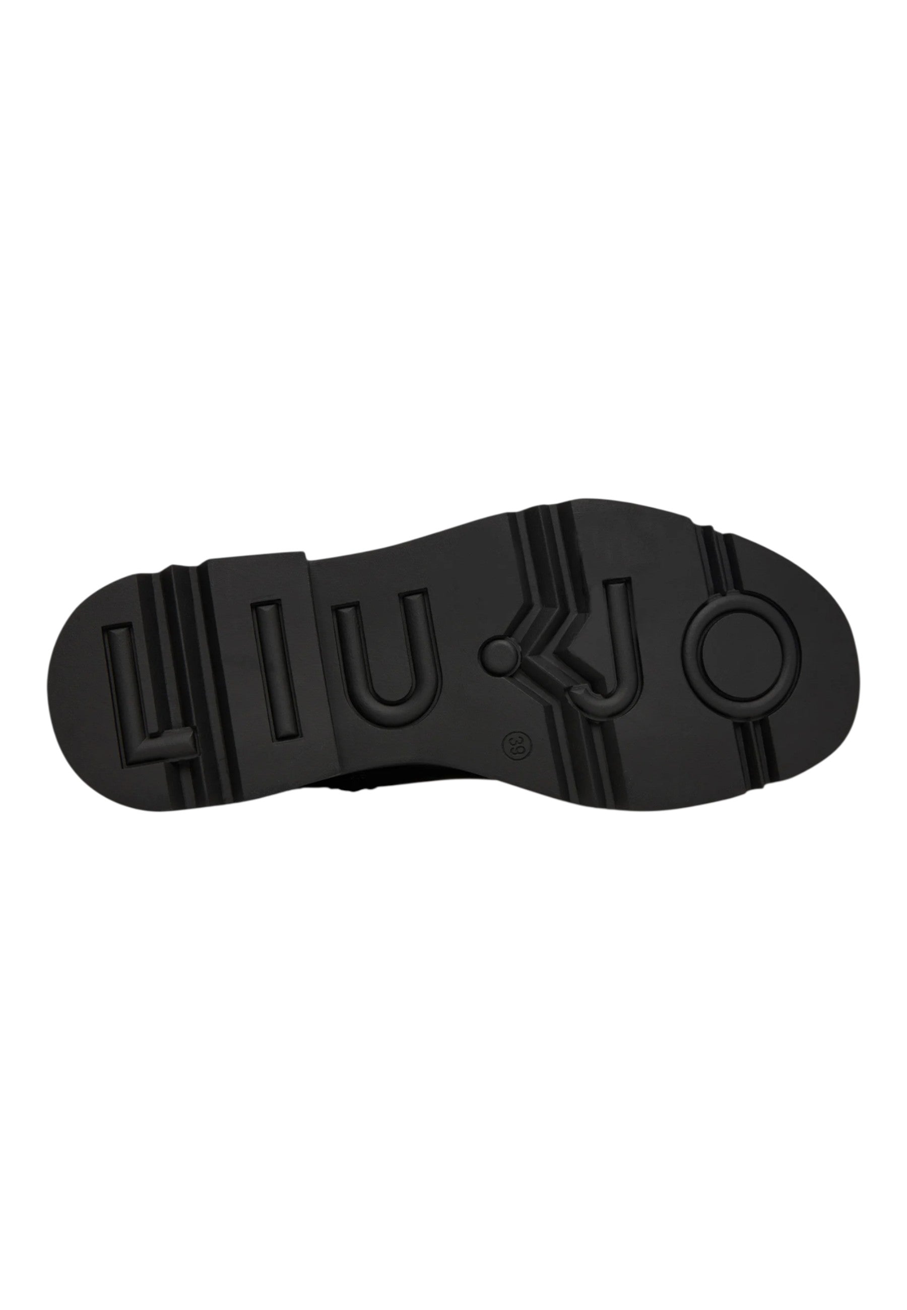 Stivaletti "ankle boot" firmati Liu Jo alti 20cm con tomaia in pelle, chiusura con zip sul lato interno, inserto elastico per facilitare l'inserimento del piede, fibbia decorativa con logo monogram, suola platform alta 5cm con logo inciso.