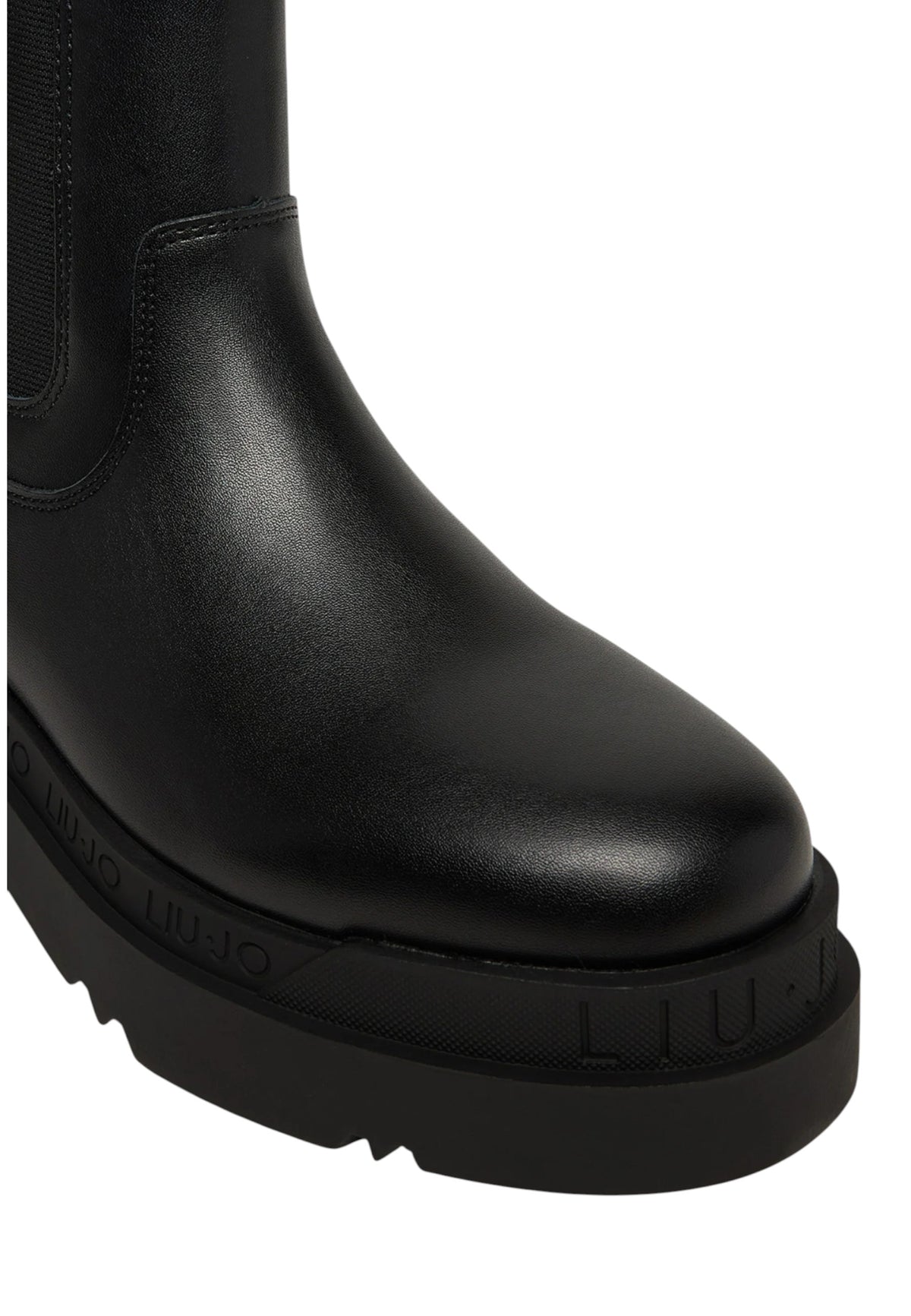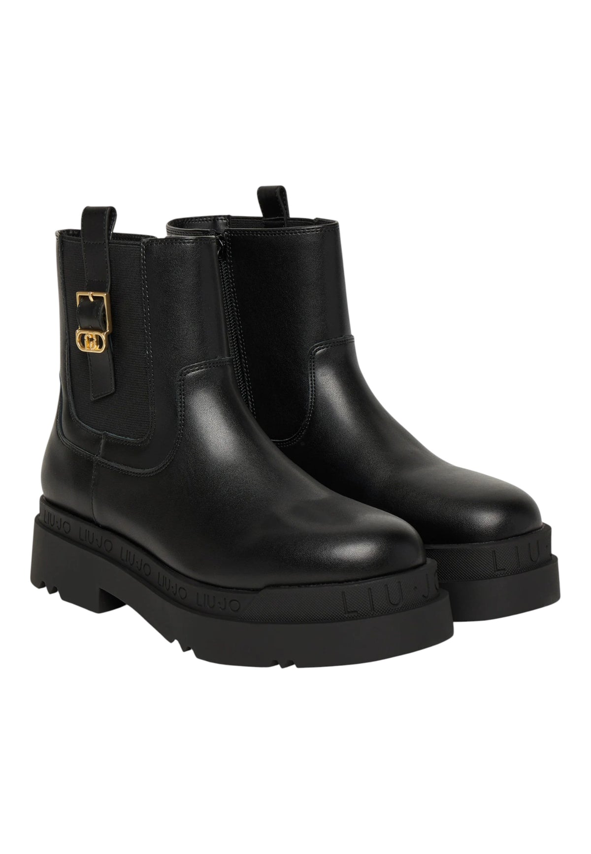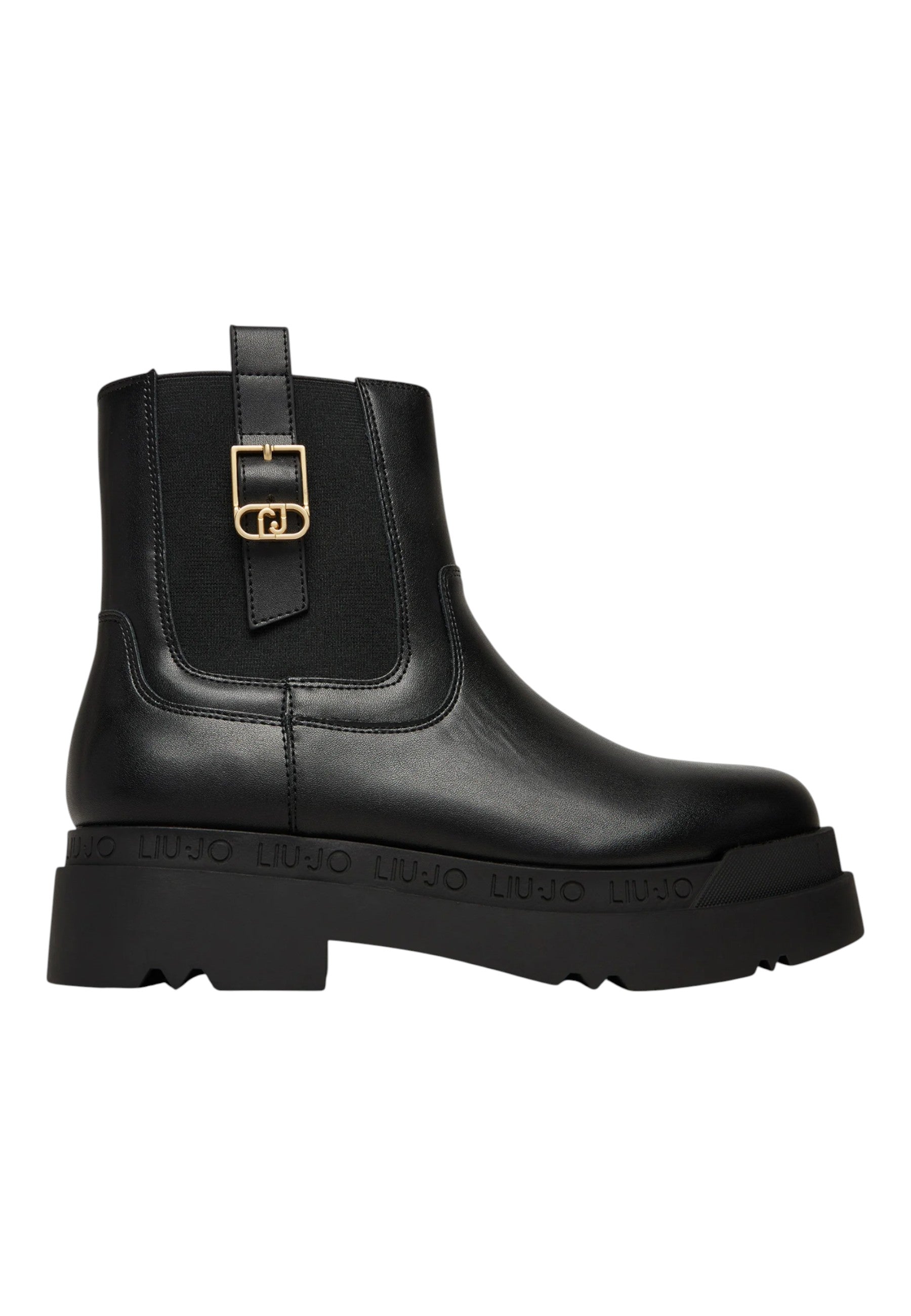 Stivaletti "ankle boot" firmati Liu Jo alti 20cm con tomaia in pelle, chiusura con zip sul lato interno, inserto elastico per facilitare l'inserimento del piede, fibbia decorativa con logo monogram, suola platform alta 5cm con logo inciso.