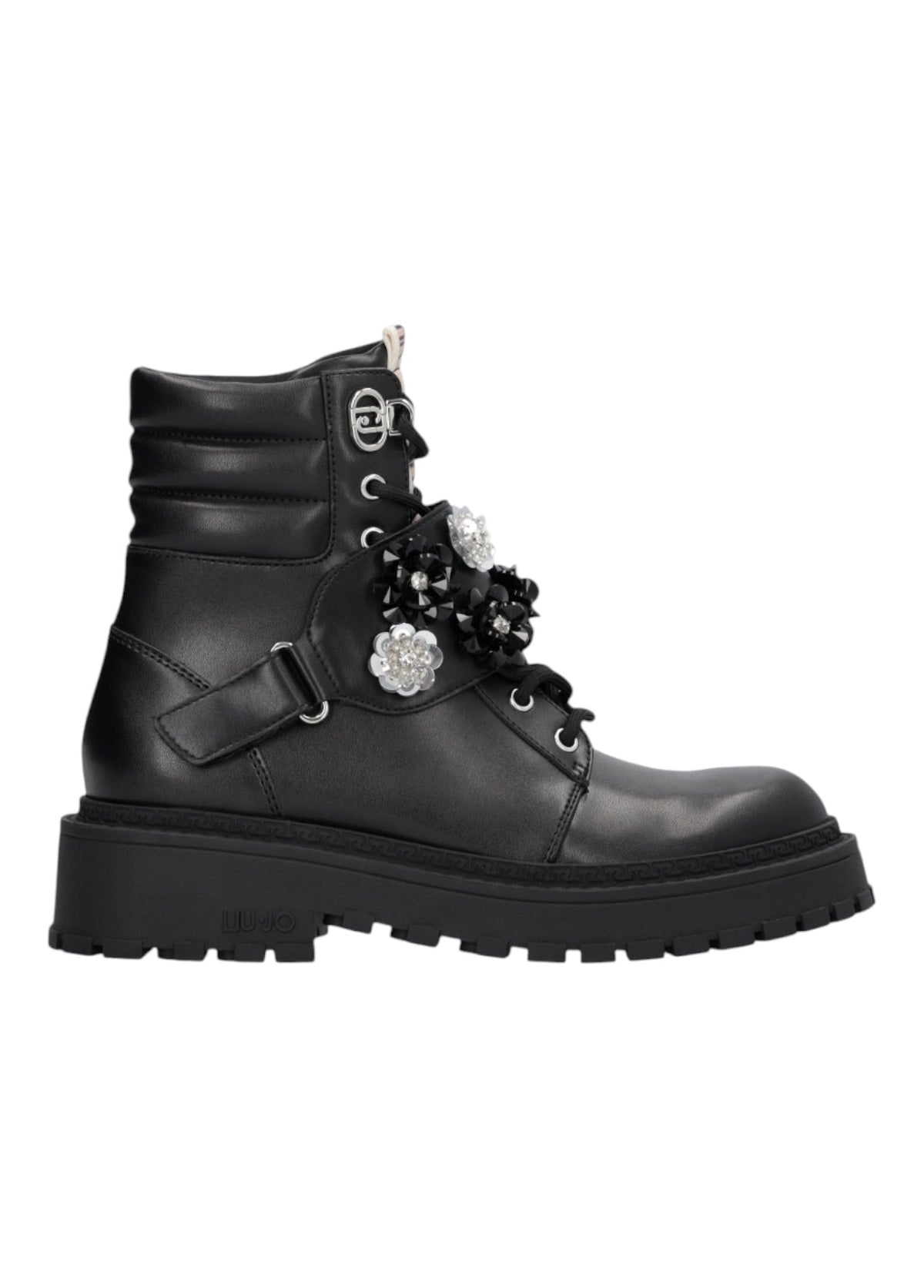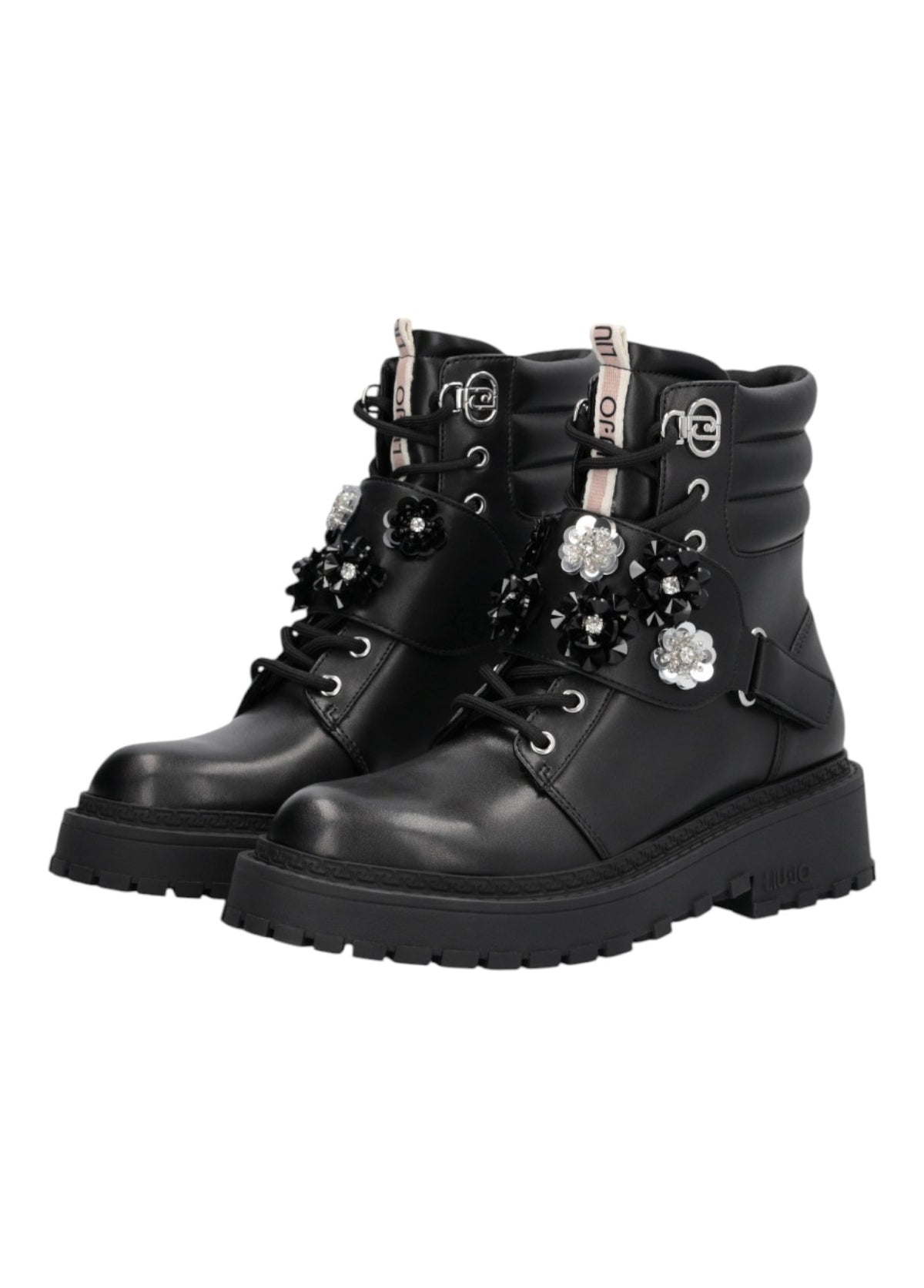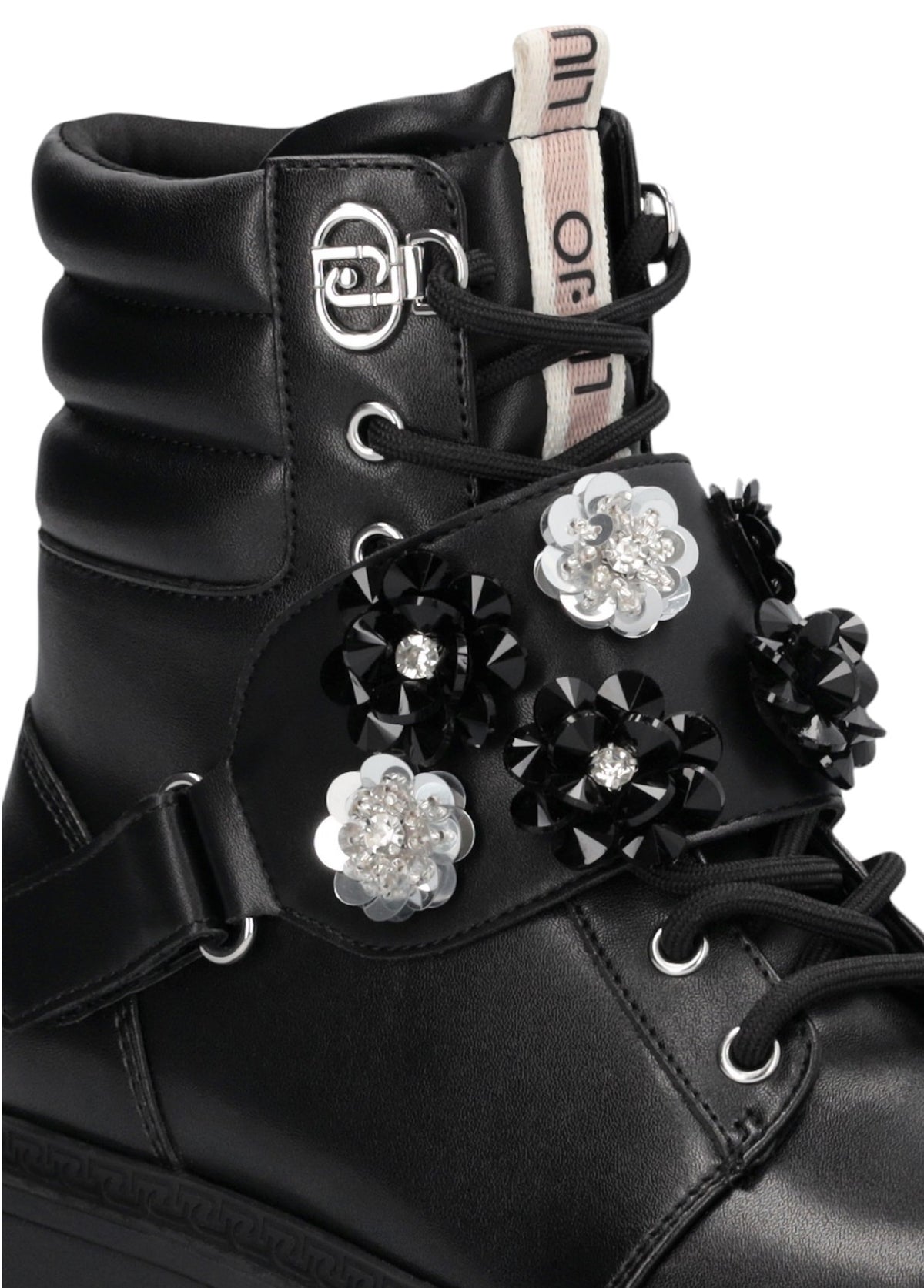 Anfibi firmati Liu Jo in pelle, patta con applicazioni floreali, chiusura con velcro, occhiello con logo monogram, loop con logo stampato, fondo con guardolo logato, battistrada dentellato e suola alta 5 cm.