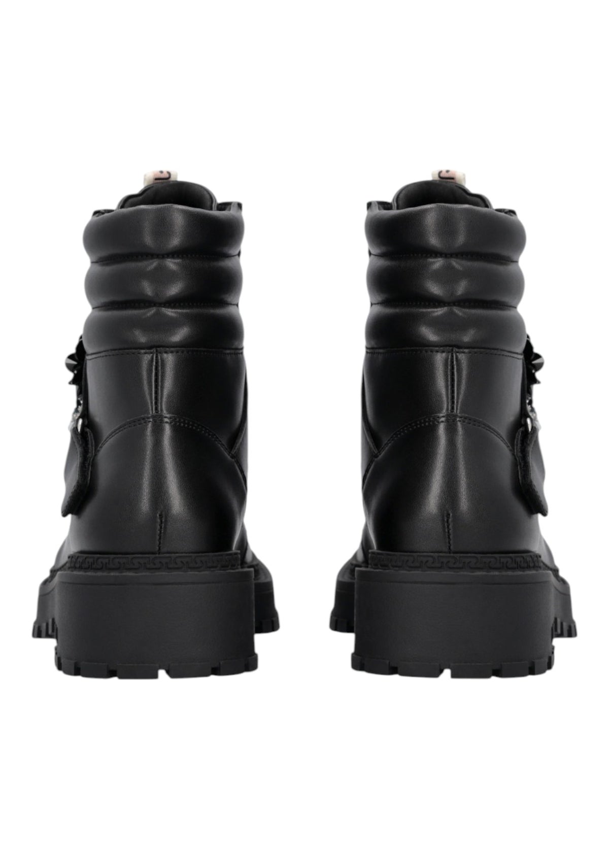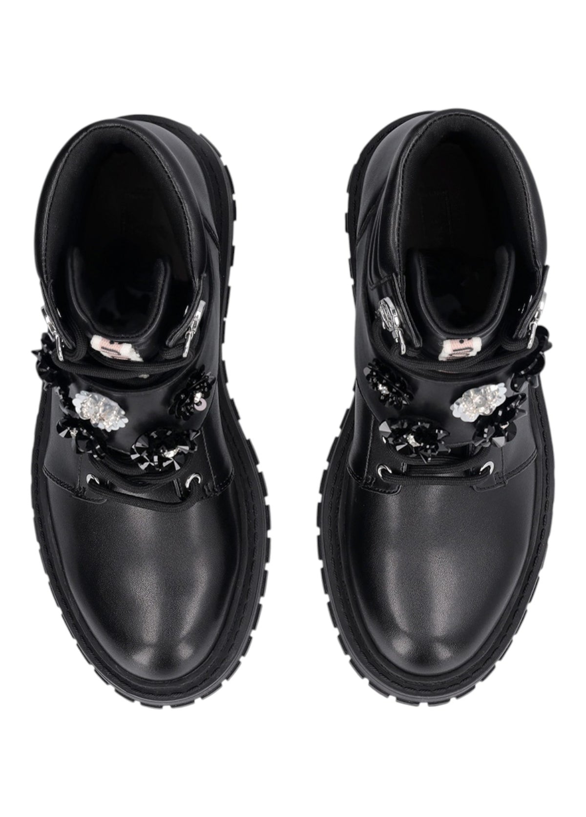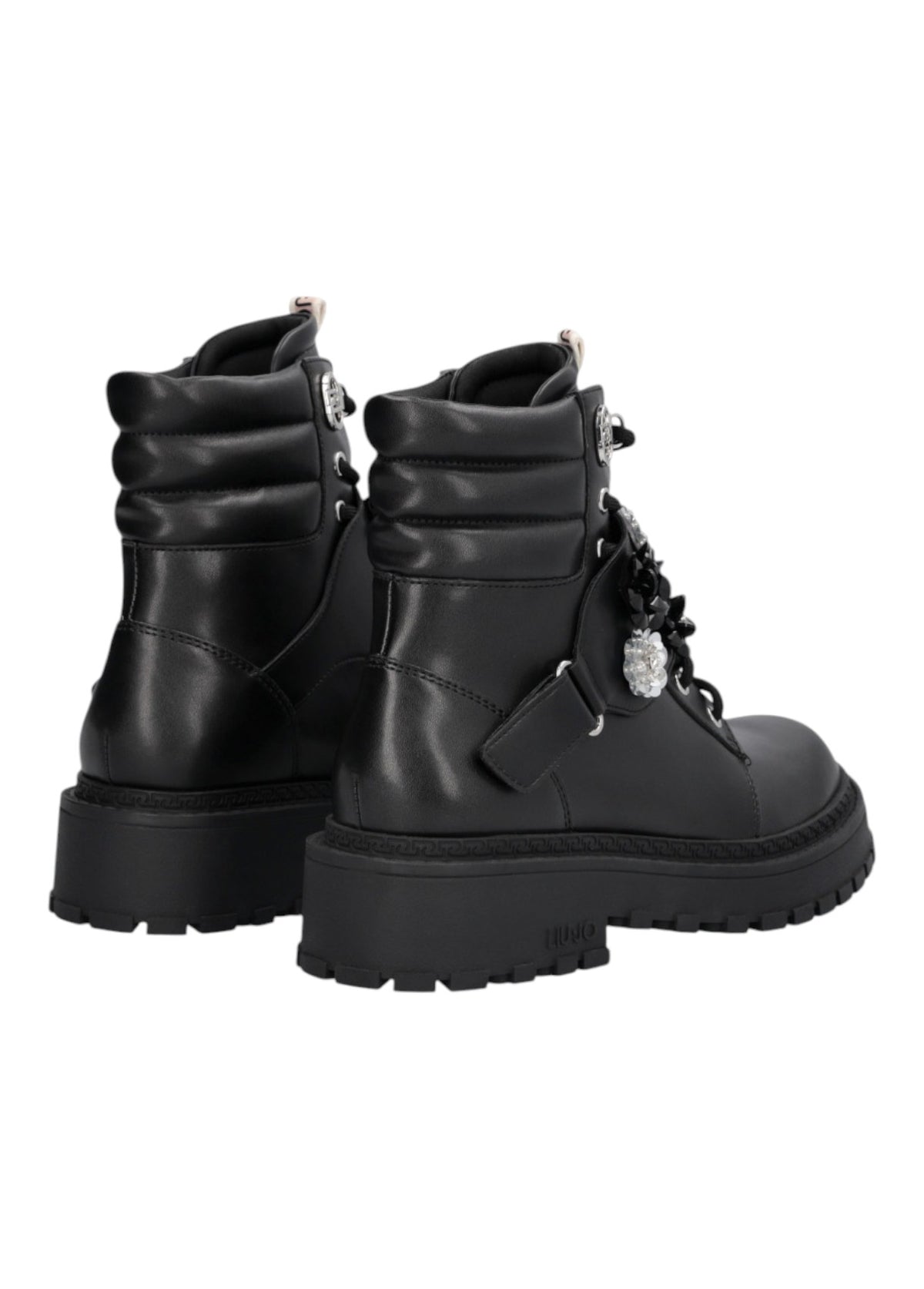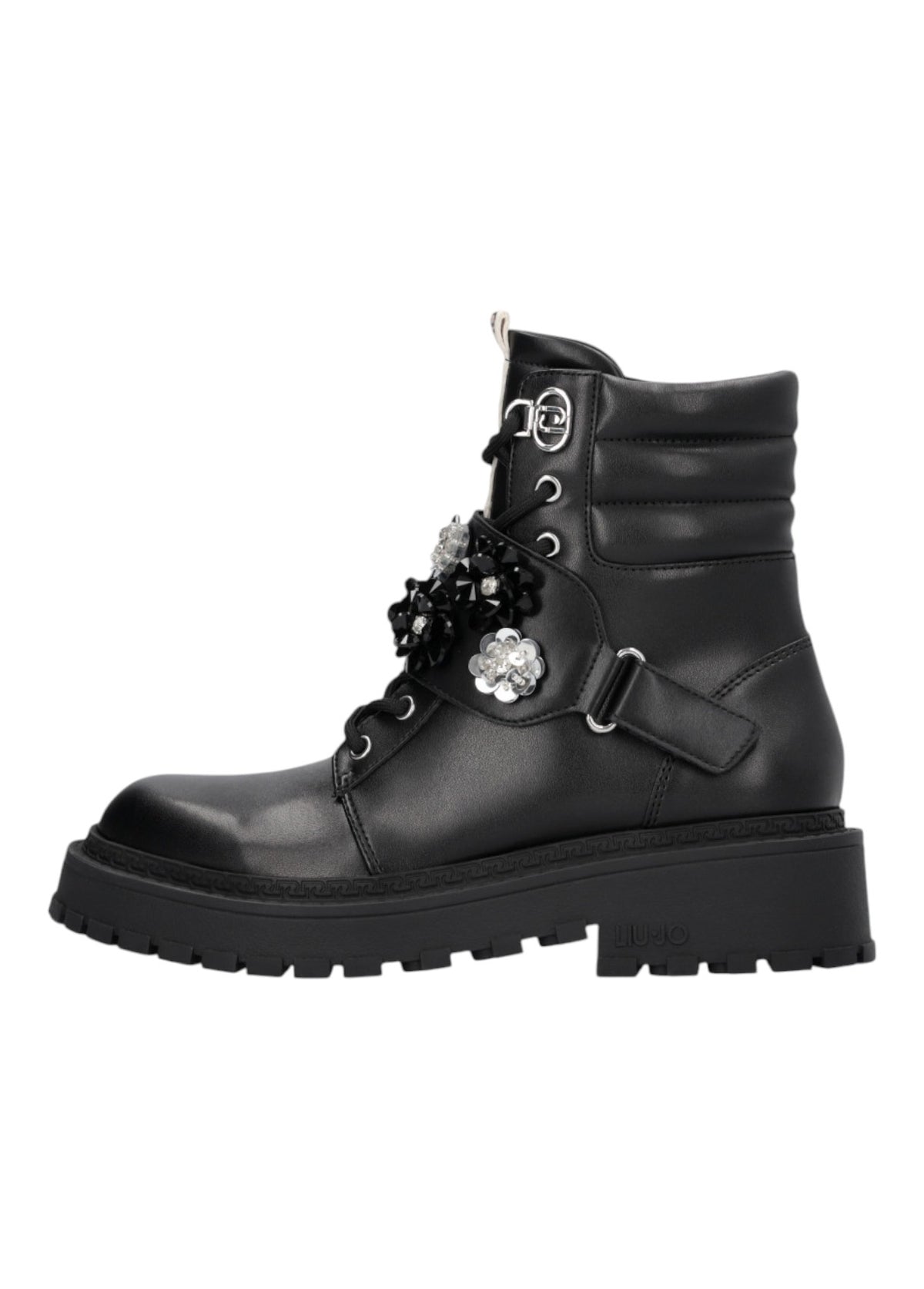 Anfibi firmati Liu Jo in pelle, patta con applicazioni floreali, chiusura con velcro, occhiello con logo monogram, loop con logo stampato, fondo con guardolo logato, battistrada dentellato e suola alta 5 cm.