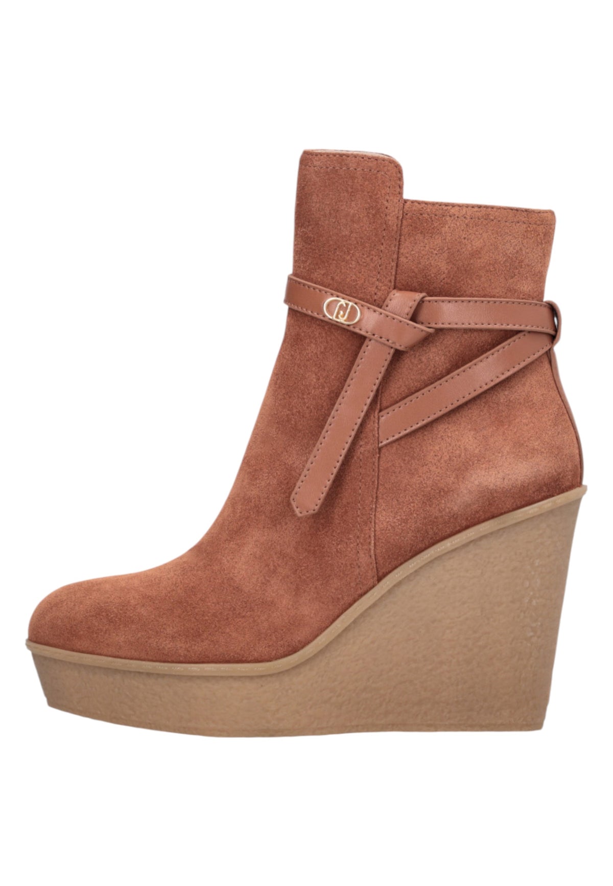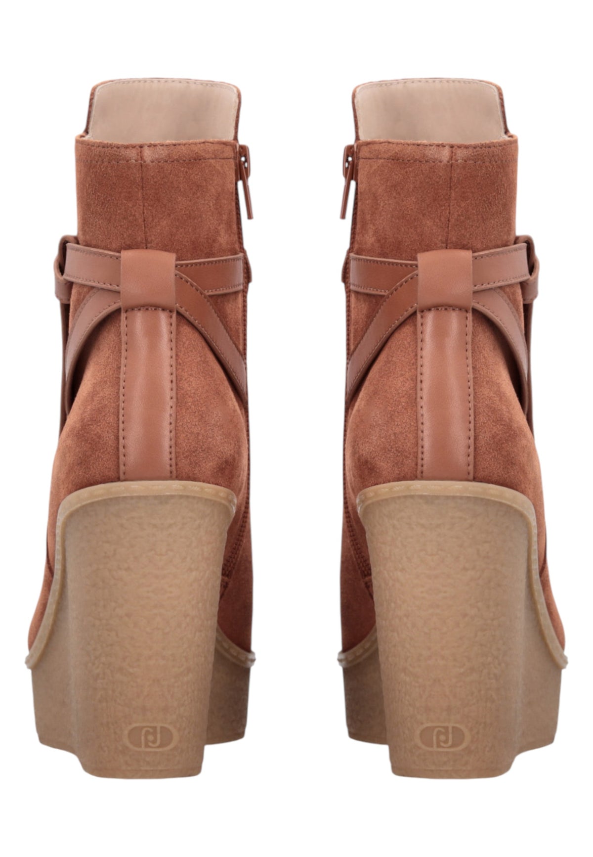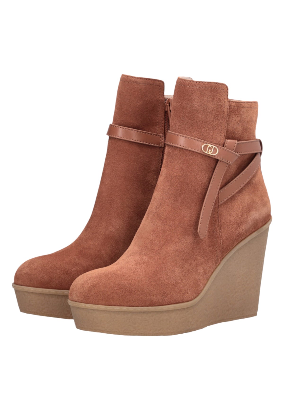 Stivaletti firmati LIU JO con tomaia in suede, nastri decorativi con logo monogram, chiusura con zip interna, fondo con zeppa alta 10cm, finitura effetto para.