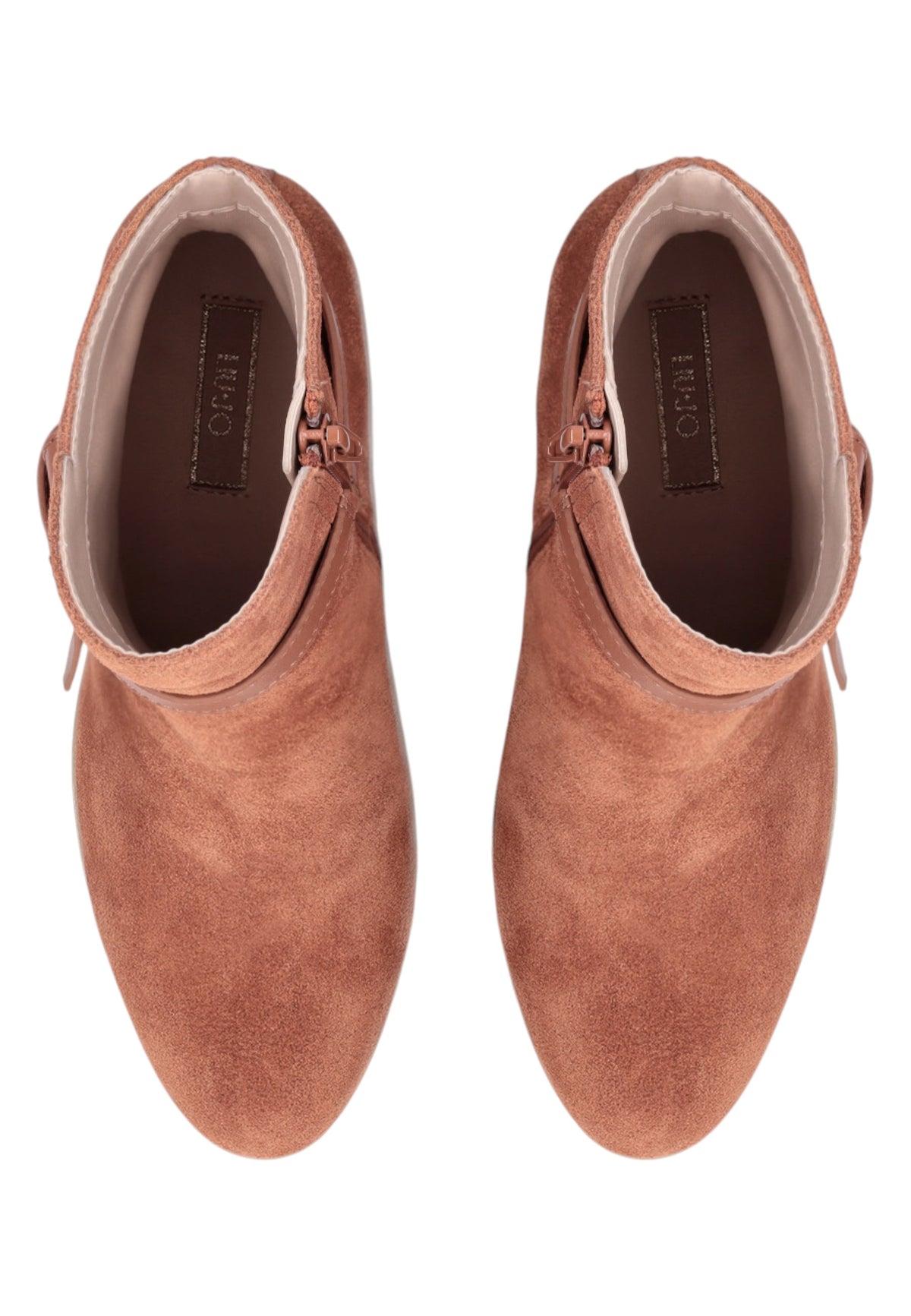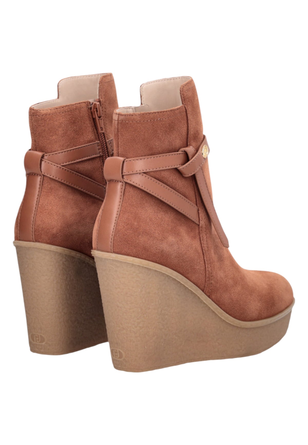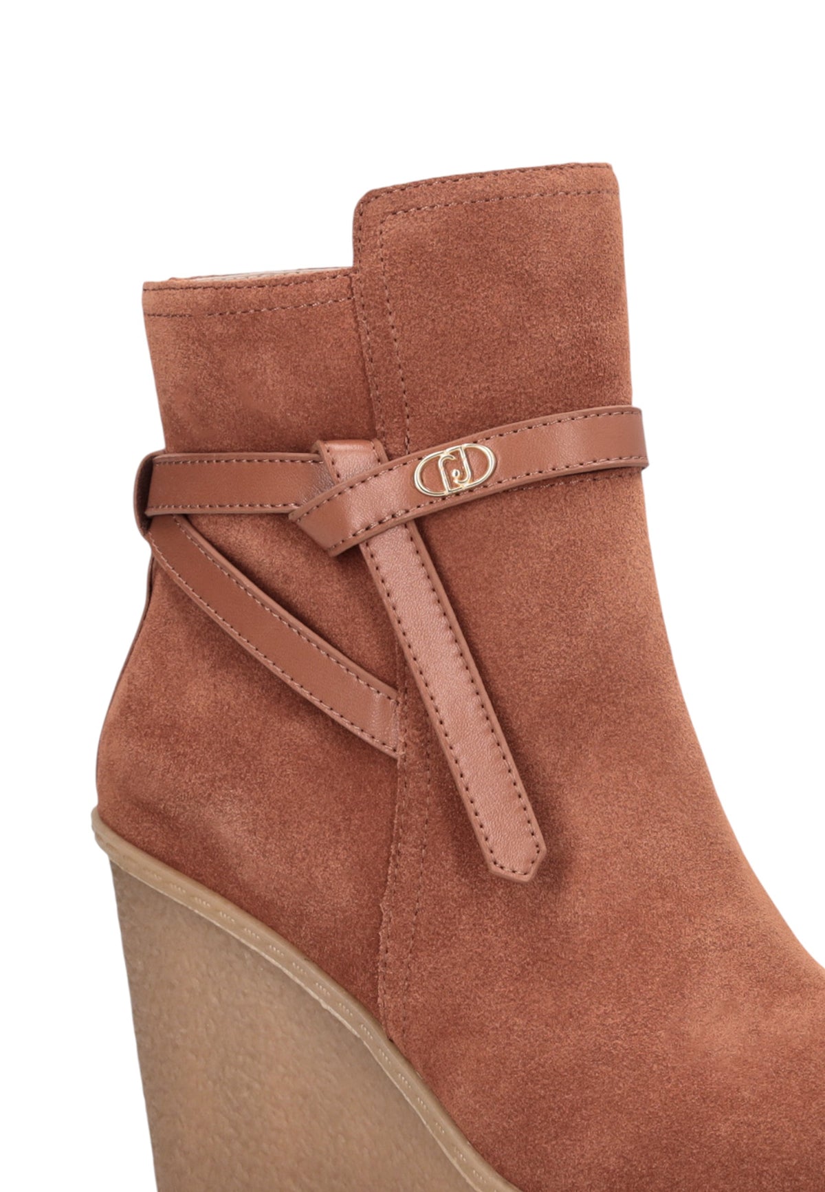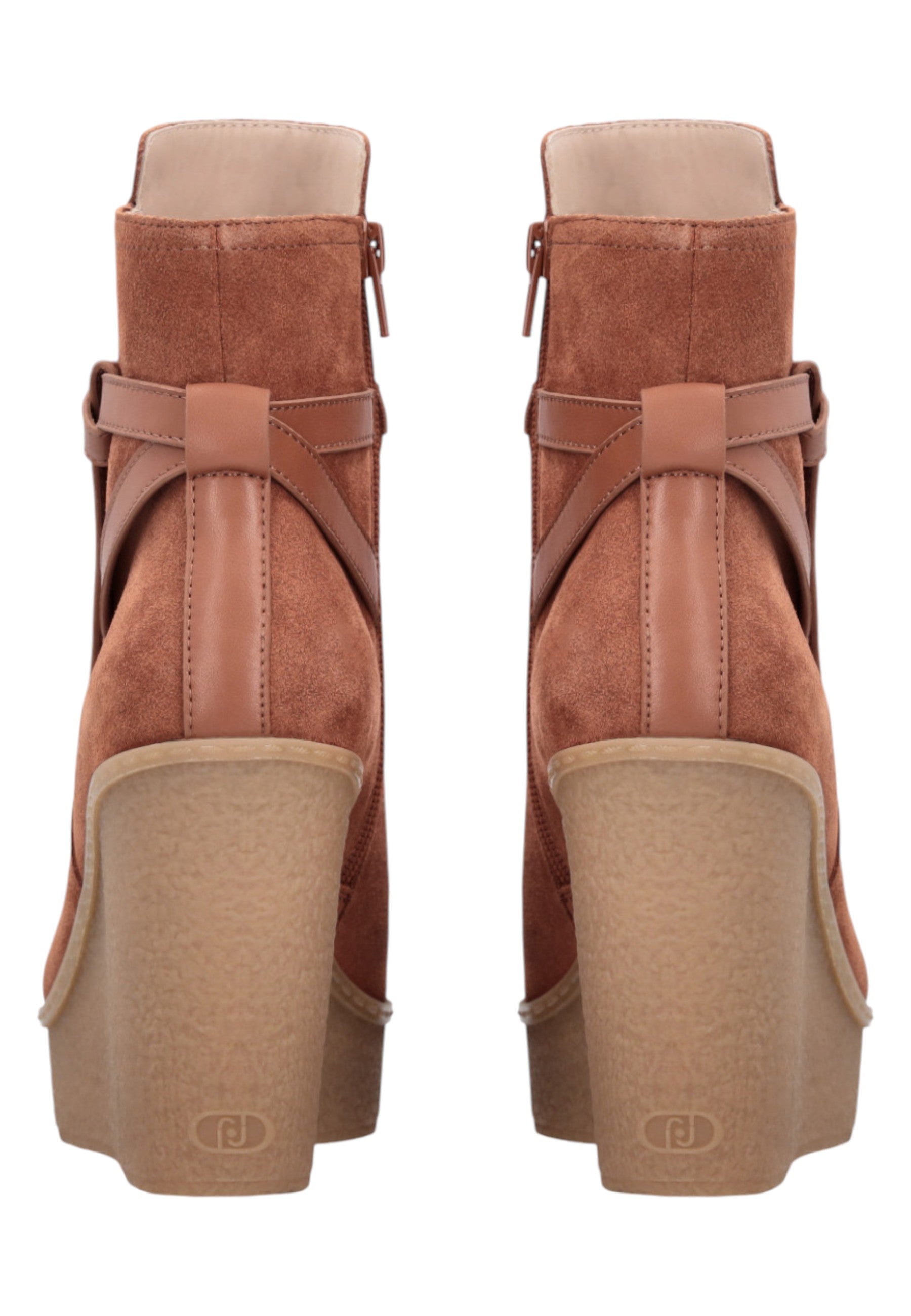 Stivaletti firmati LIU JO con tomaia in suede, nastri decorativi con logo monogram, chiusura con zip interna, fondo con zeppa alta 10cm, finitura effetto para.