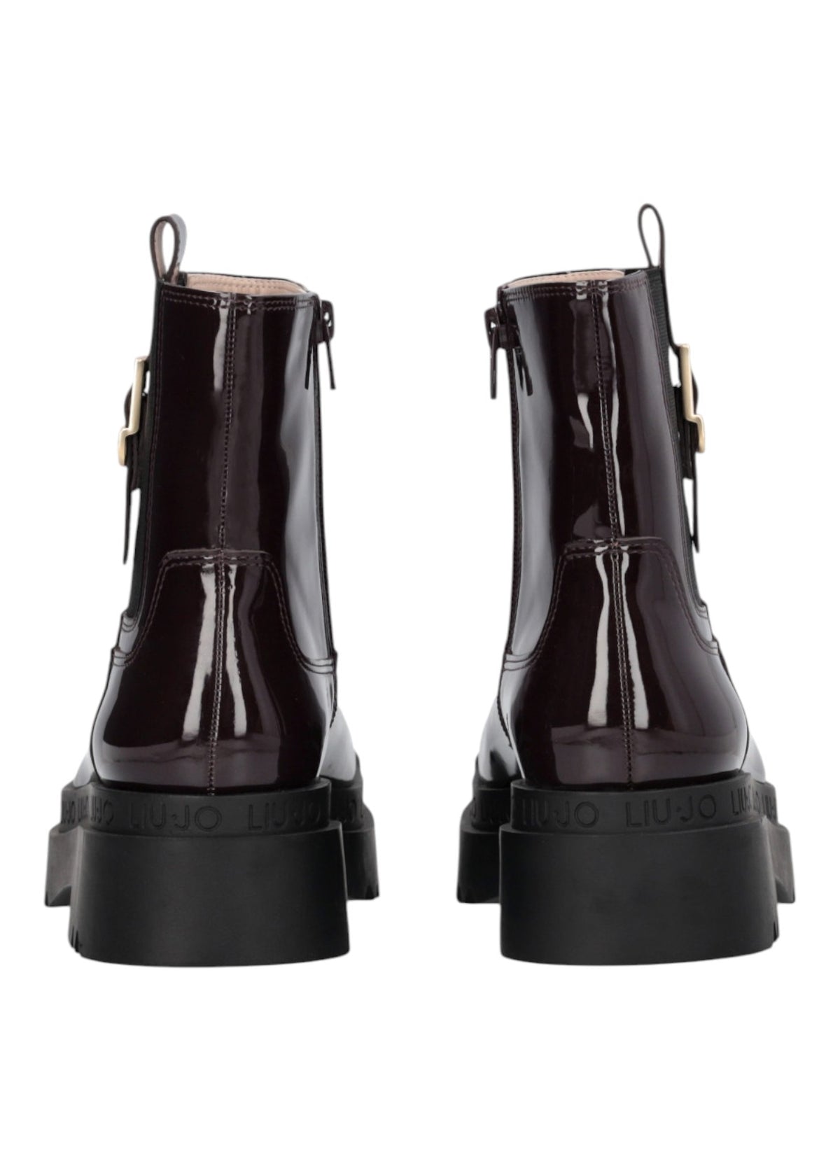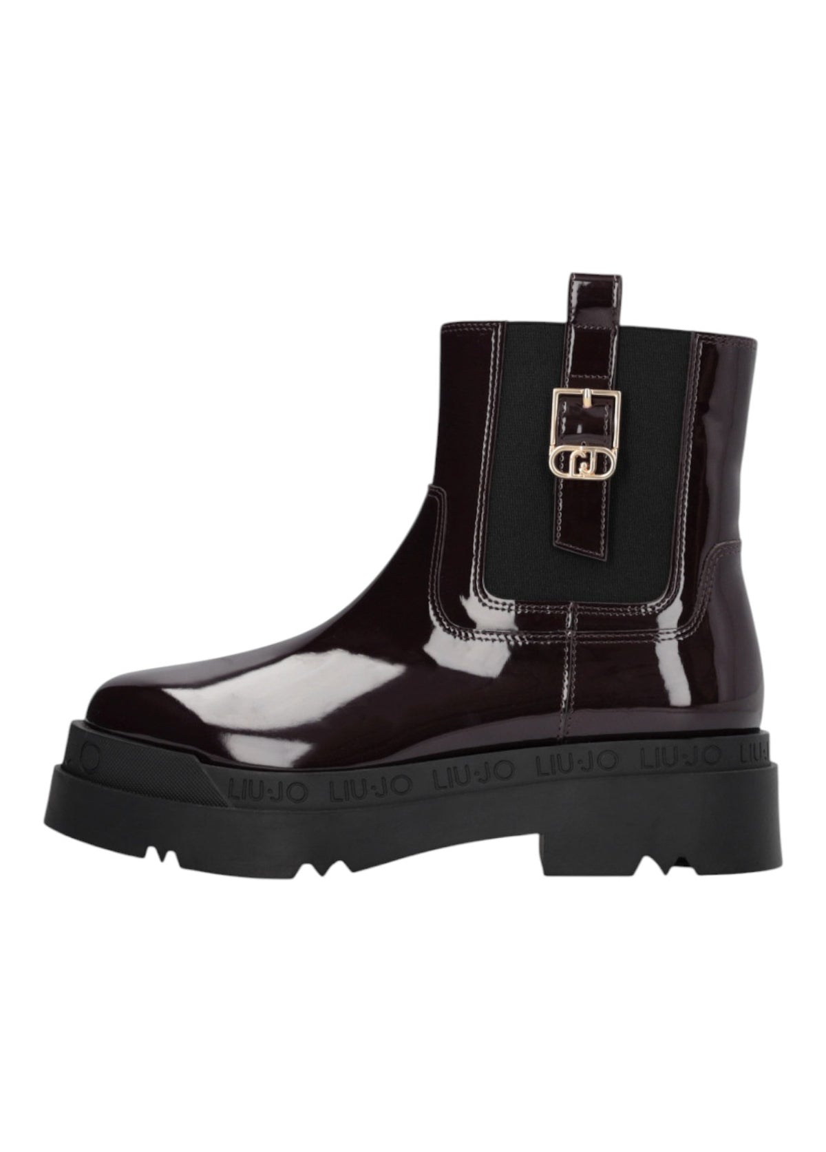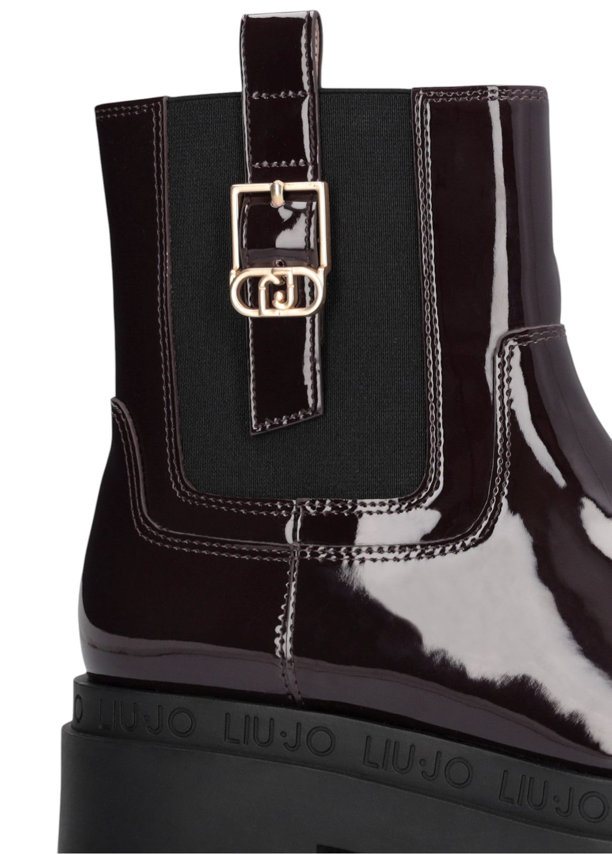 Stivaletti "ankle boot" firmati Liu Jo alti 20cm con tomaia in vernice, chiusura con zip sul lato interno, inserto elastico per facilitare l'inserimento del piede, fibbia decorativa con logo monogram, suola platform alta 5cm con logo inciso.