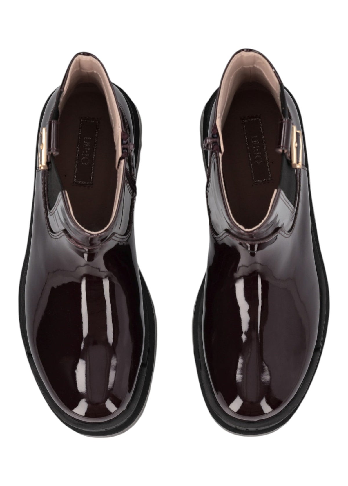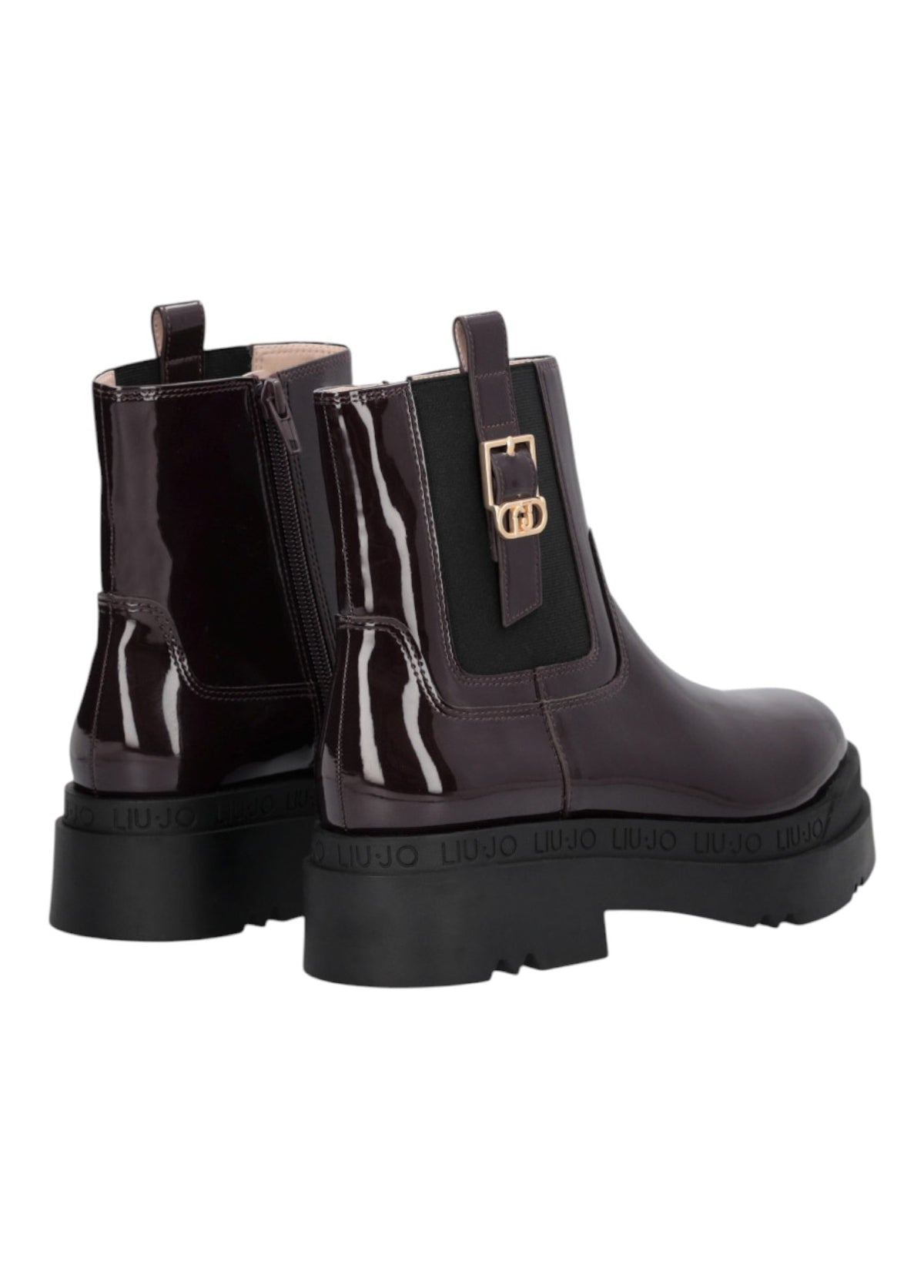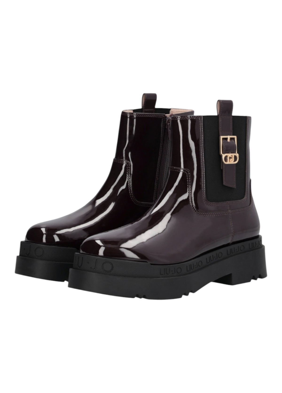 Stivaletti "ankle boot" firmati Liu Jo alti 20cm con tomaia in vernice, chiusura con zip sul lato interno, inserto elastico per facilitare l'inserimento del piede, fibbia decorativa con logo monogram, suola platform alta 5cm con logo inciso.