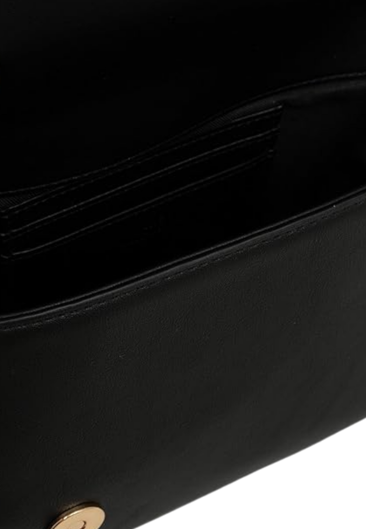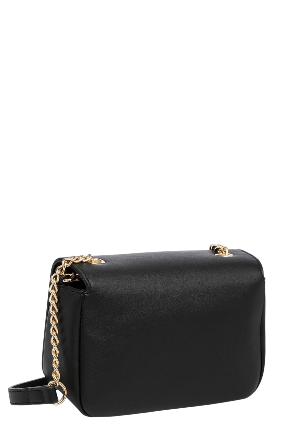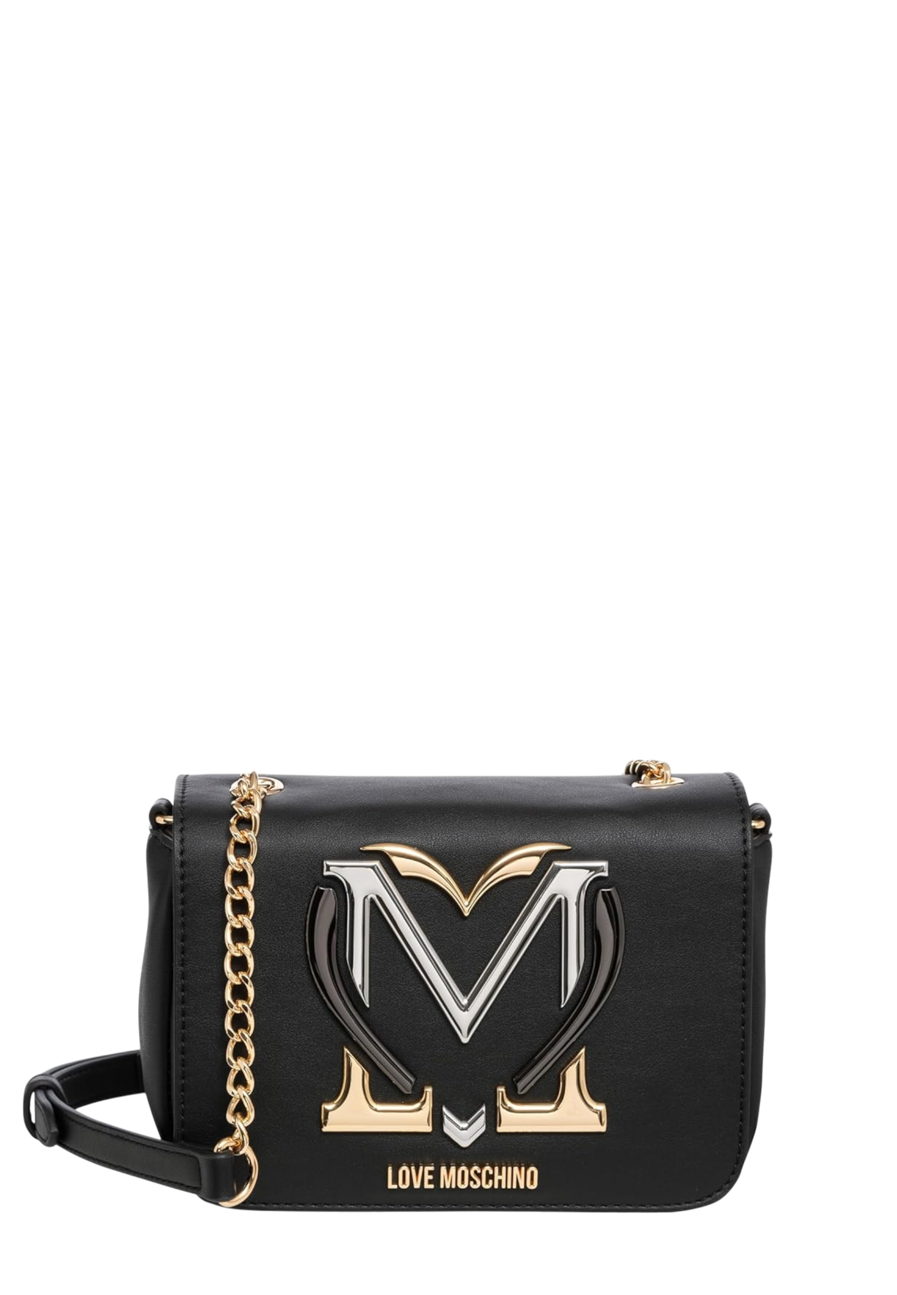 Borsa firmata Moschino in ecopelle opaca, chiusura magnetica doppia, scomparto interno, taschino portacarte, pouch logata e tracolla a catena dorata con manico regolabile in ecopelle.