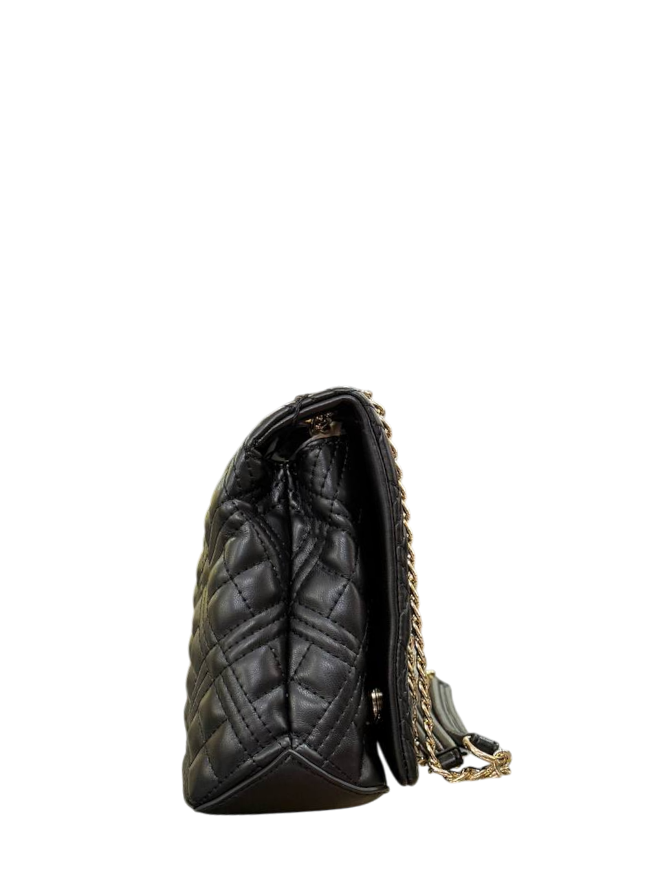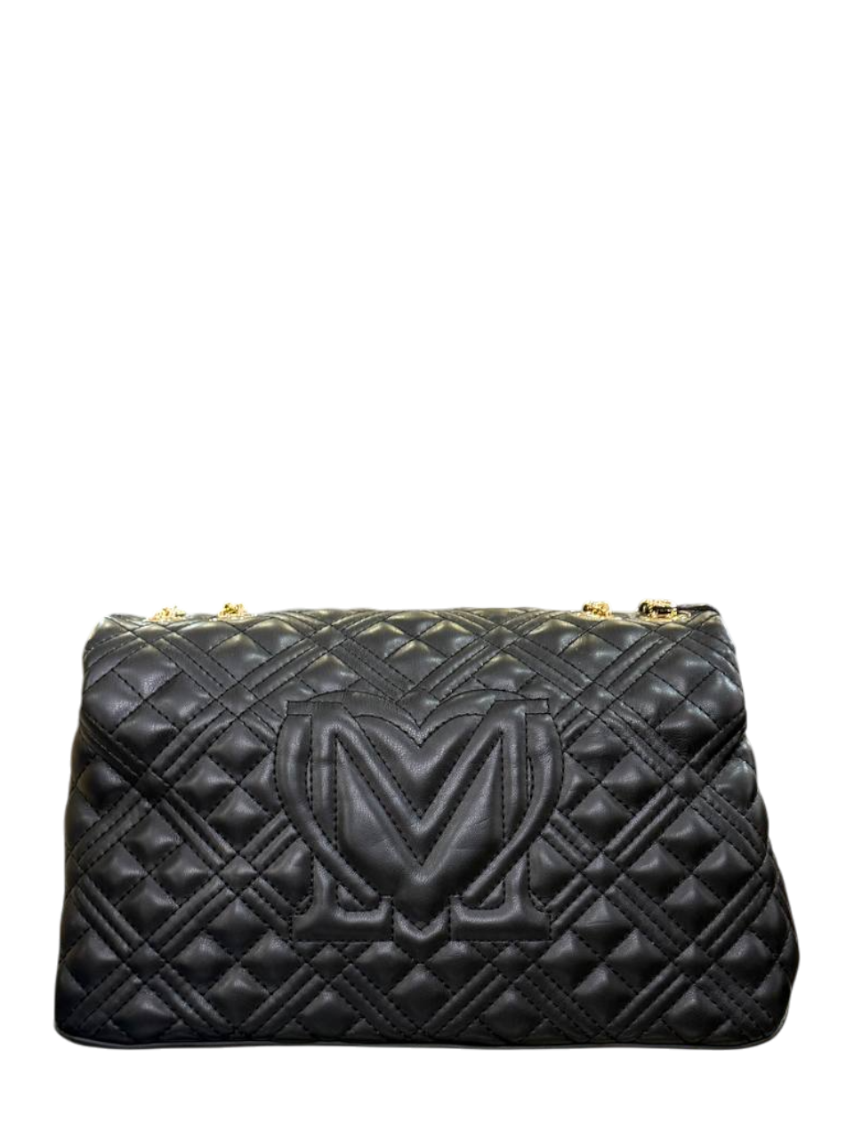 Borsa firmata Moschino in ecopelle, doppia chiusura magnetica, tre scomparti interni di cui uno chiudibile con zip con due tasche interne, pouch logata e tracolla a catena dorata con manico in ecopelle.