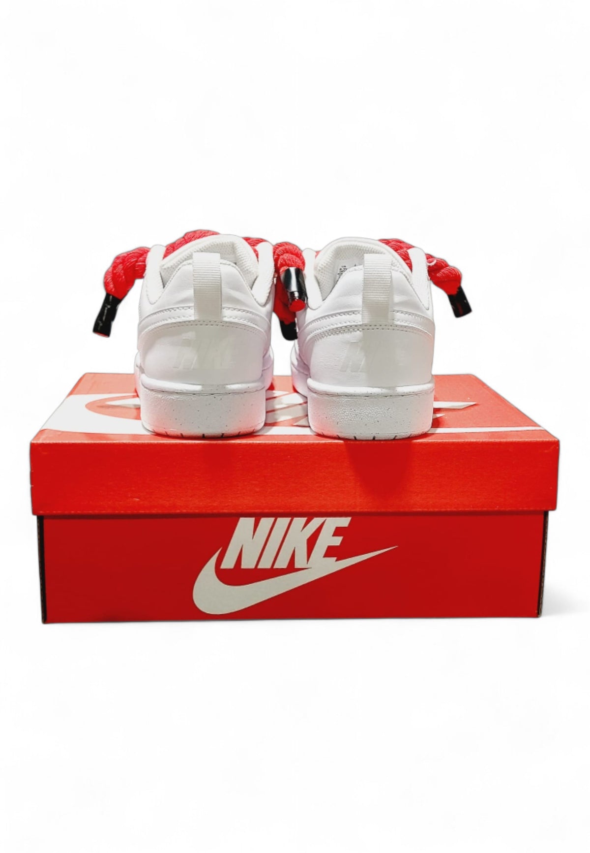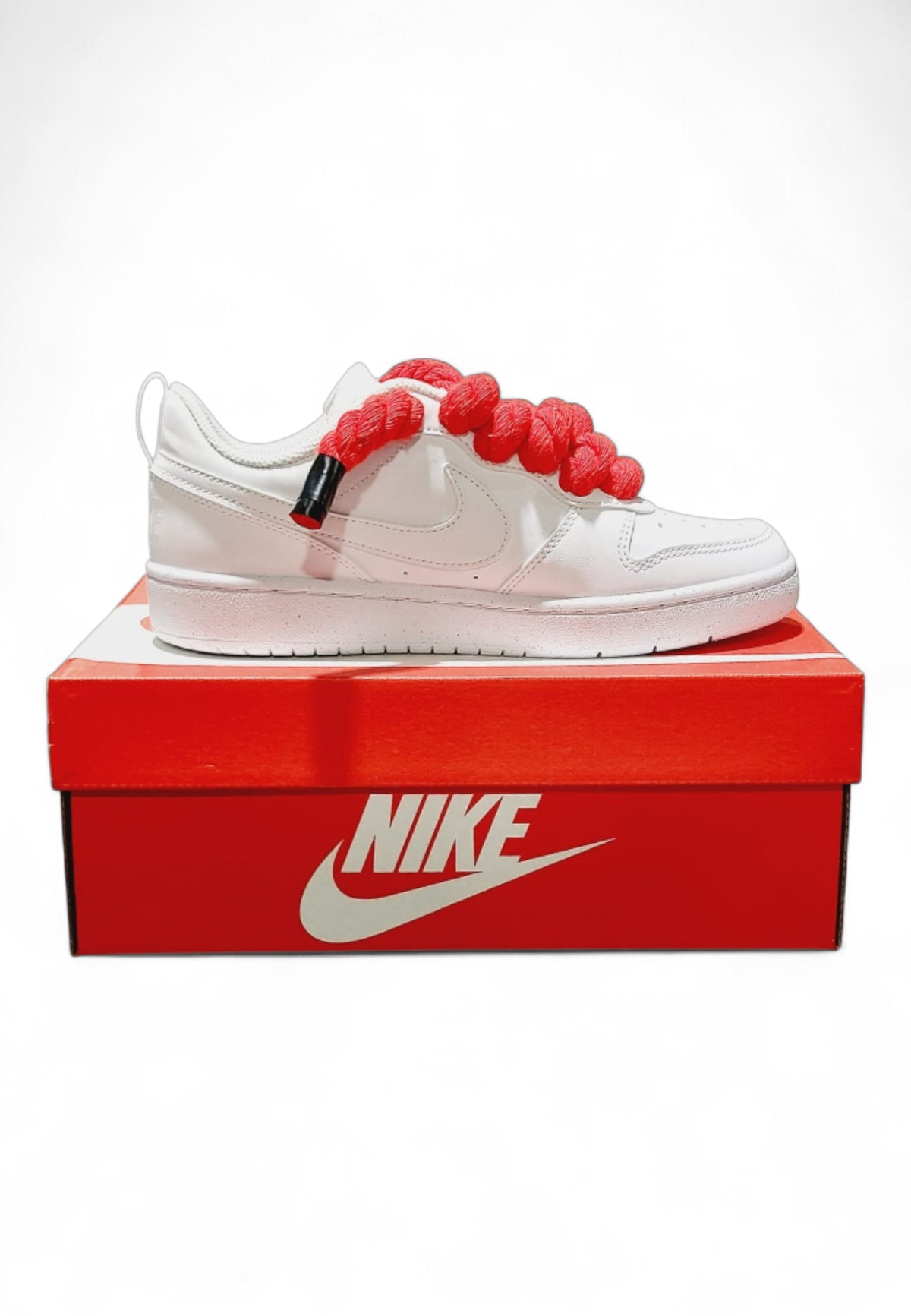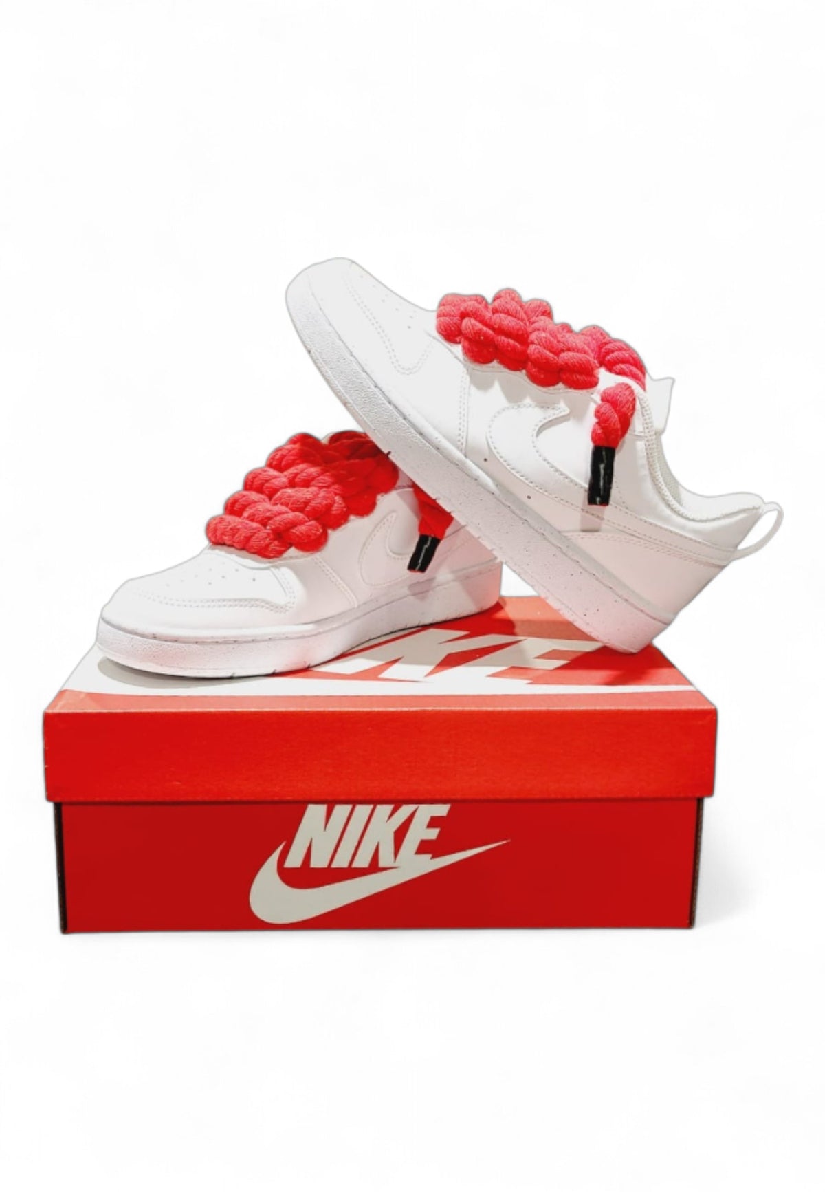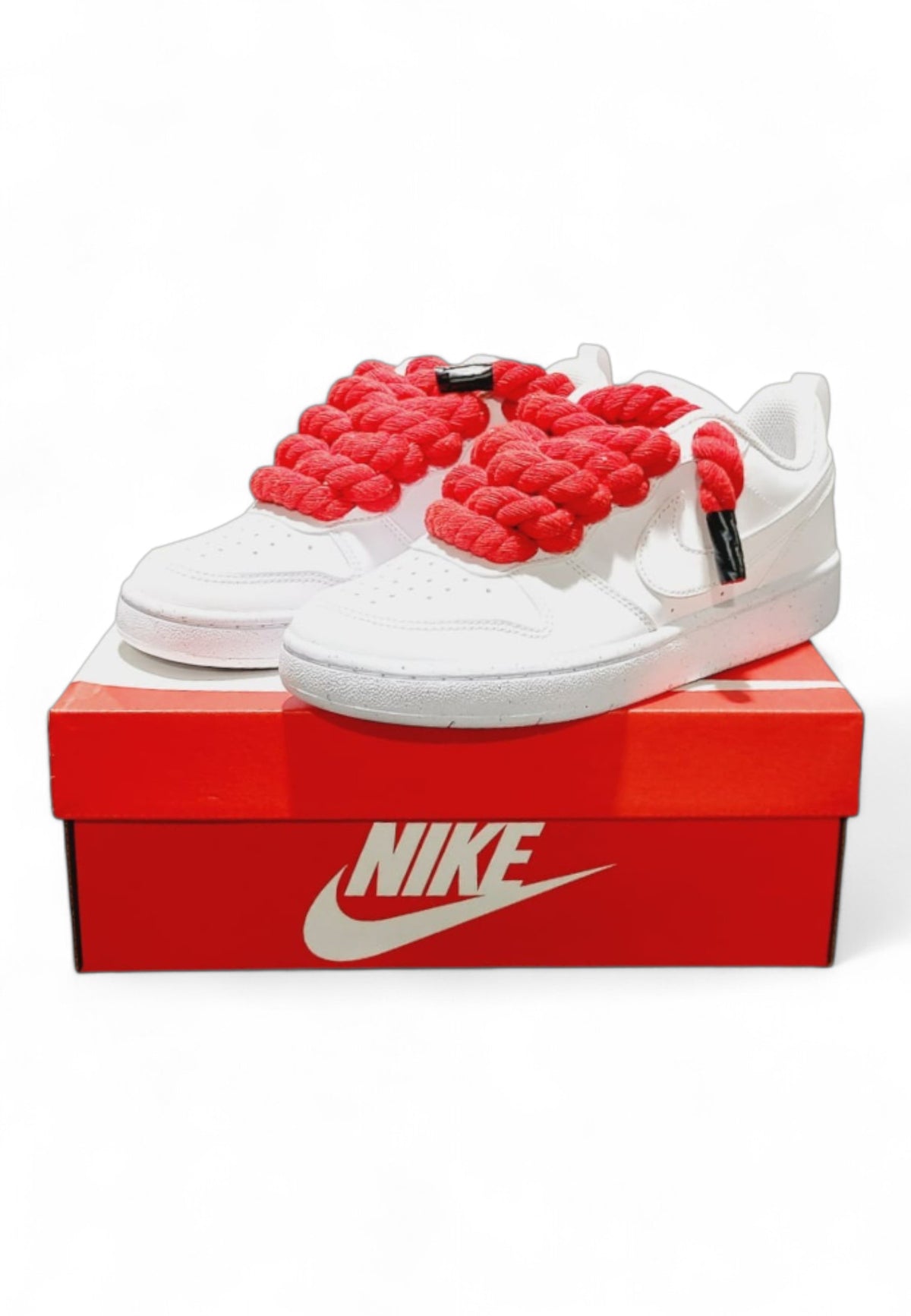 Nike Court originali customizzate professionalmente. La variante presenta lacci maxi stile corda rossi con puntali neri.