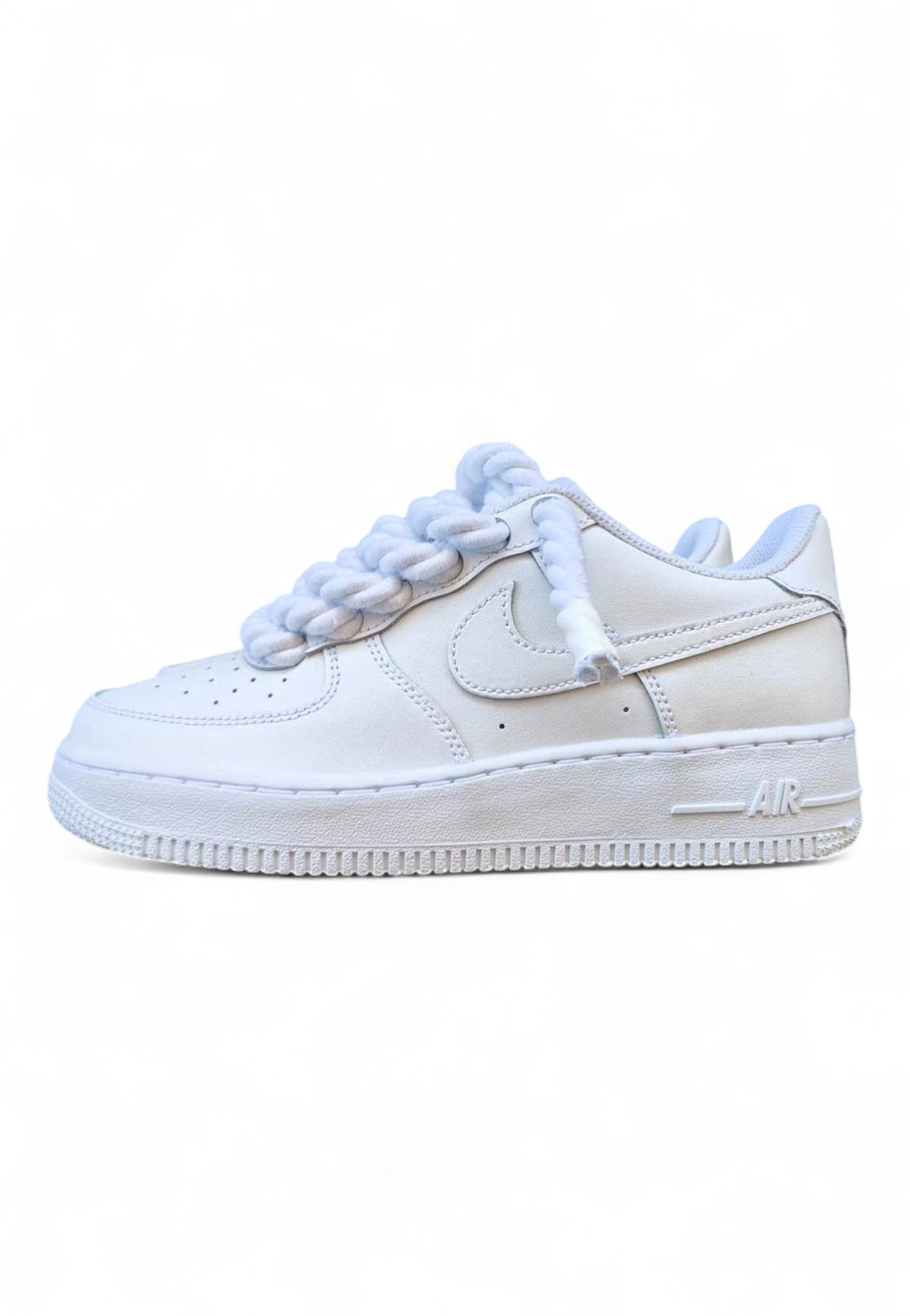 Nike Court originali customizzate professionalmente. La variante presenta lacci maxi stile corda bianchi con puntali trasparenti.