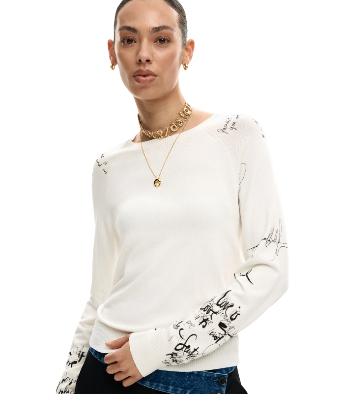 Maglione a maglia fine con polsini e fascia in costina e stampa stile lettering sulle maniche.