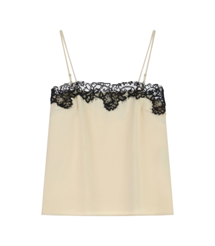 Top dal design essenziale valorizzato da sottili spalline e una raffinata applicazione di pizzo lungo la scollatura dritta.