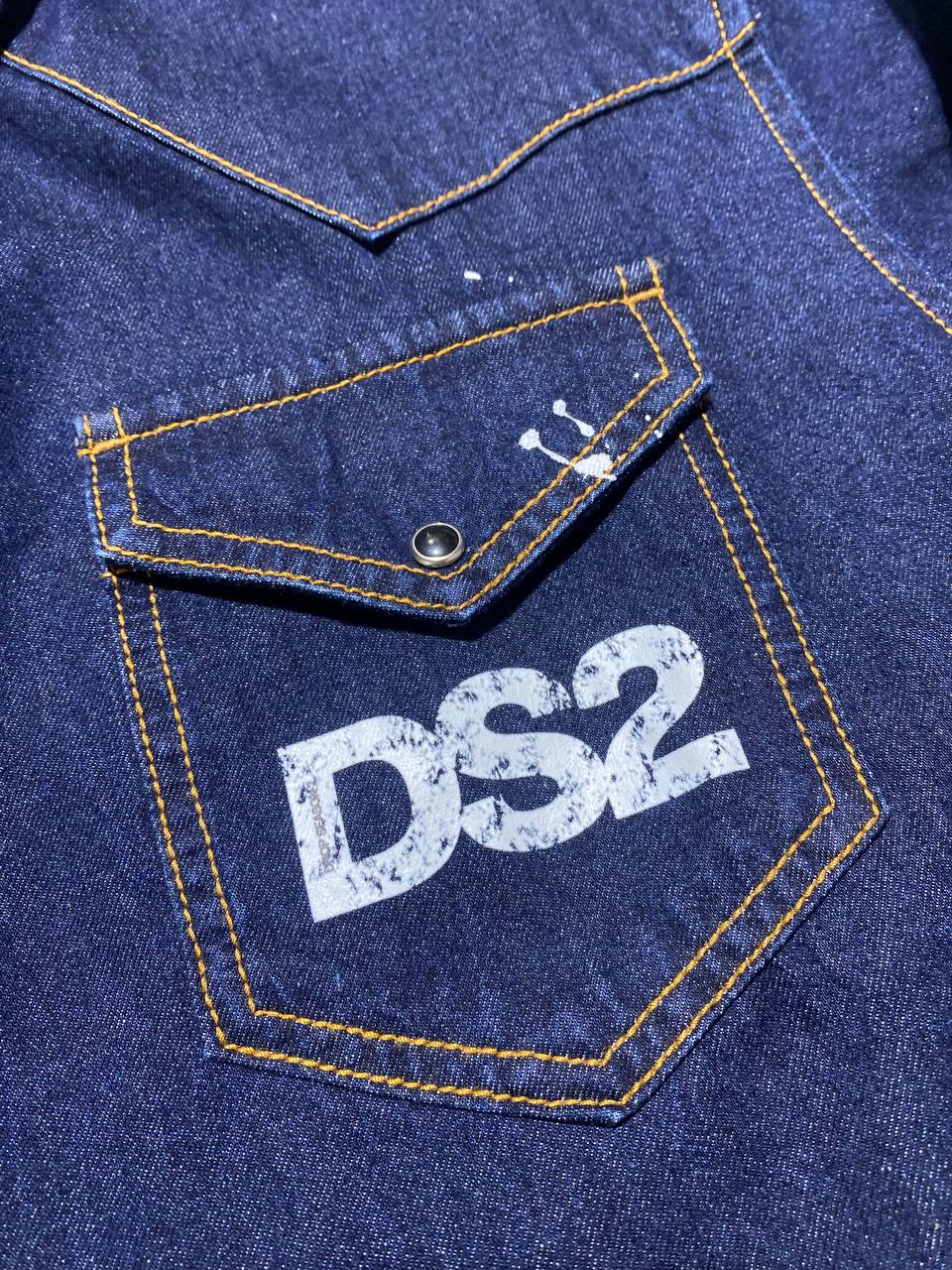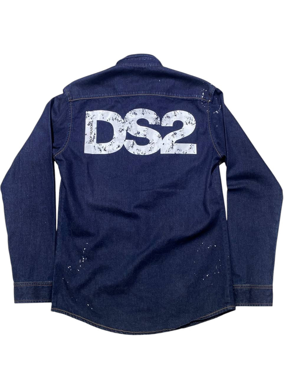 La camicia DS2, 100% cotone denim blu, è un capo di tendenza con maxi logo sulla schiena, un piccolo logo su uno dei due taschini frontali e schizzi di vernice bianca per un look unico.