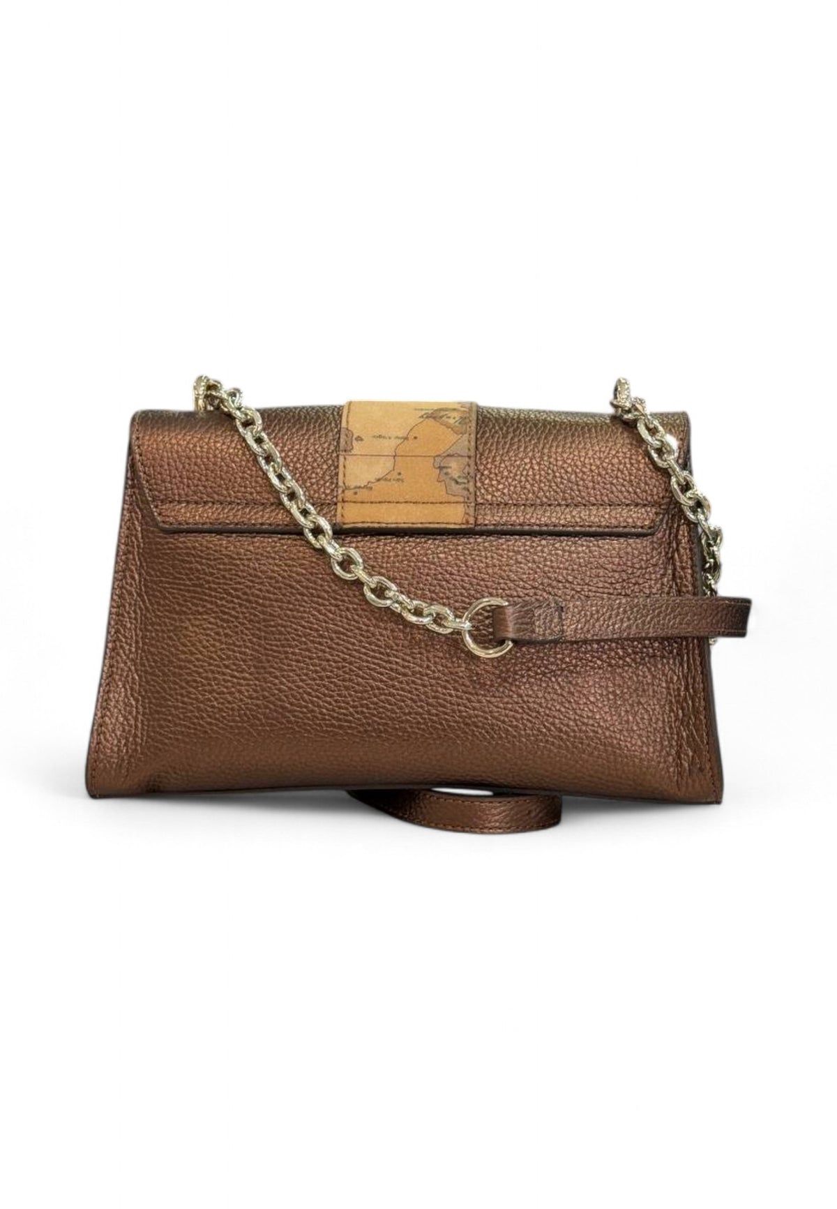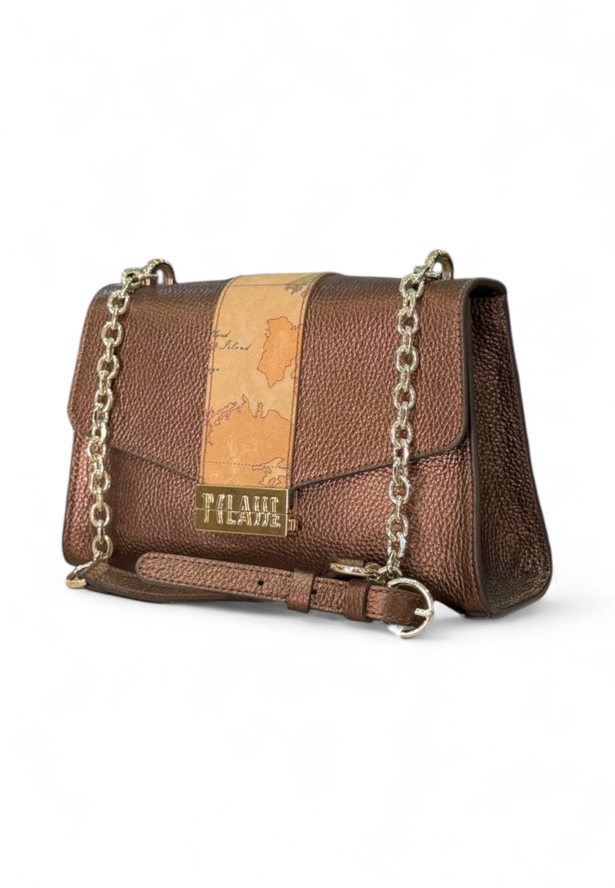 Borsa con tracolla a catena firmata Alviero Martini con doppia chiusura meccanica e doppi taschini interni.