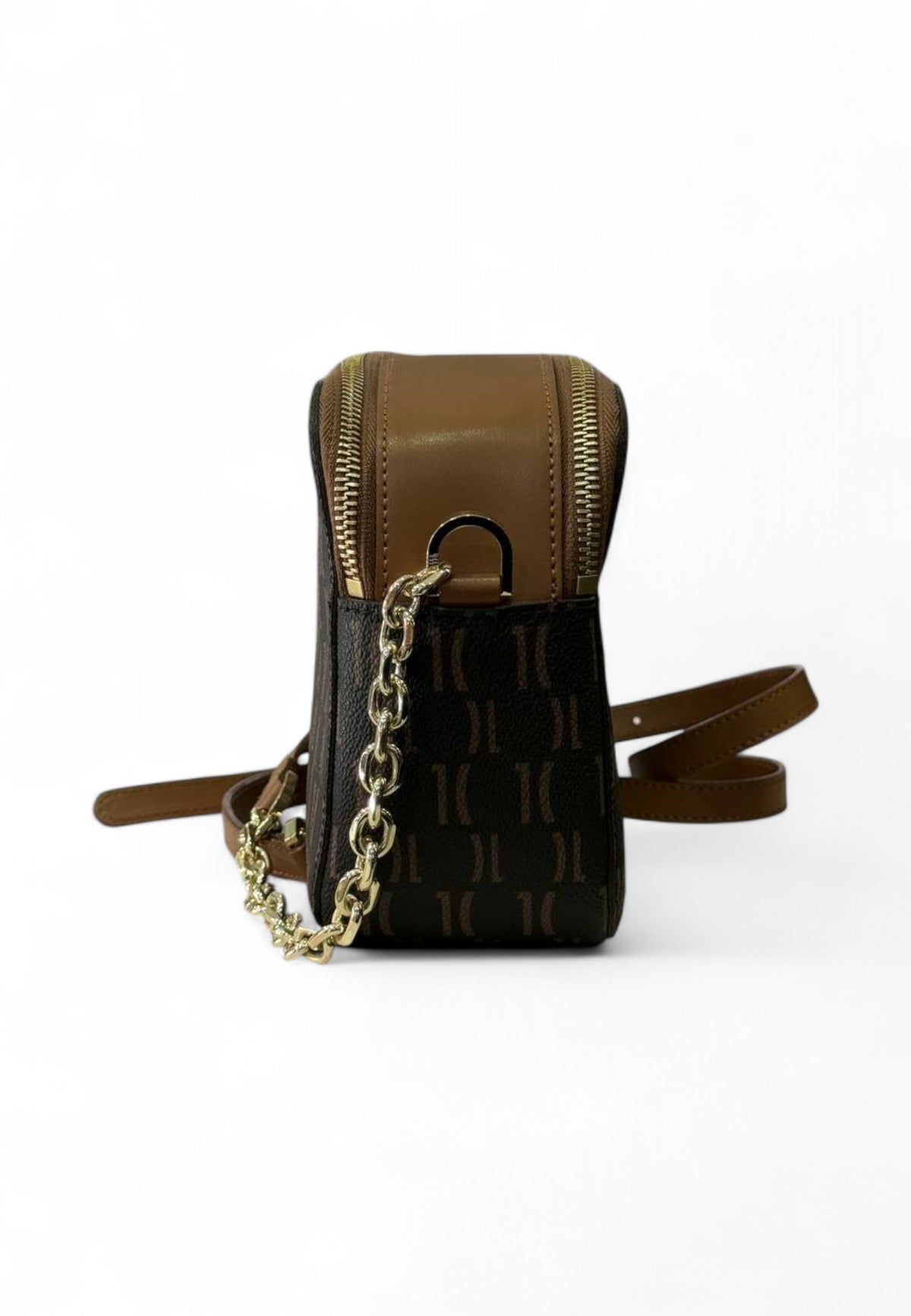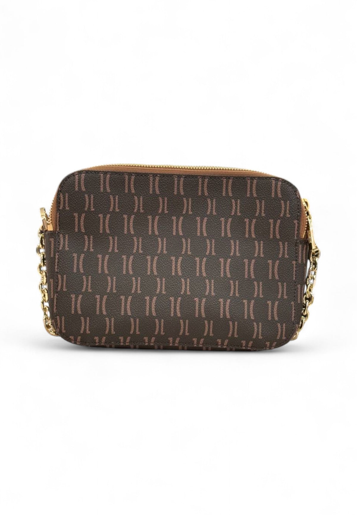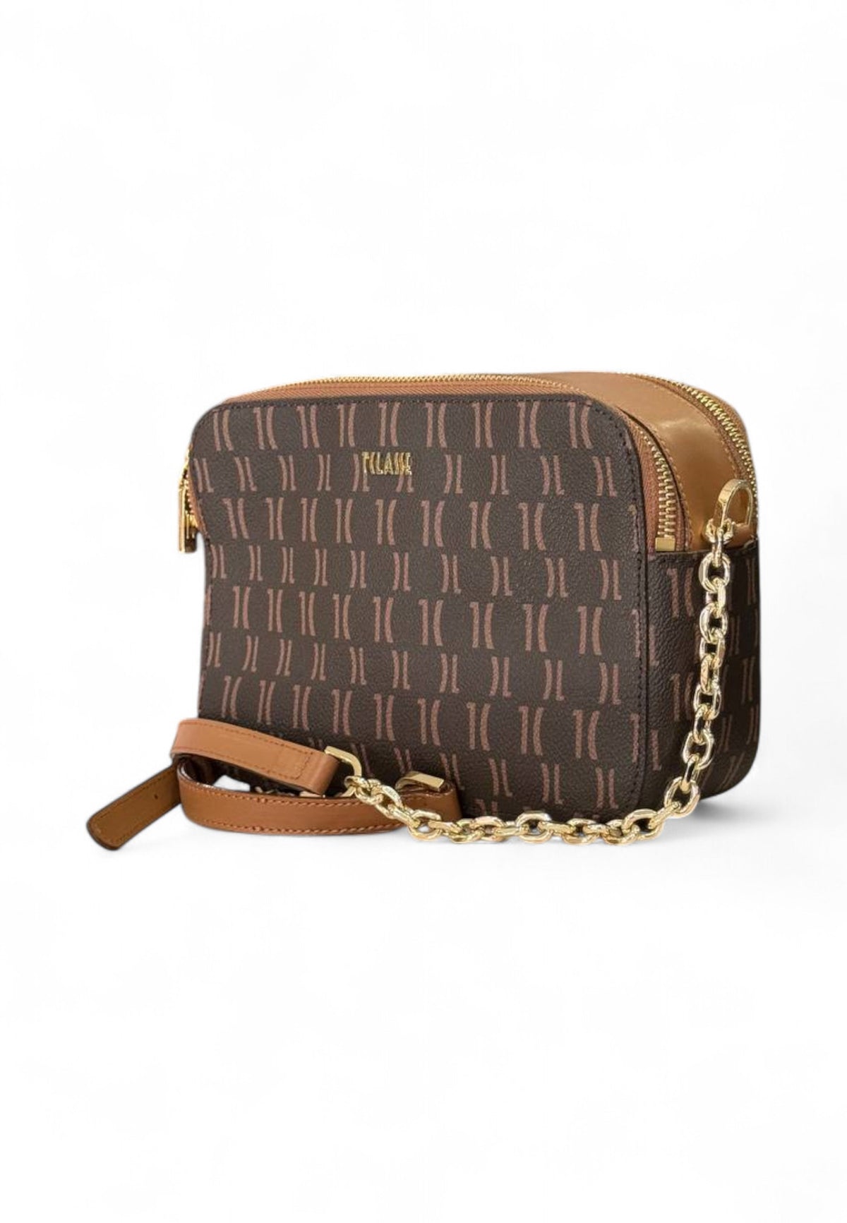 Borsa con tracolla a catena firmata Alviero Martini con doppia chiusura centrale a zip e doppi taschini interni.