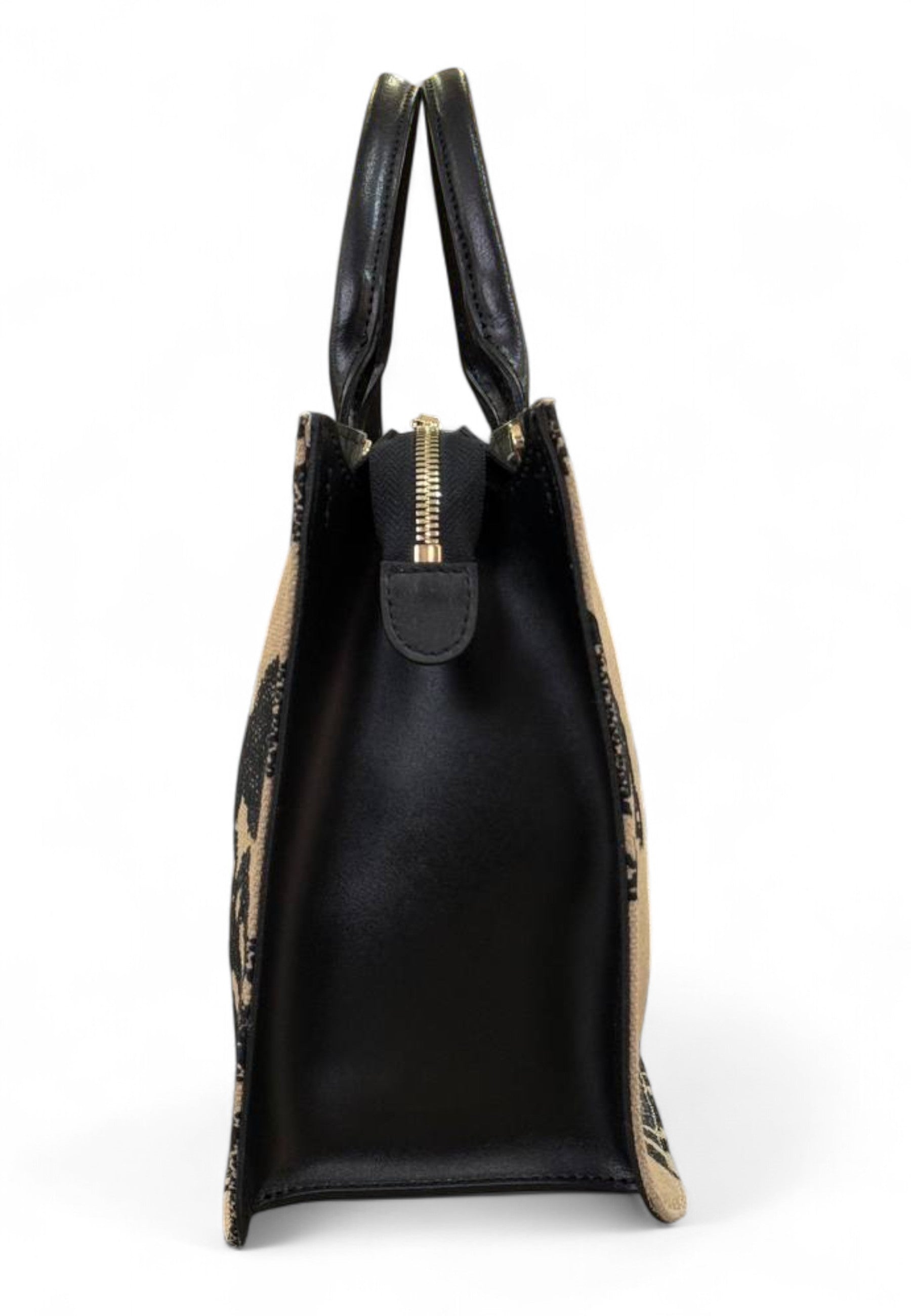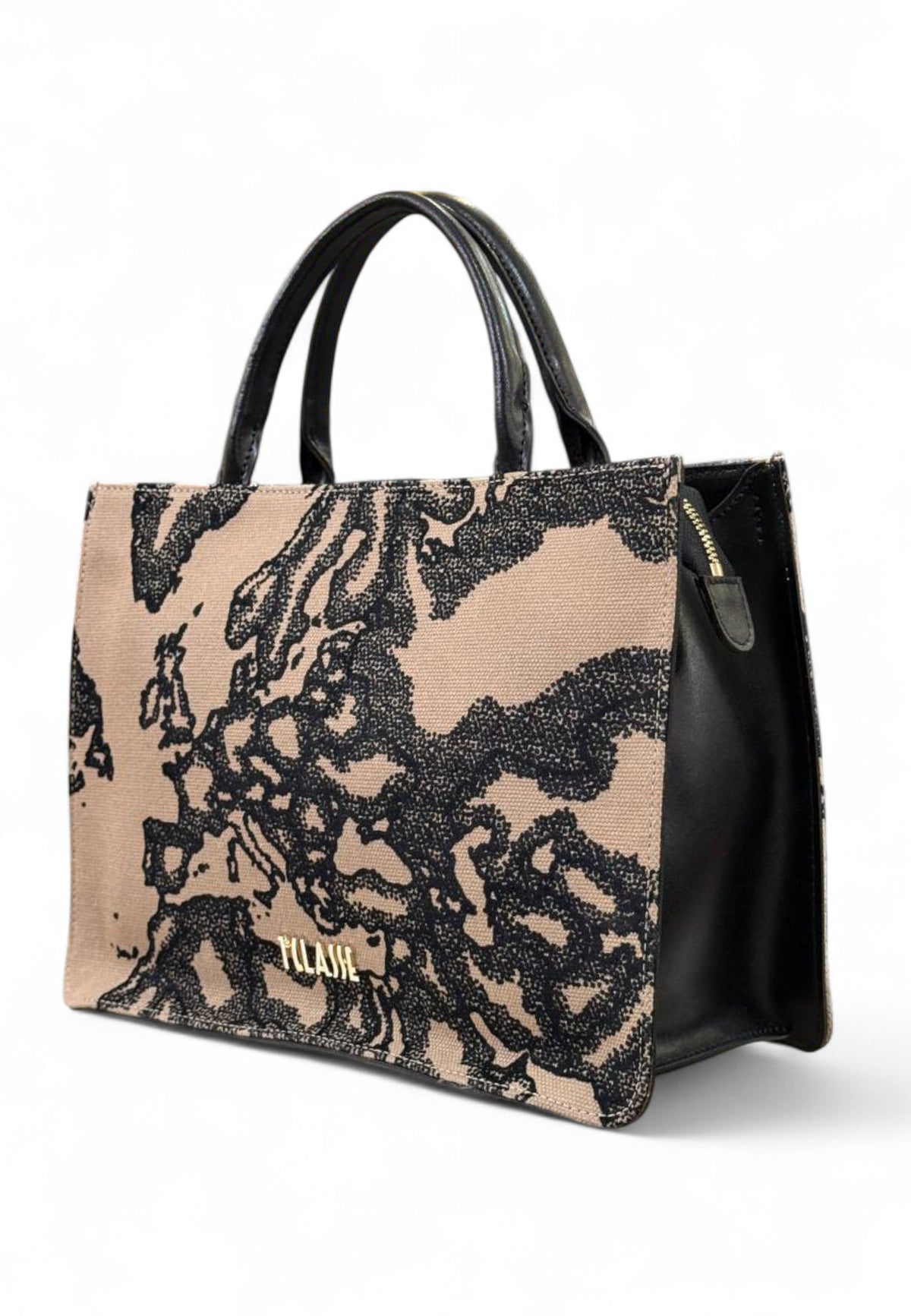 Shopping bag firmata Alviero Martini in pelle e tela con tracolla rimuovibile.