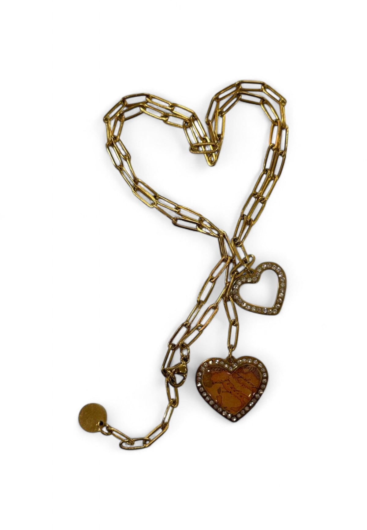 Questa raffinata collana Alviero Martini 1ᴬ Classe è un vero inno all'eleganza romantica e al viaggio. La catena vistosa e i pendenti a cuore creano un accessorio dal forte impatto visivo.