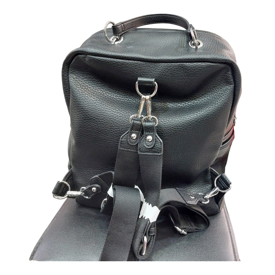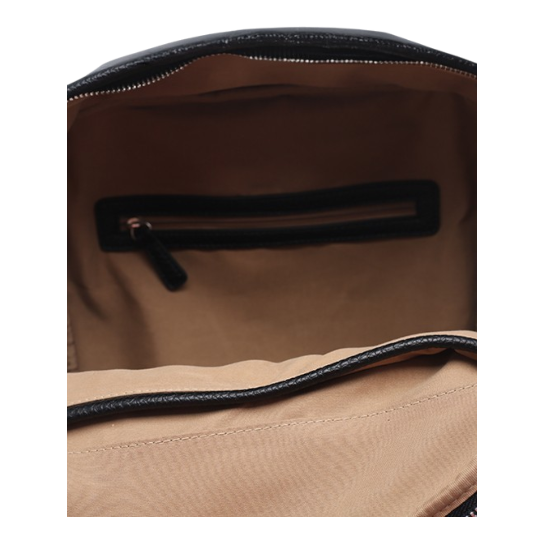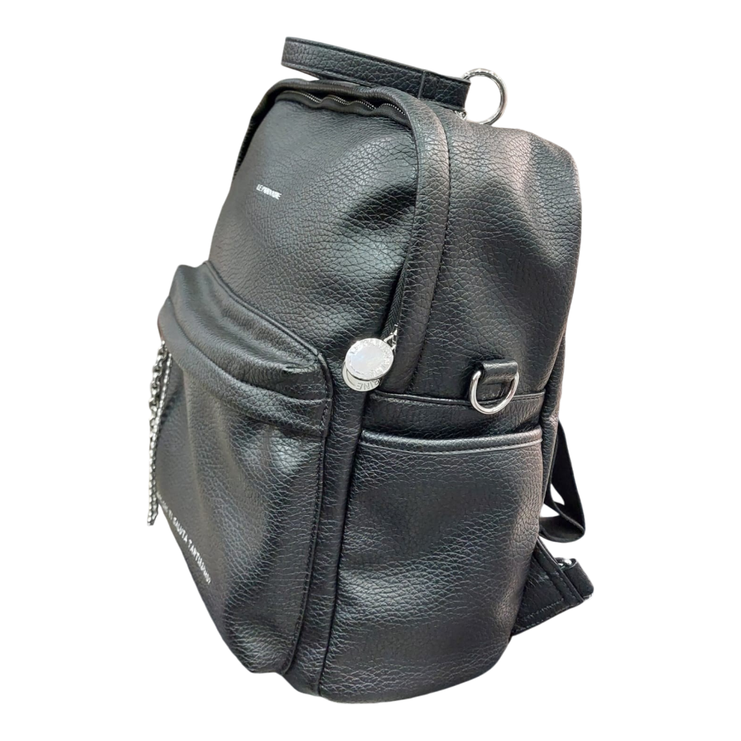 Zaino in materiale effetto martellato morbido e foderato, all’interno ha una tasca con zip e una senza, chiusura sul fronte con cerniera. Manico e spallacci staccabili che possono essere utilizzati anche come tracolla. Sul fronte ha un’ampia tasca con claim stampato.