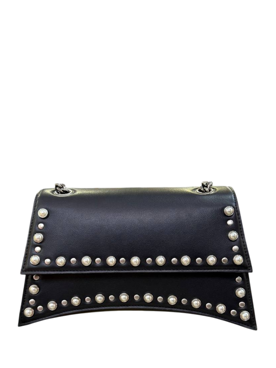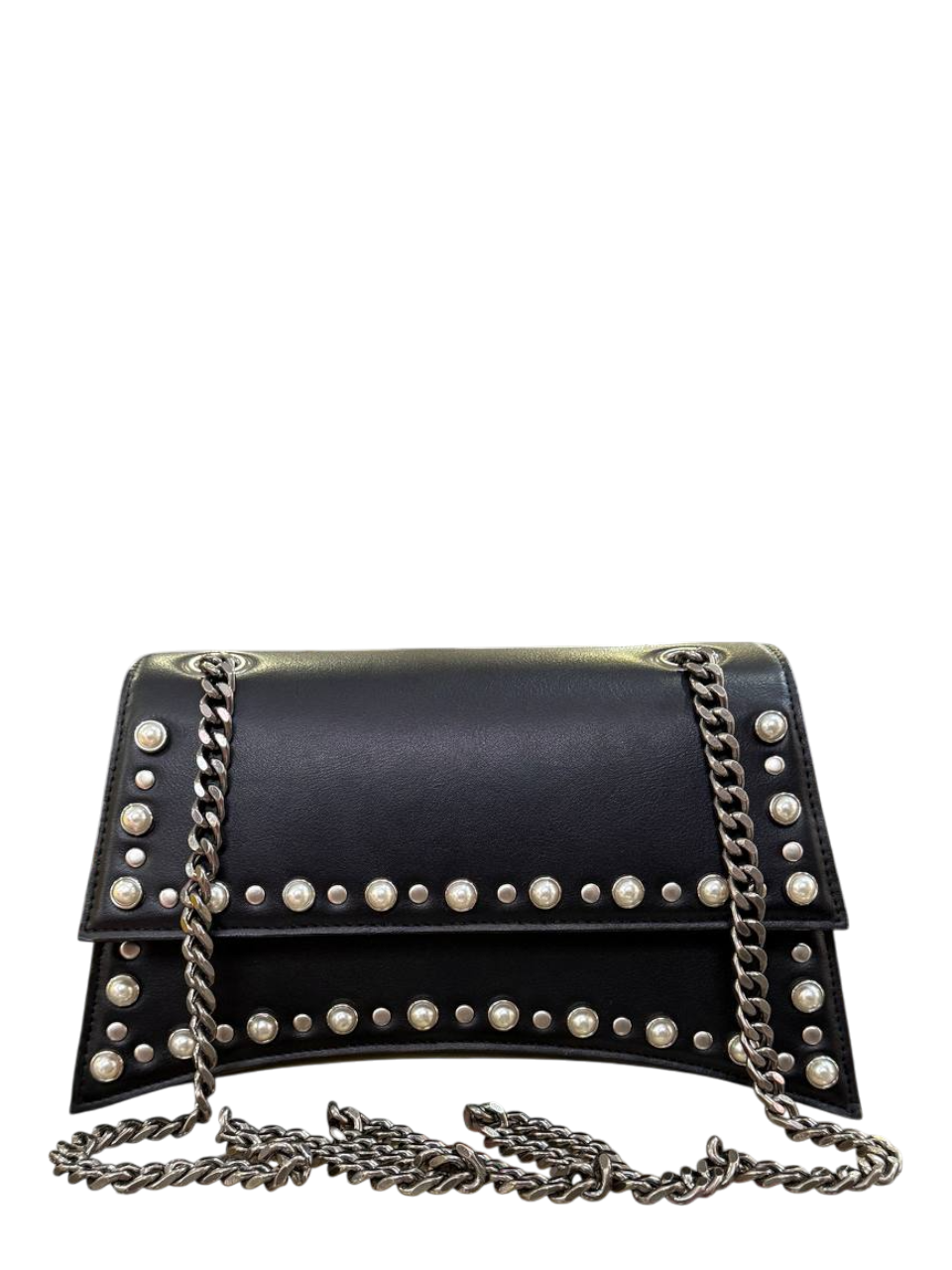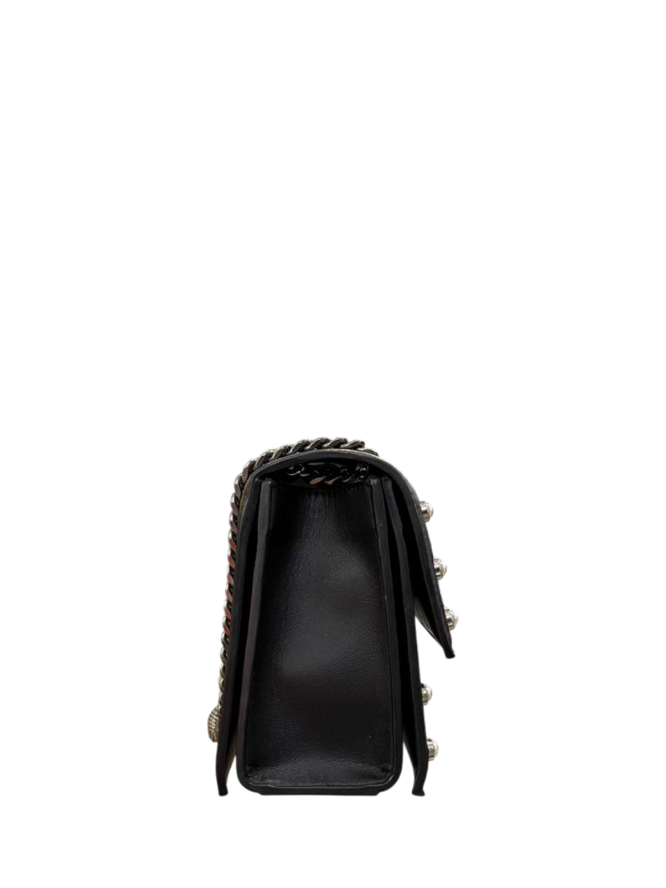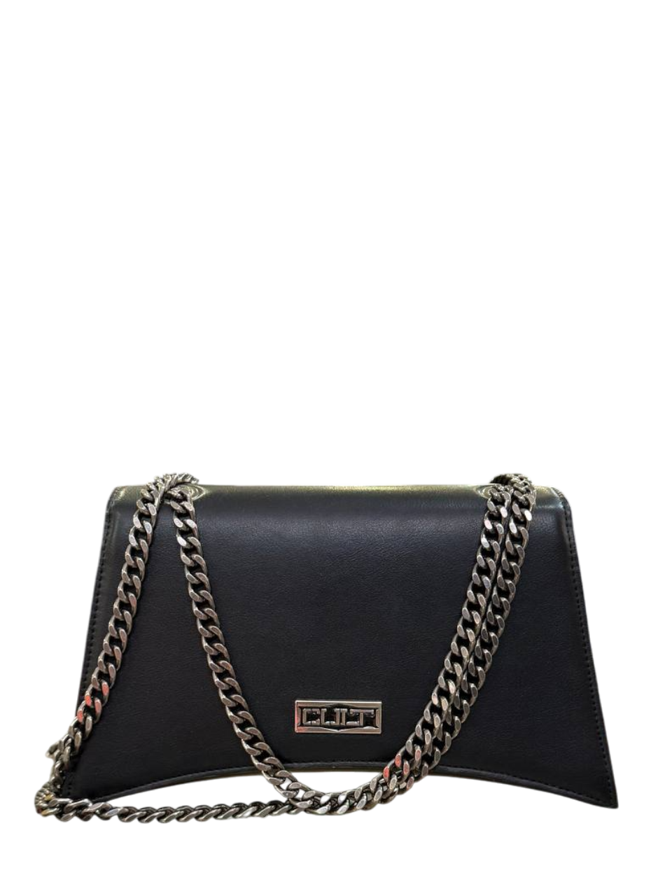 Borsa firmata CULT in ecopelle con chiusura magnetica, due scomparti interni, taschino con chiusura a zip e tracolla a catena.