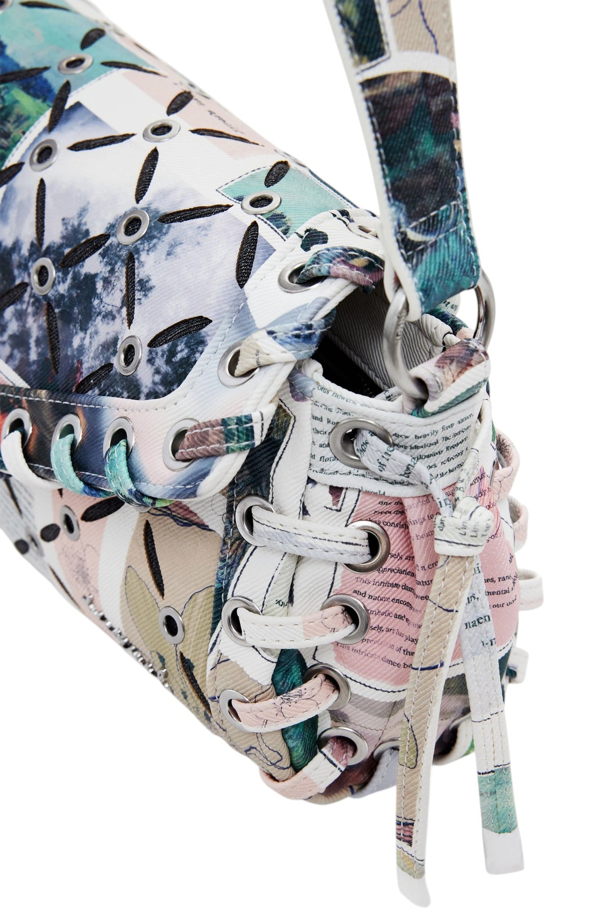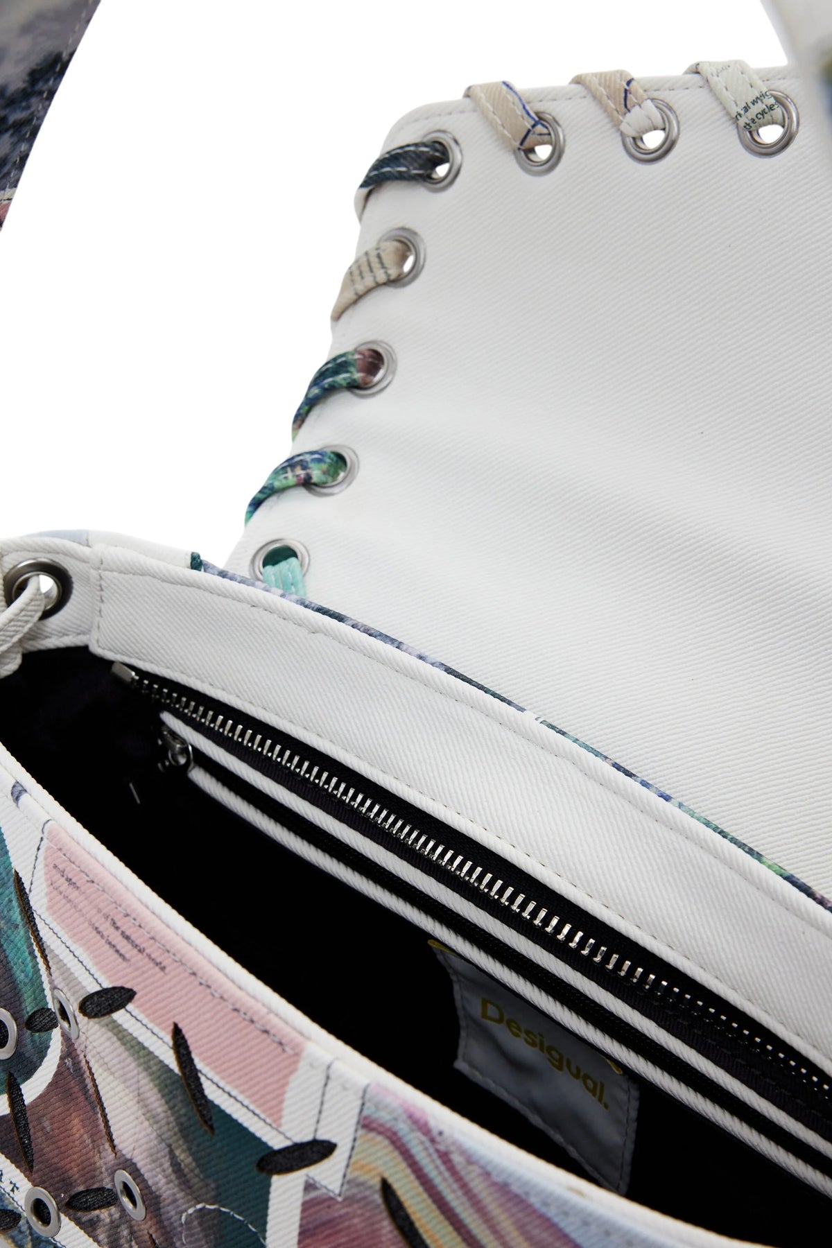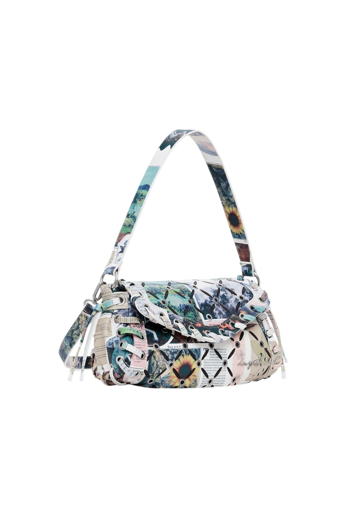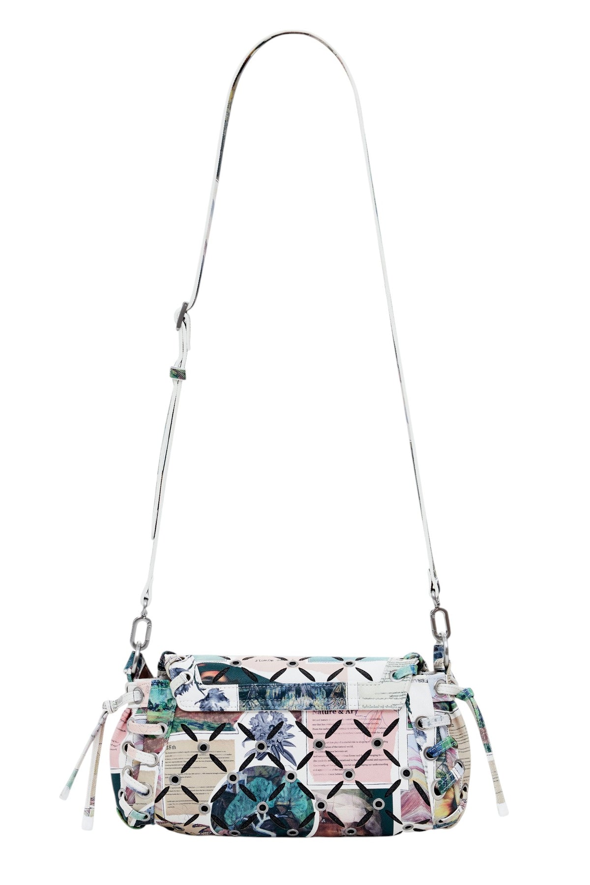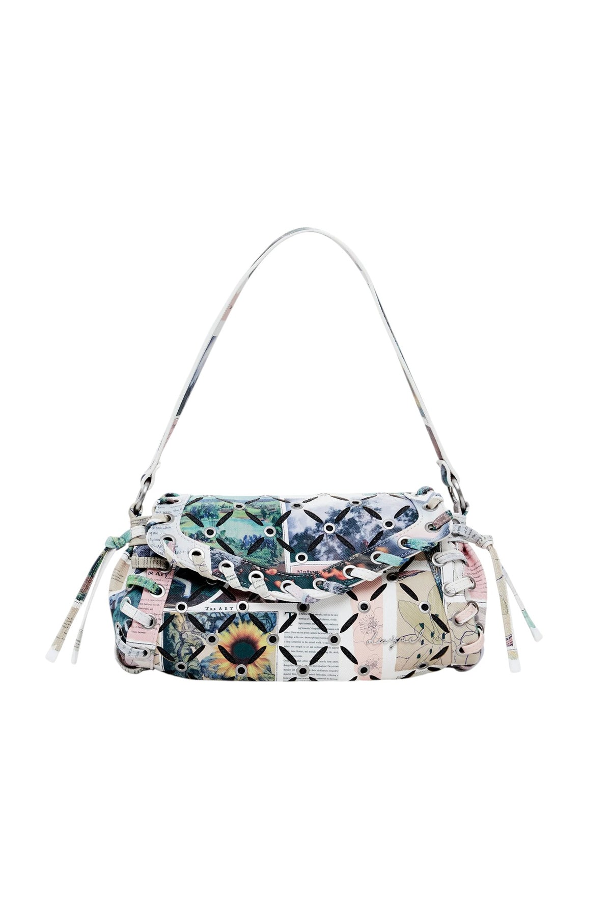 Borsa piccola, con patta magnetica, manici intercambiabili e stampa stile giornale con frammenti di testi e immagini.