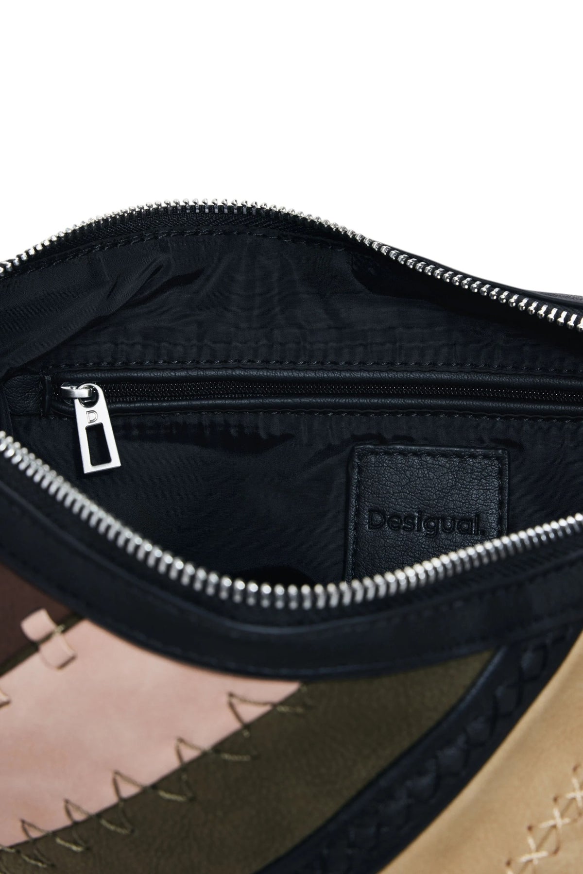 Borsa a tracolla di medie dimensioni, con diversi tessuti effetto pelle tipo patchwork, manici intercambiabili e chiusura con cerniera.