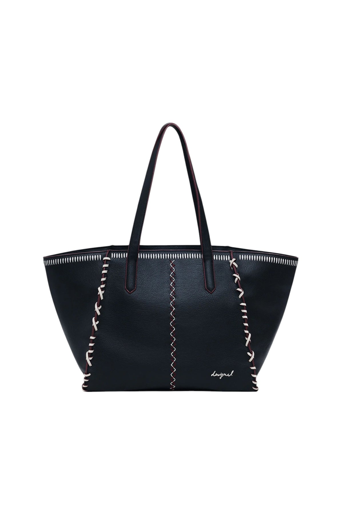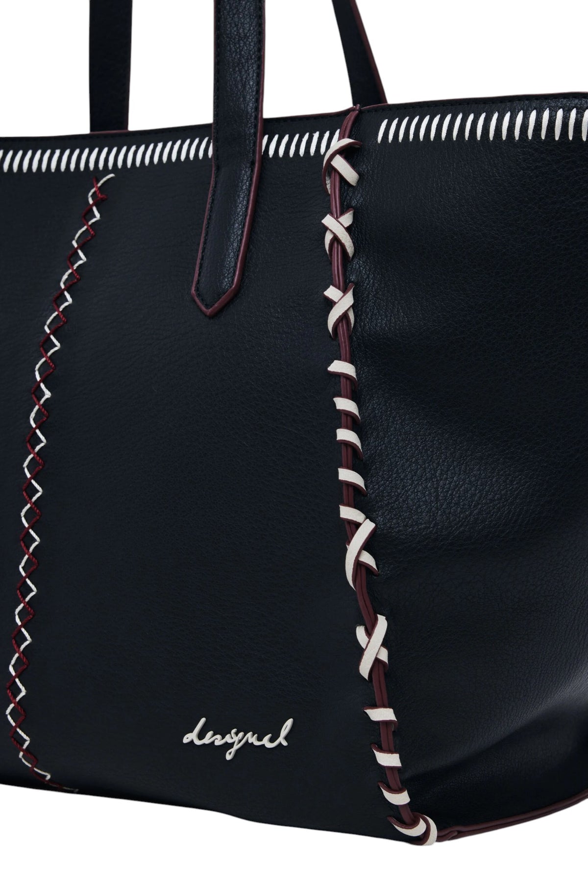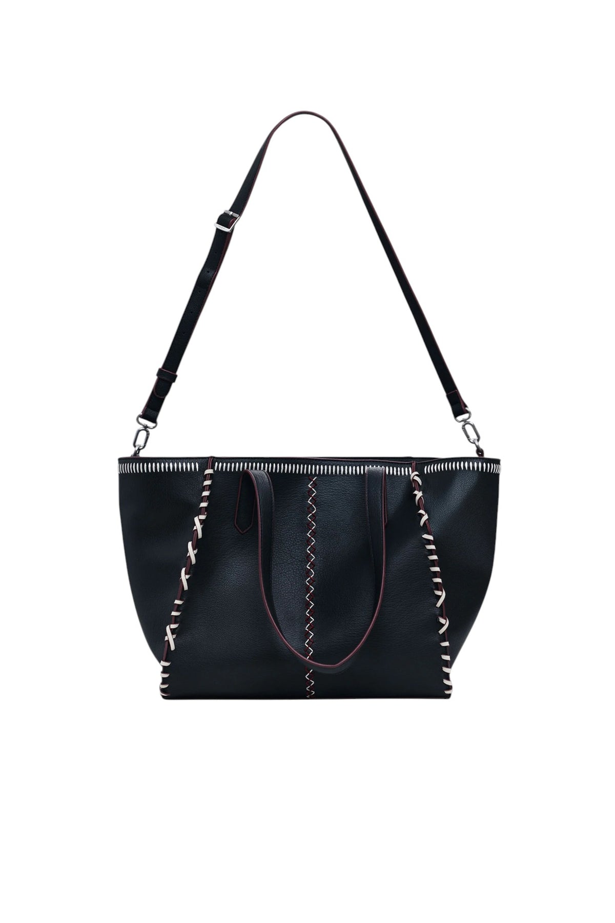 Borsa stile shopper in tessuto effetto pelle, di grande capacità, con tracolla removibile e chiusura con cerniera, con dettaglio di cuciture e ricami decorativi.