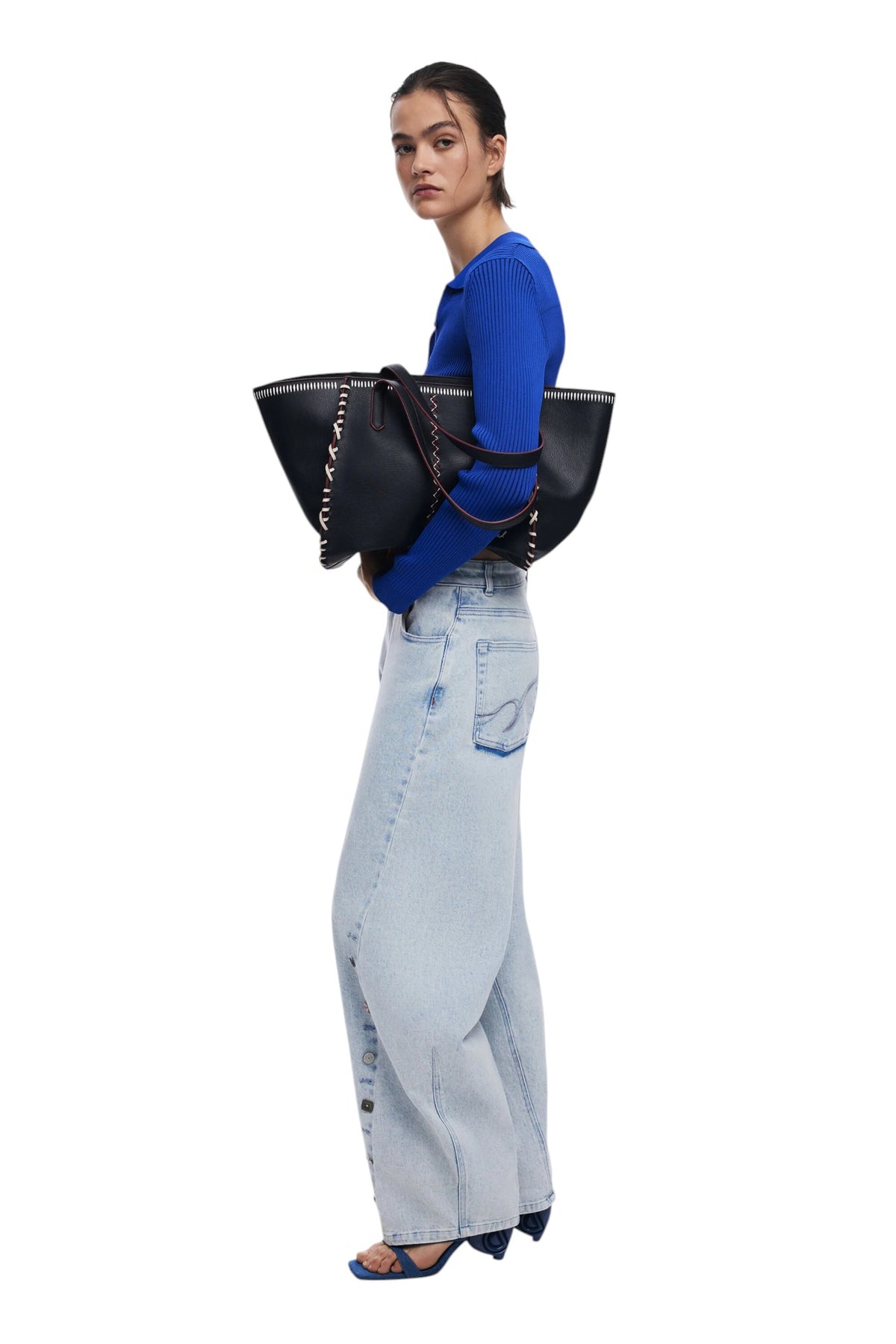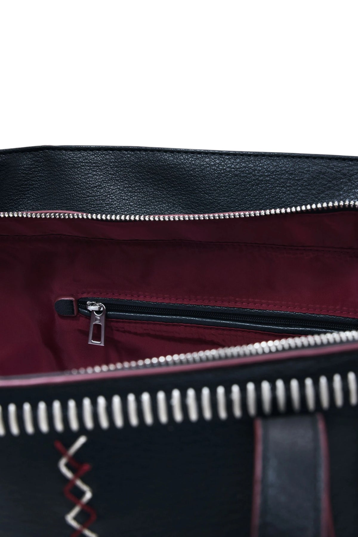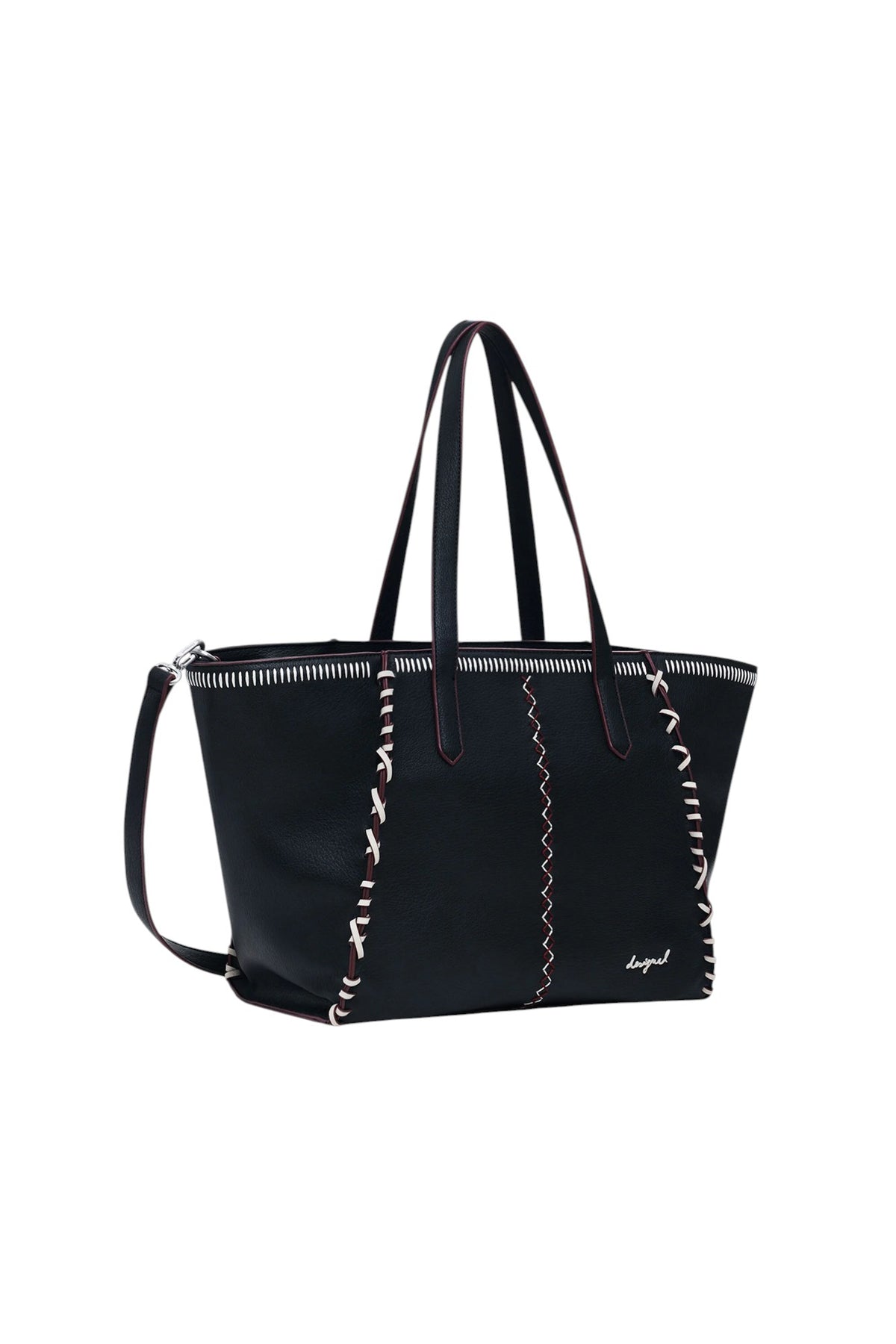 Borsa stile shopper in tessuto effetto pelle, di grande capacità, con tracolla removibile e chiusura con cerniera, con dettaglio di cuciture e ricami decorativi.